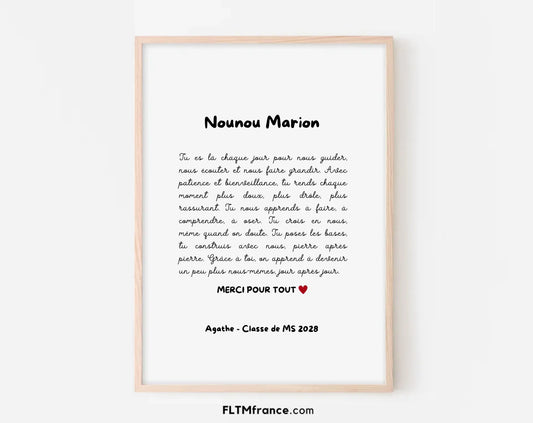 Une nounou, c’est bien plus qu’une personne qui garde ton enfant : c’est une présence rassurante, un soutien du quotidien, une complice de jeux et de rires. Offrir un cadeau à sa nounou, c’est lui dire merci pour tout son temps, son implication et sa bienveillance, que ce soit pour un départ, Noël, un anniversaire ou tout simplement pour faire plaisir. Chez FLTM, on adore t’inspirer avec des idées cadeaux personnalisés et pleines de sens pour ta nounou, faciles à offrir et toujours marquées par une touche personnelle. Une affiche souvenir, une carte à imprimer, une étiquette délicate : autant de petits détails qui transforment un simple cadeau en un souvenir mémorable, pour elle comme pour ton enfant.