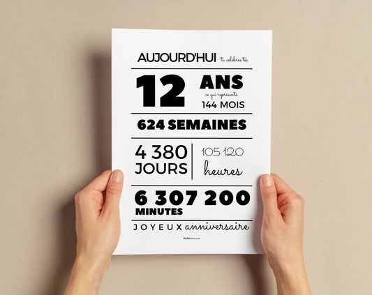 Affiche 12 ans, 144 mois, 624 semaines - Carte anniversaire enfant