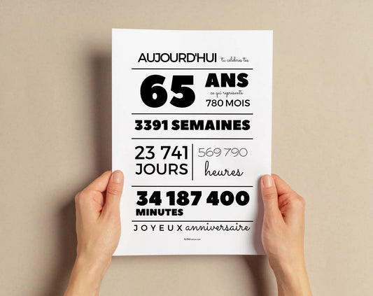 Affiche 65 ans, 780 mois, 3391 semaines - Carte anniversaire