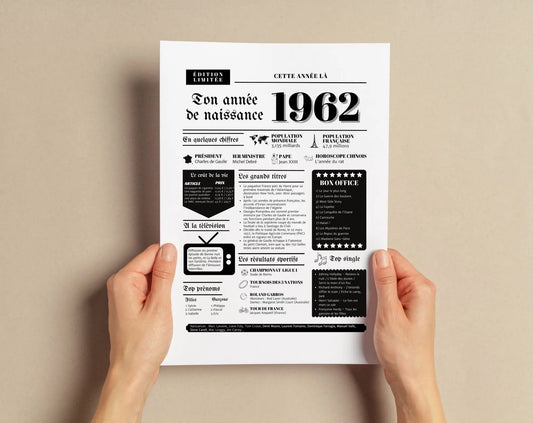 Affiche année de naissance 1962 - Cadeau anniversaire 63 ans
