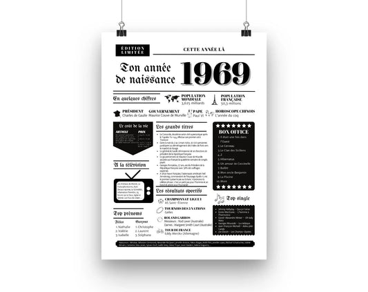 Affiche année de naissance 1969 - Cadeau anniversaire 56 ans