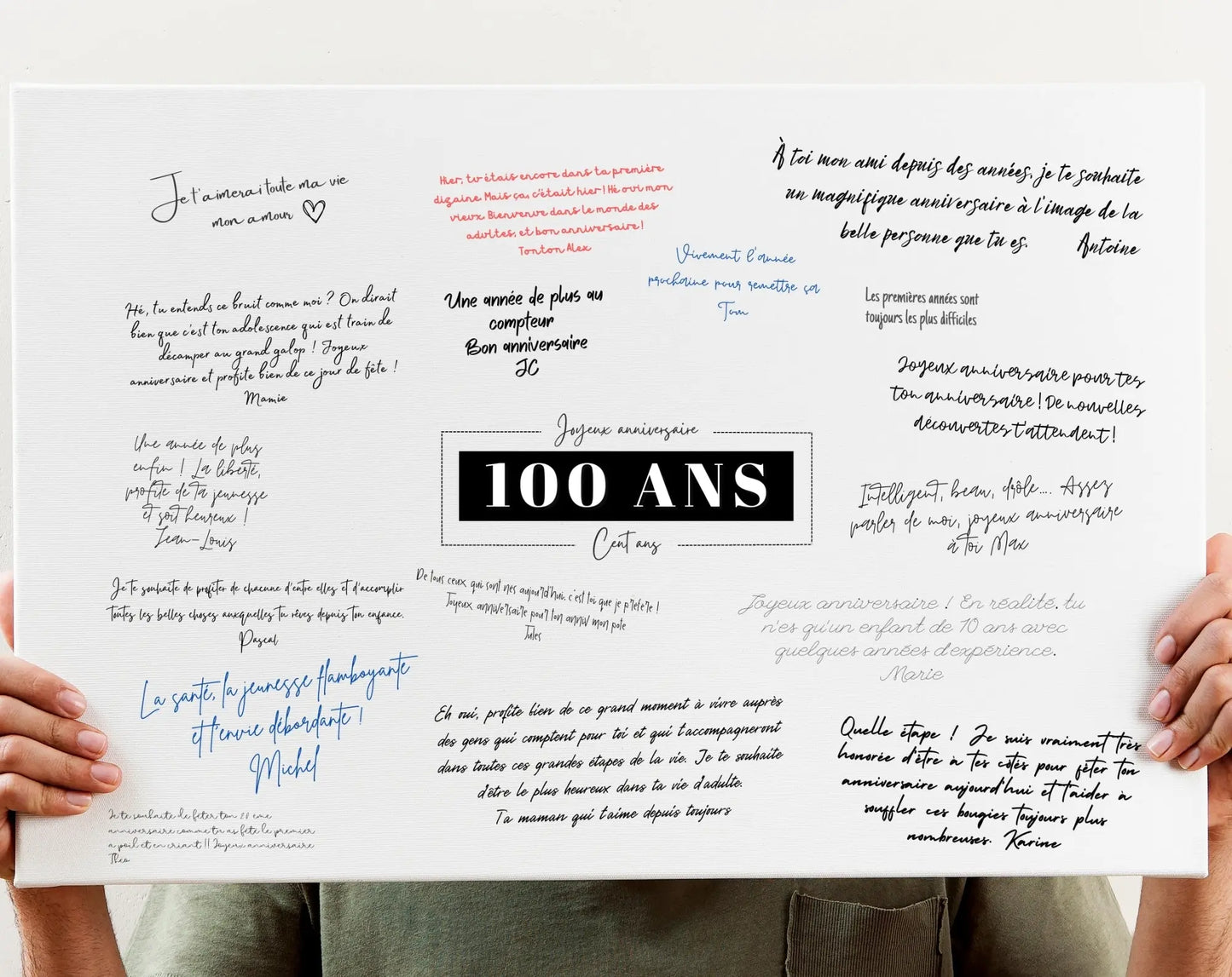 Vous cherchez un moyen unique et mémorable de célébrer un événement important ? notre livre d'or 100 ans - affiche à imprimer est la solution parfaite. que ce soit pour un anniversaire marquant, un diplôme, un mariage ou une retraite, cette affiche numérique personnalisable offre une manière élégante et interactive de capturer les souvenirs et les messages des invités. téléchargeable instantanément, elle est idéale pour ceux qui souhaitent une touche personnelle et facile à préparer pour leur célébration.