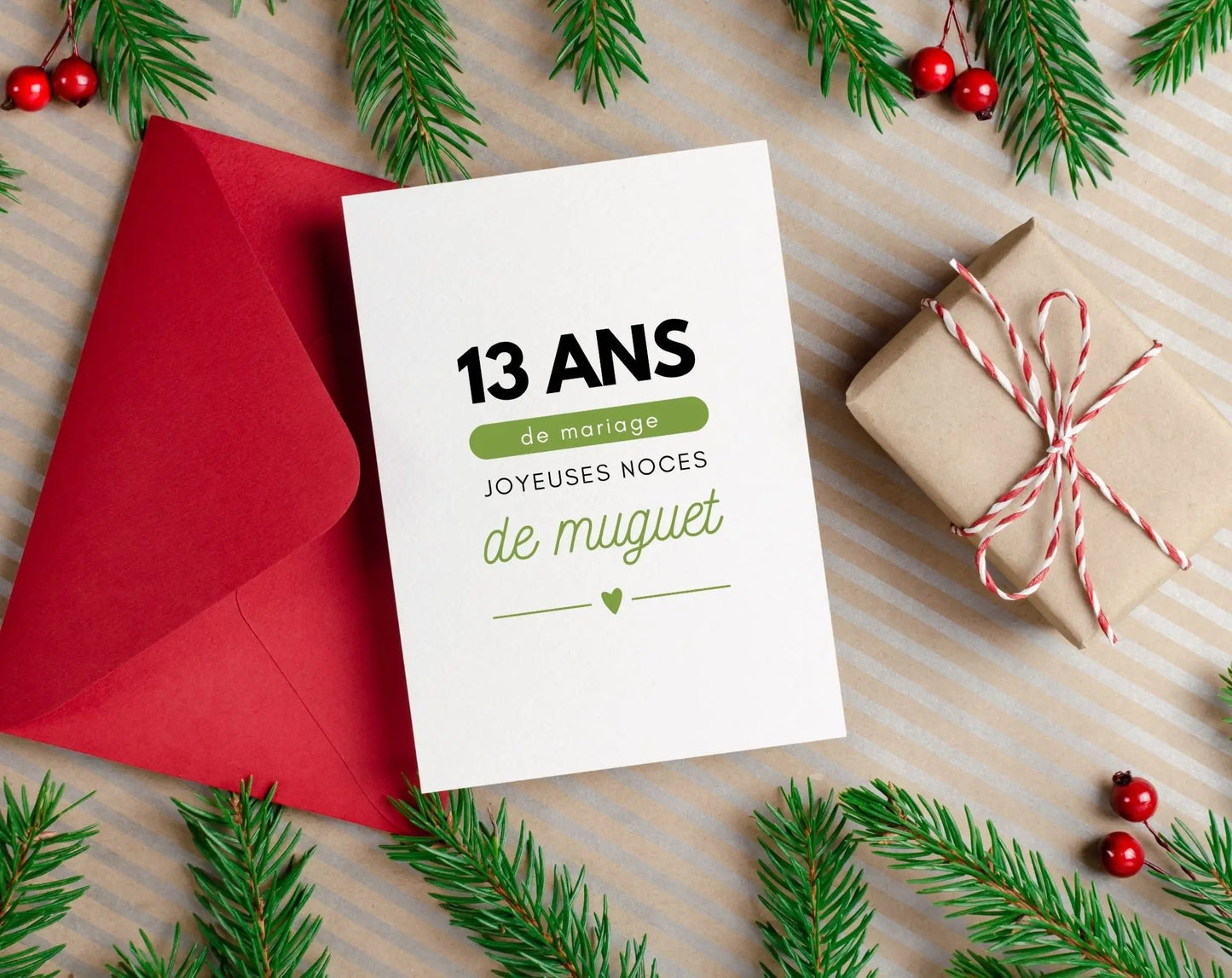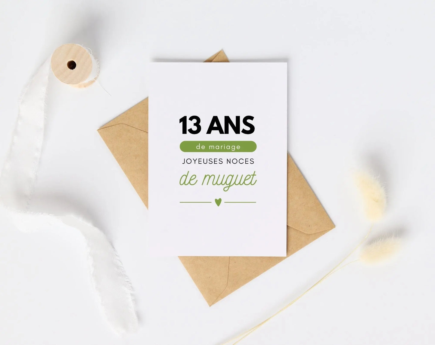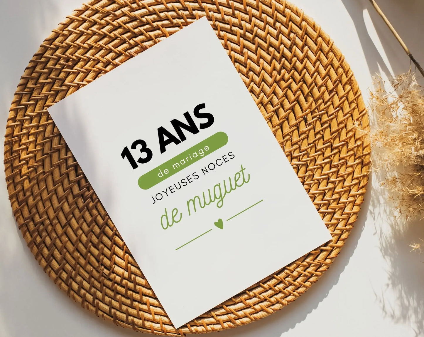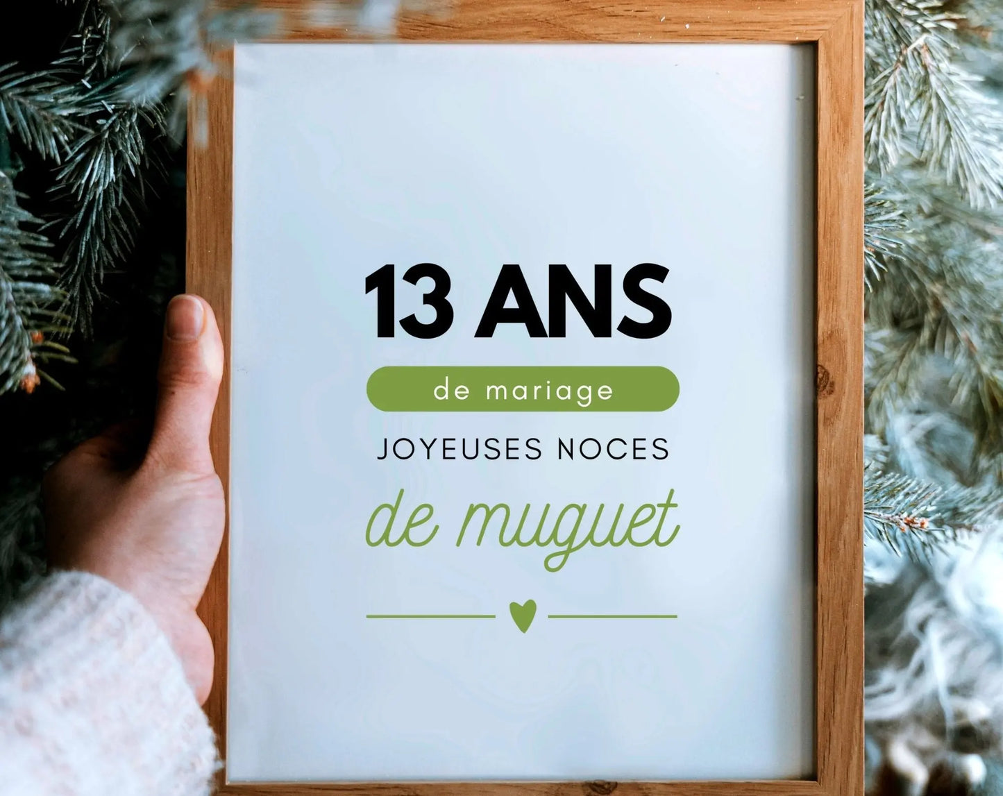 ✔️ L’inscription « Joyeuses Noces de muguet – 13 ans de mariage », élégamment intégrée.