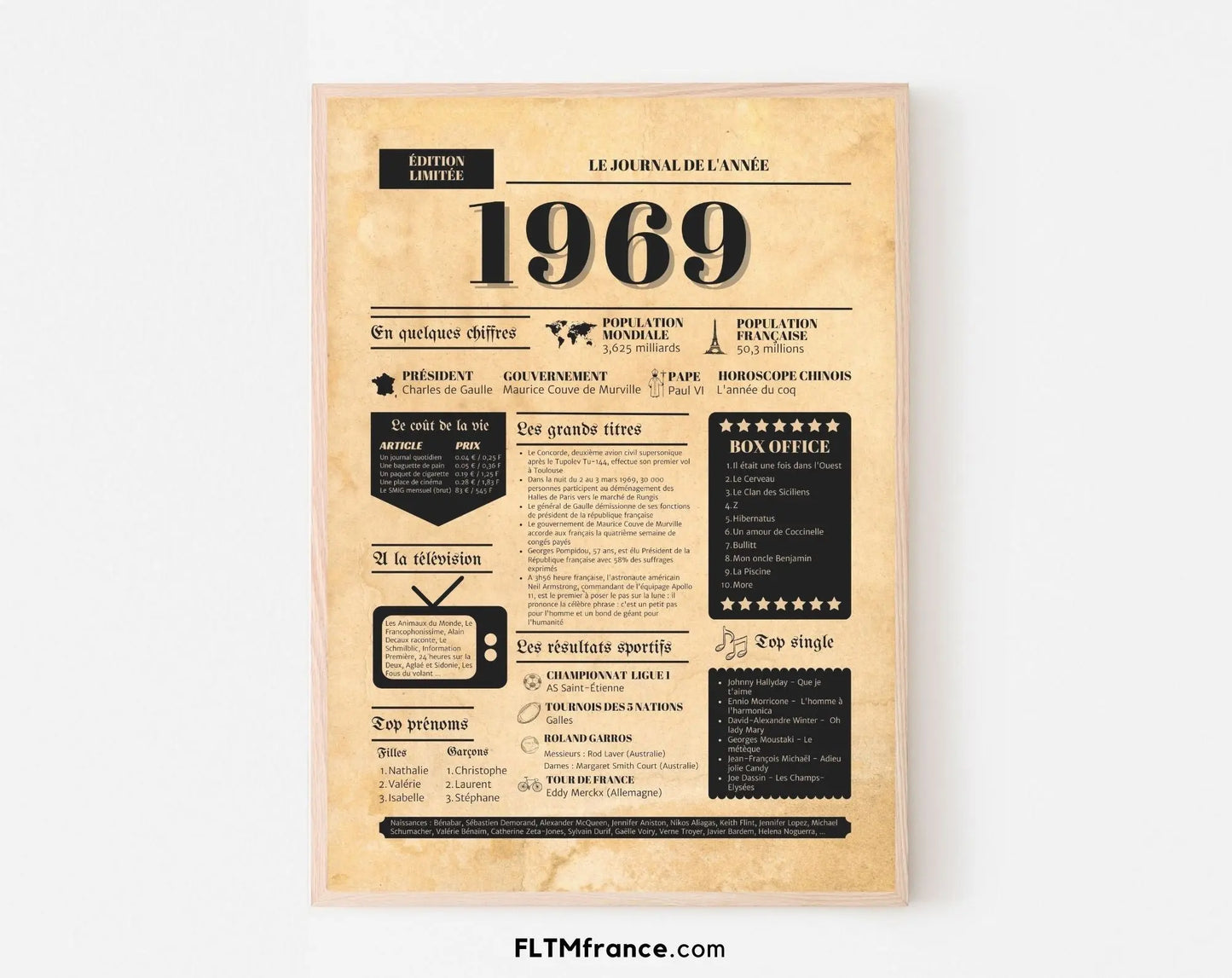 En somme, le journal de l'année 1969 est plus qu'un simple cadeau; c'est une expérience immersive qui relie le passé et le présent. Que ce soit pour un anniversaire, une occasion spéciale, ou simplement pour enrichir votre collection personnelle, notre affiche numérique vous offre une fenêtre unique sur une année qui a marqué l'histoire. N'attendez plus pour offrir ou vous offrir ce voyage captivant dans le temps.