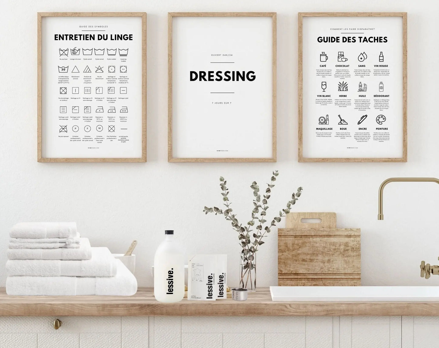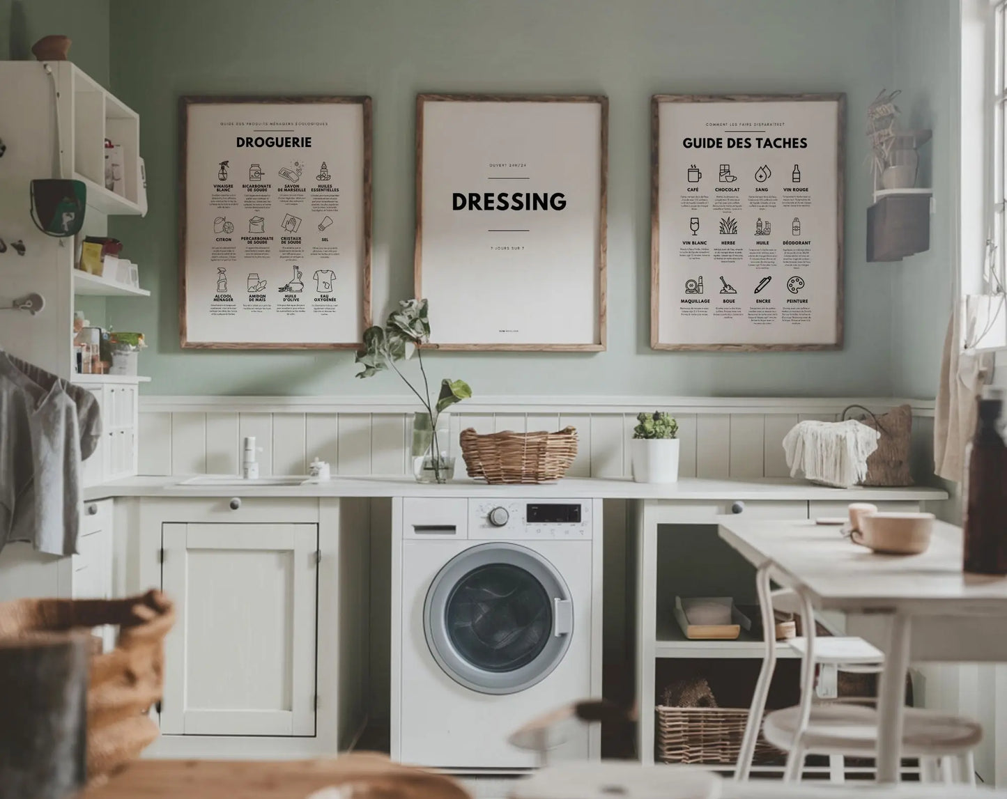 Apporte une touche d’organisation (et de style !) à ta buanderie avec ce lot de 3 affiches à imprimer. Un trio parfait pour allier déco minimaliste et infos utiles au quotidien. Tu vas adorer afficher fièrement ces posters dans ton espace linge, près du lave-linge ou du dressing.