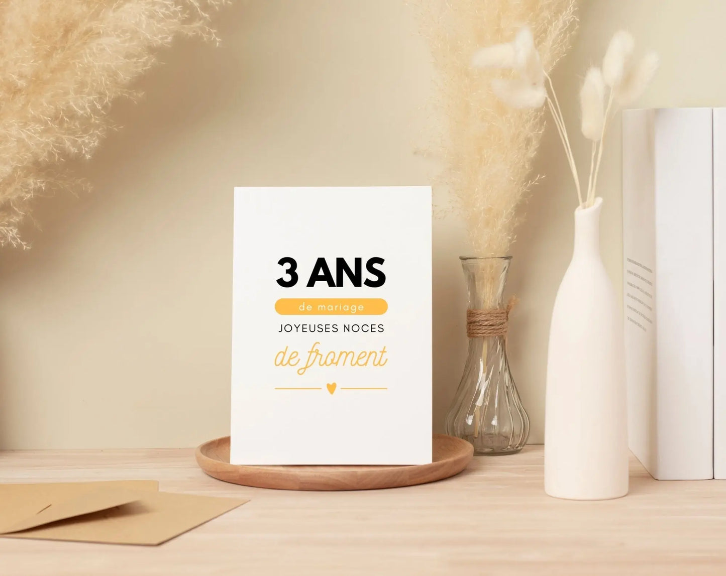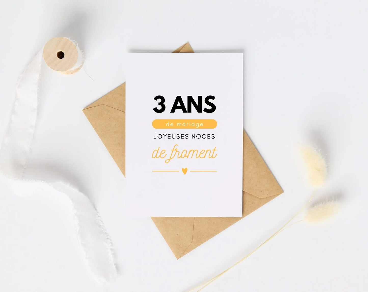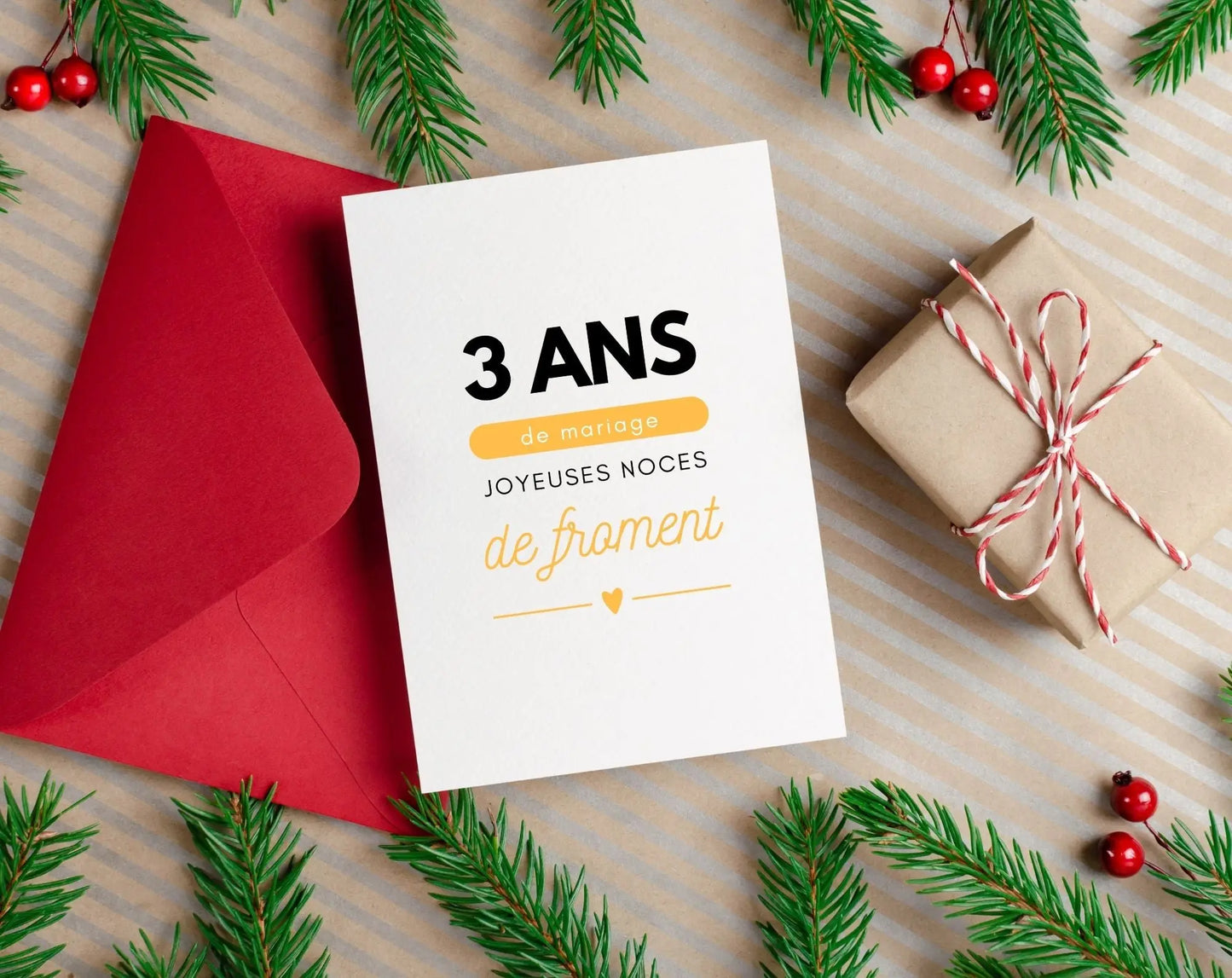 ✔️ Le message « Joyeuses Noces de froment – 3 ans de mariage » en typographie élégante.