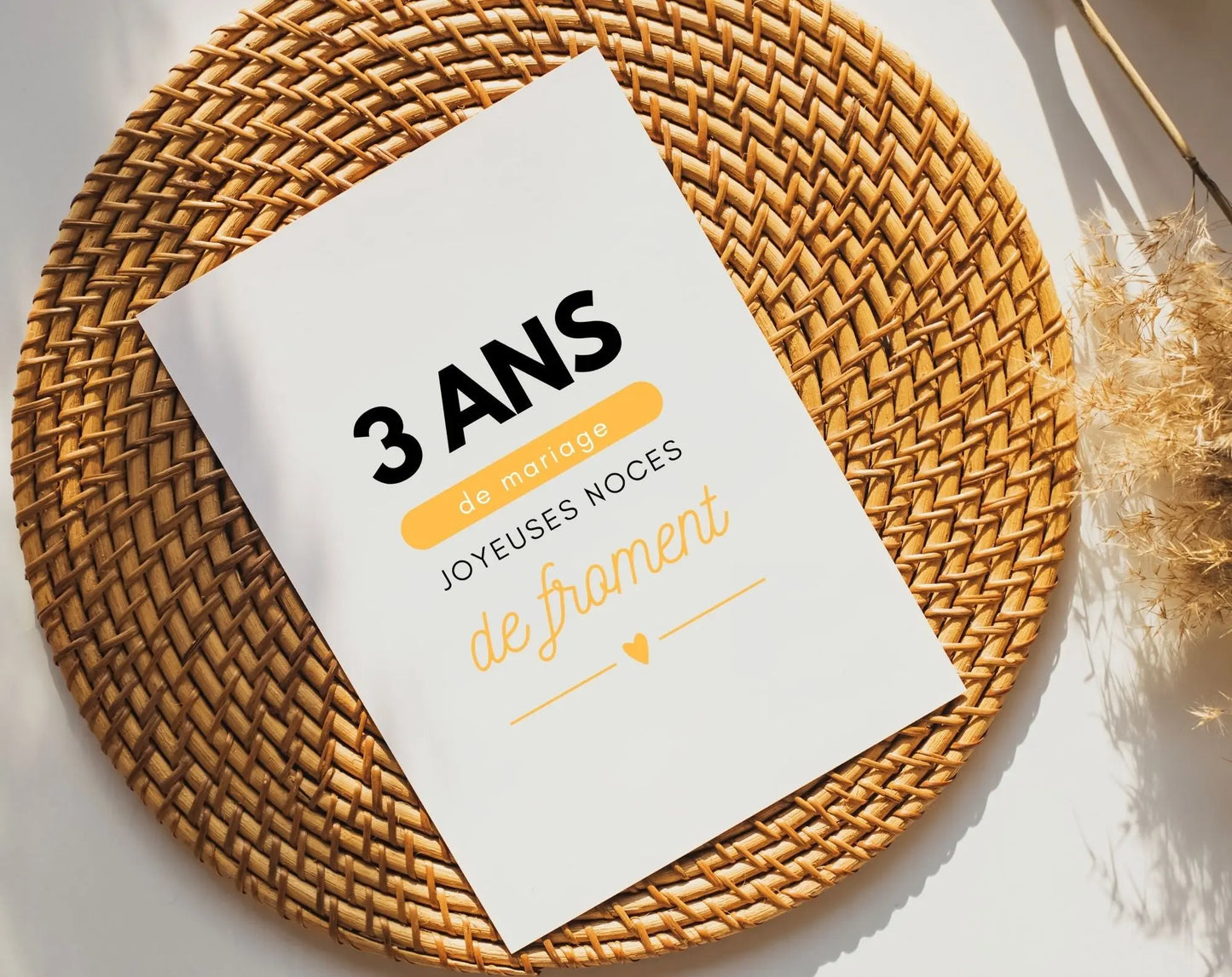 Après le coton et le cuir, place au froment, symbole de prospérité, de récolte et de fertilité. Les Noces de froment, c’est la métaphore parfaite pour dire que votre amour s’enracine et porte ses premiers épis dorés après trois belles années de vie commune. Avec cette affiche personnalisée « Joyeuses Noces de froment », vous capturez l’essence de votre 3e anniversaire de mariage : un petit clin d’œil rétro et moderne à la fois, à personnaliser avec vos prénoms et la date de votre union 🌾✨