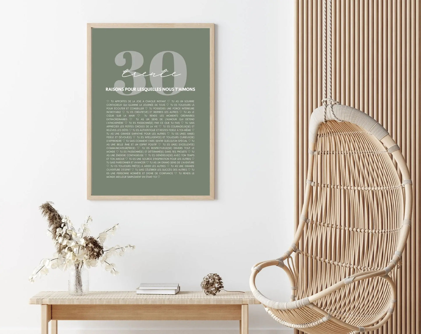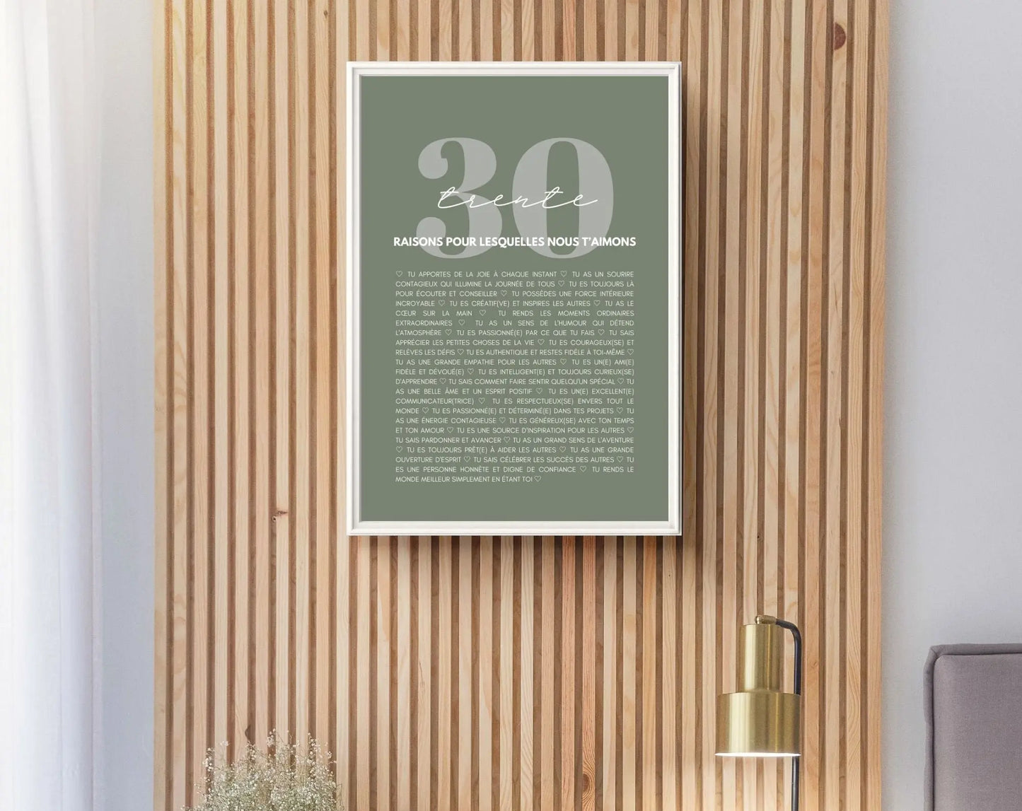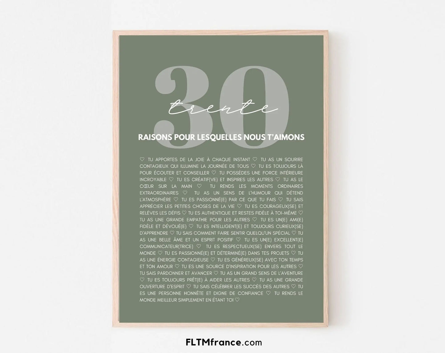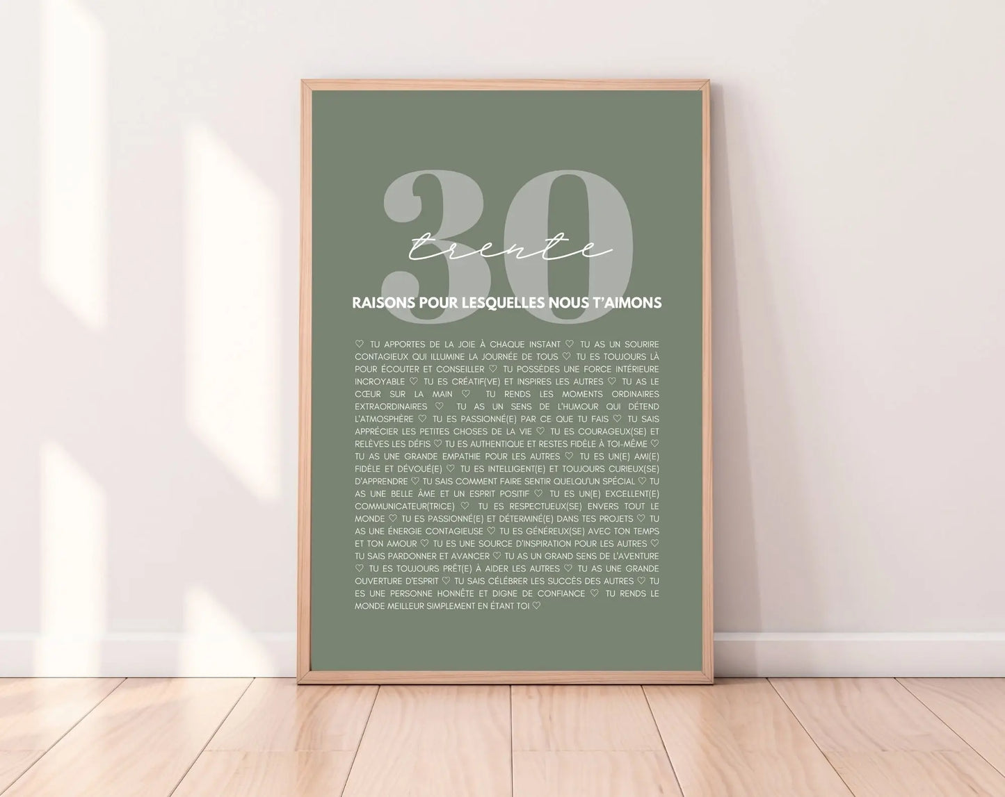Affiche cadeau anniversaire 30 ans : 30 raisons pour lesquelles nous t'aimons vert une idée de cadeau unique et mémorable