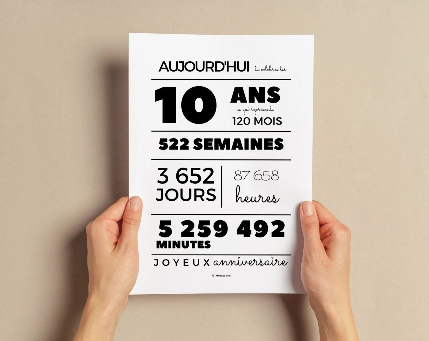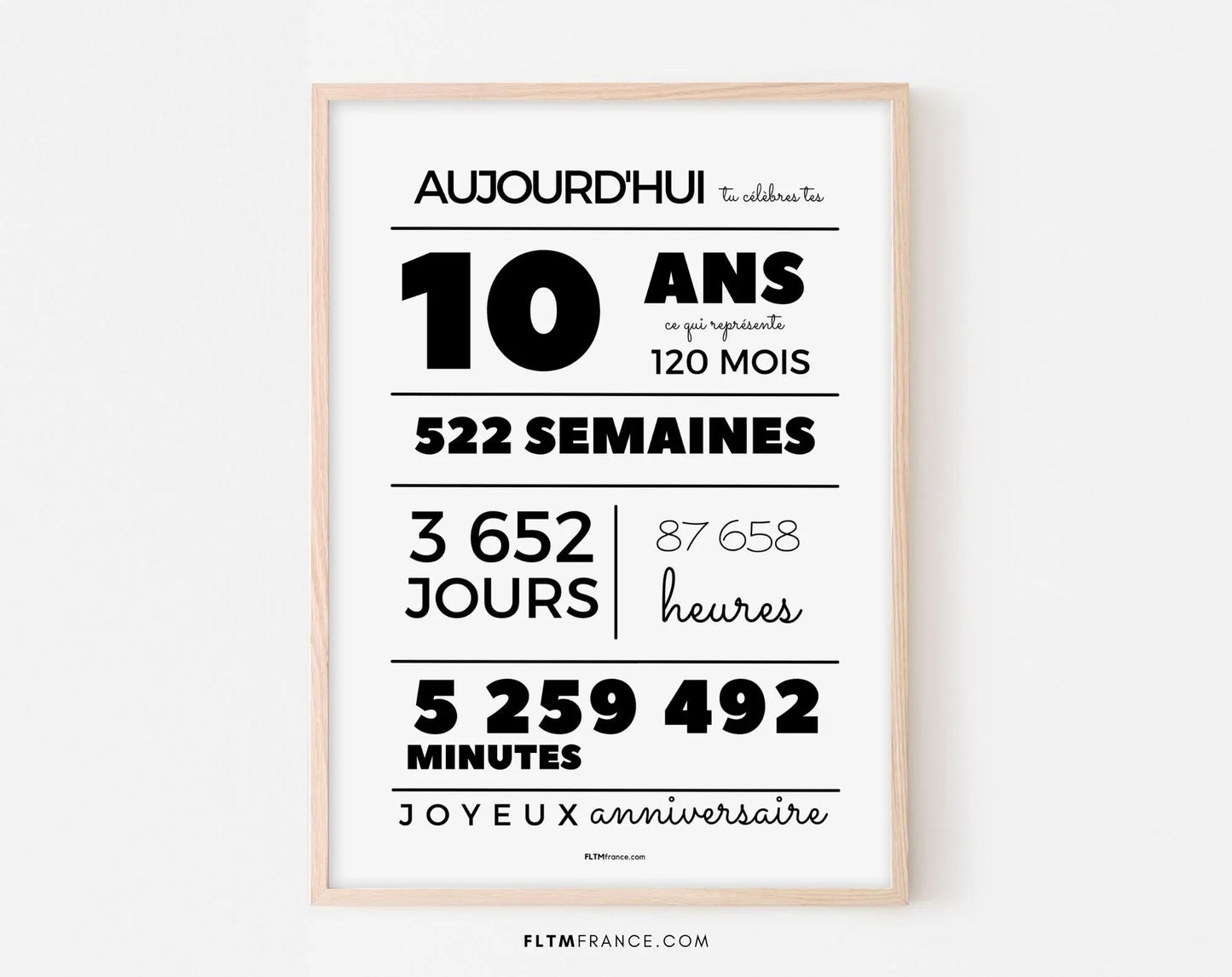 Affiche 10 ans, 120 mois, 522 semaines - Carte anniversaire enfant