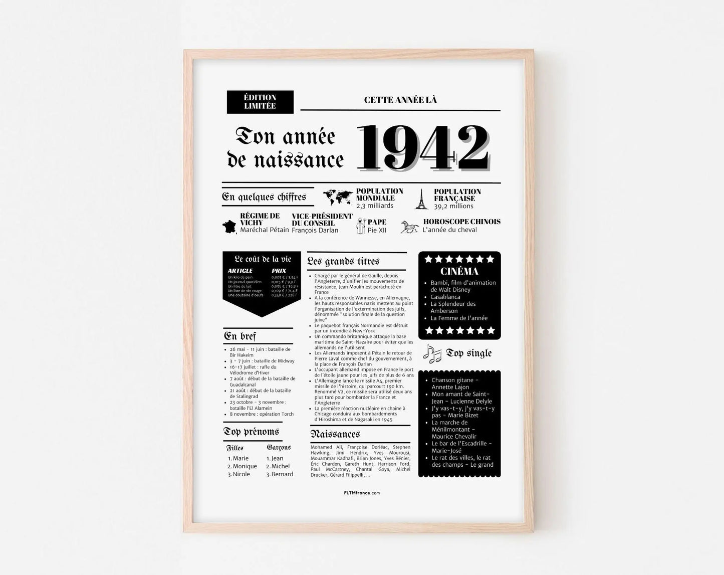 Notre affiche de l'année de naissance 1942 est conçue avec soin pour offrir une qualité exceptionnelle. Chaque détail est pensé pour raviver des souvenirs et offrir une expérience unique. Que ce soit pour offrir ou pour décorer votre intérieur, cette affiche est un choix parfait.