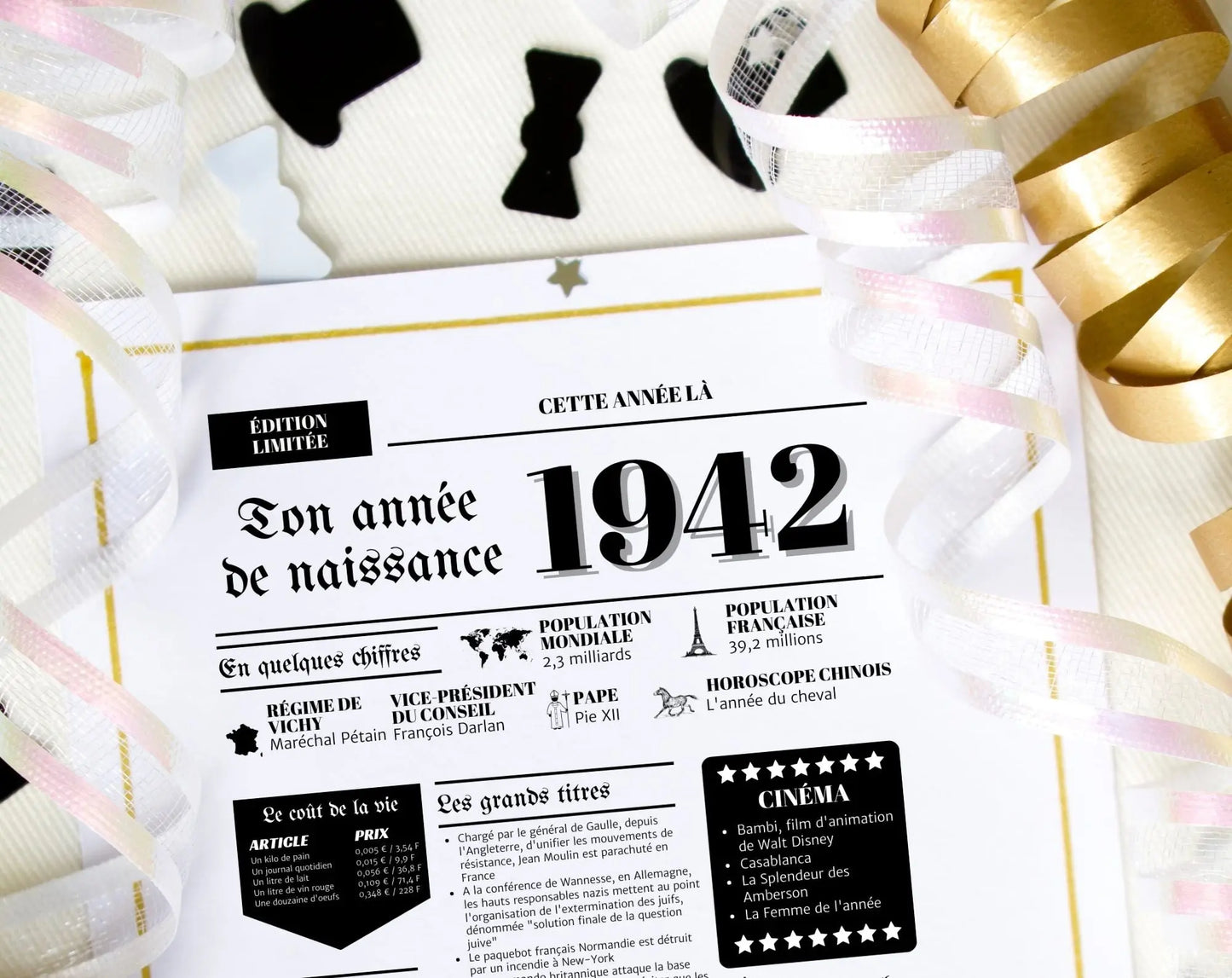 Lors d'un anniversaire ou d'une fête, la décoration joue un rôle crucial. Une affiche personnalisée de l'année 1942 peut transformer l'atmosphère et ajouter une touche personnelle et historique à votre événement. Placée au centre de la pièce ou sur un mur dédié aux souvenirs, elle captera l'attention de vos invités et suscitera des discussions animées.