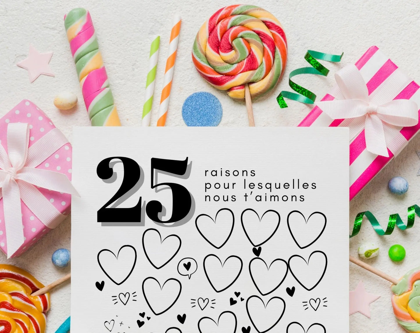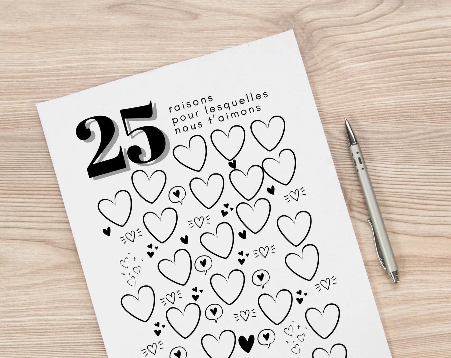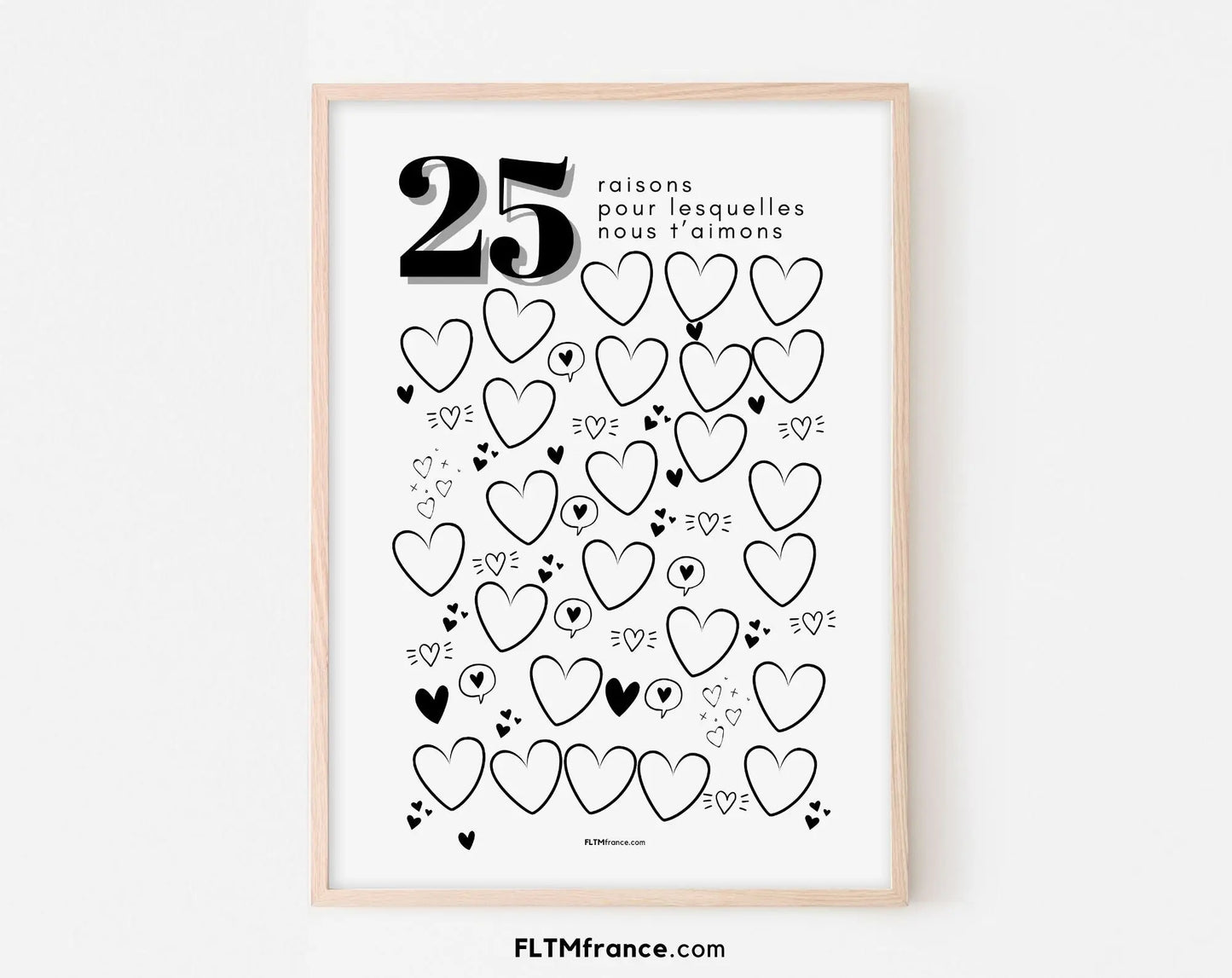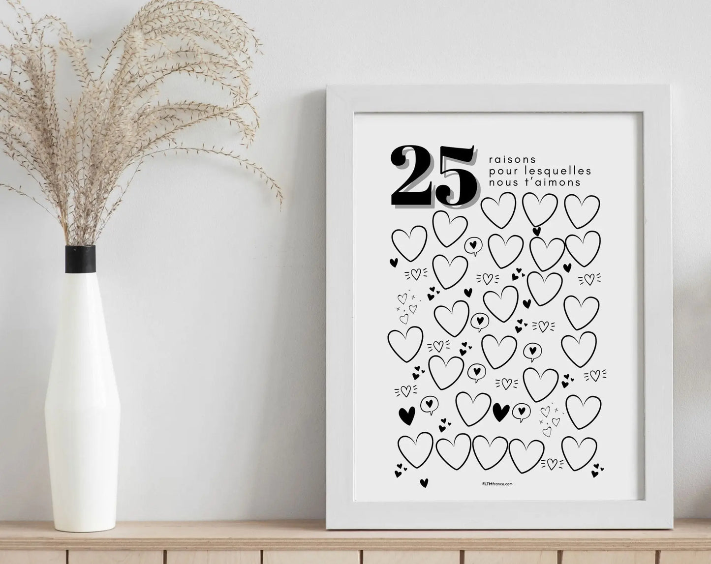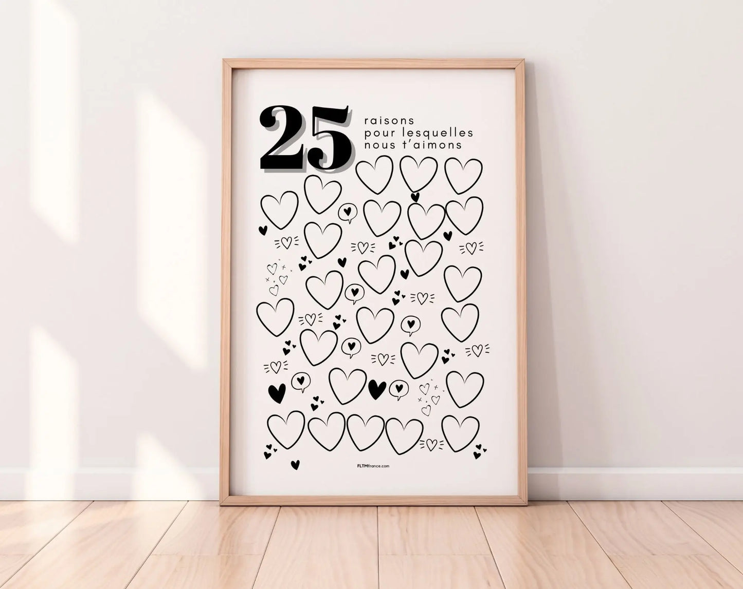 Une fois imprimée, l'affiche 25 raisons pour lesquelles nous t'aimons devient une toile pour votre créativité. Vous pouvez personnaliser chaque espace prévu pour écrire les textes en ajoutant vos propres raisons, messages, ou anecdotes spéciales. Cette flexibilité permet de rendre l'affiche encore plus personnelle et significative, transformant un simple achat en un cadeau rempli d'émotions.