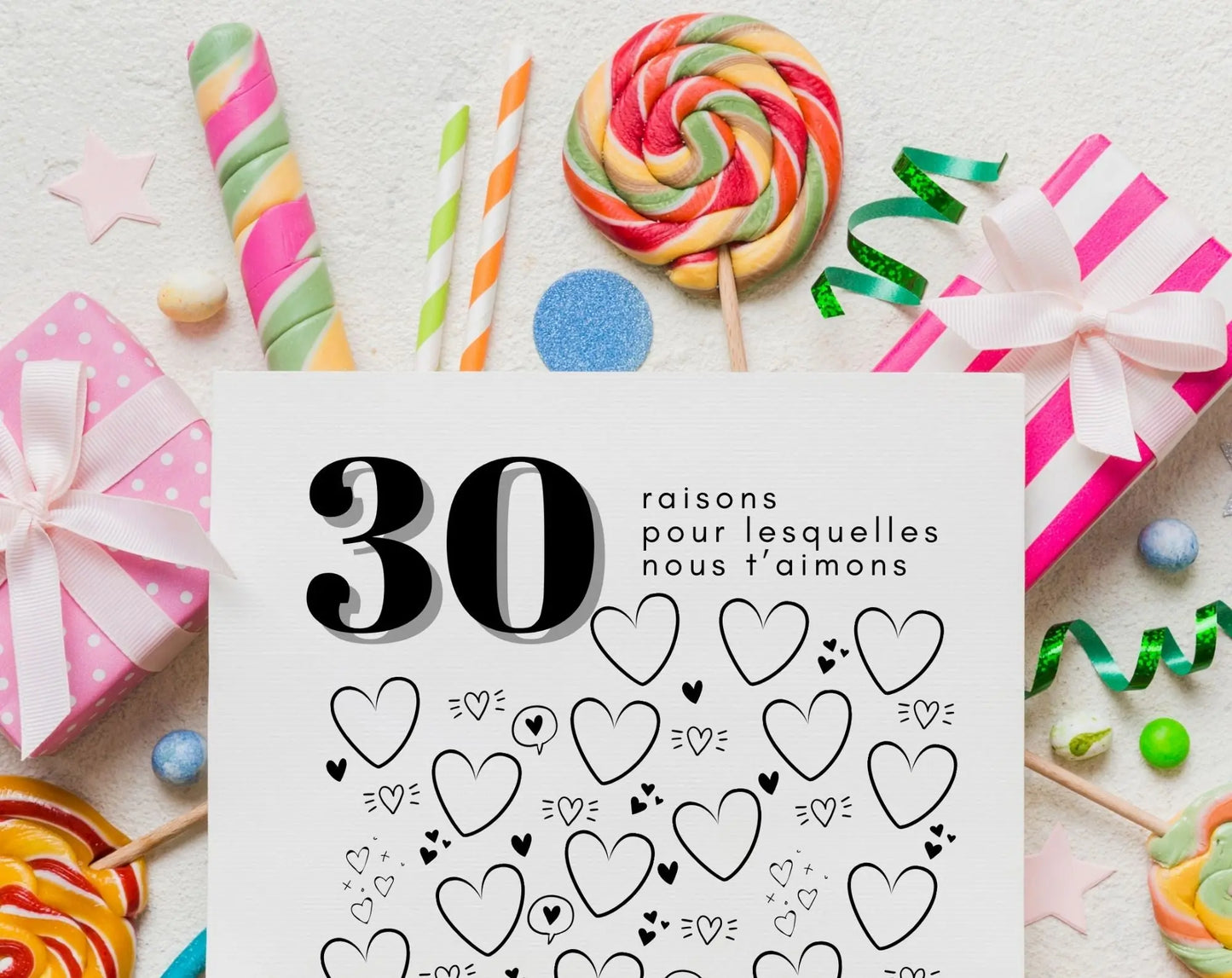 Pour rendre ce moment encore plus fort, quoi de mieux qu’une affiche-livre d’or où chacun peut laisser un petit mot doux ? Avec cette Affiche « 30 raisons pour lesquelles nous t’aimons », tu offres bien plus qu’une déco : tu crées un souvenir collaboratif, rempli de messages, de souvenirs partagés et de mots qui resteront gravés.