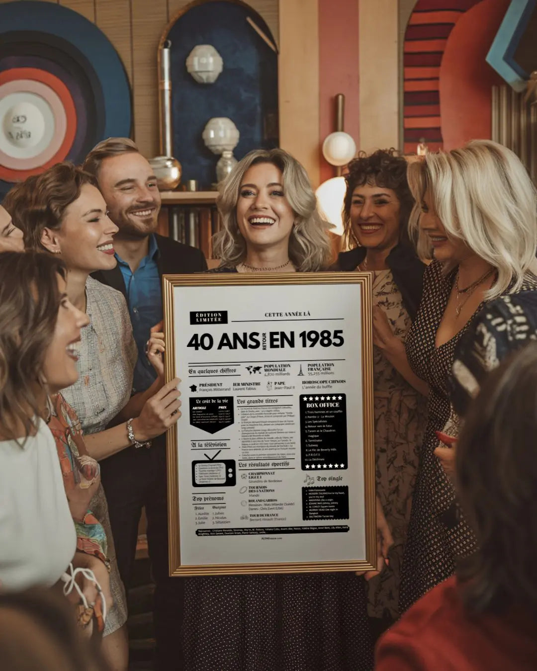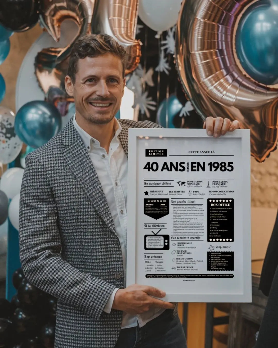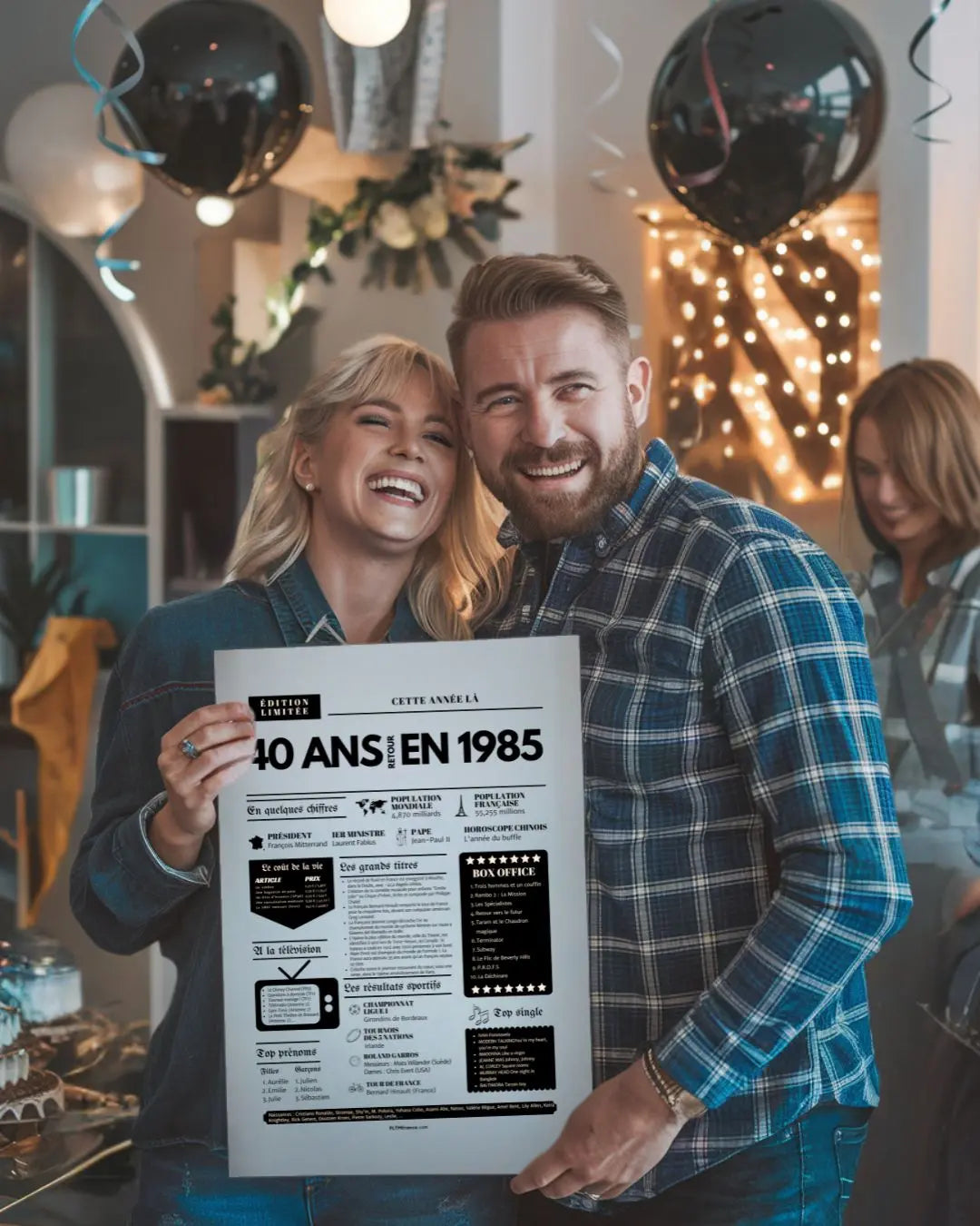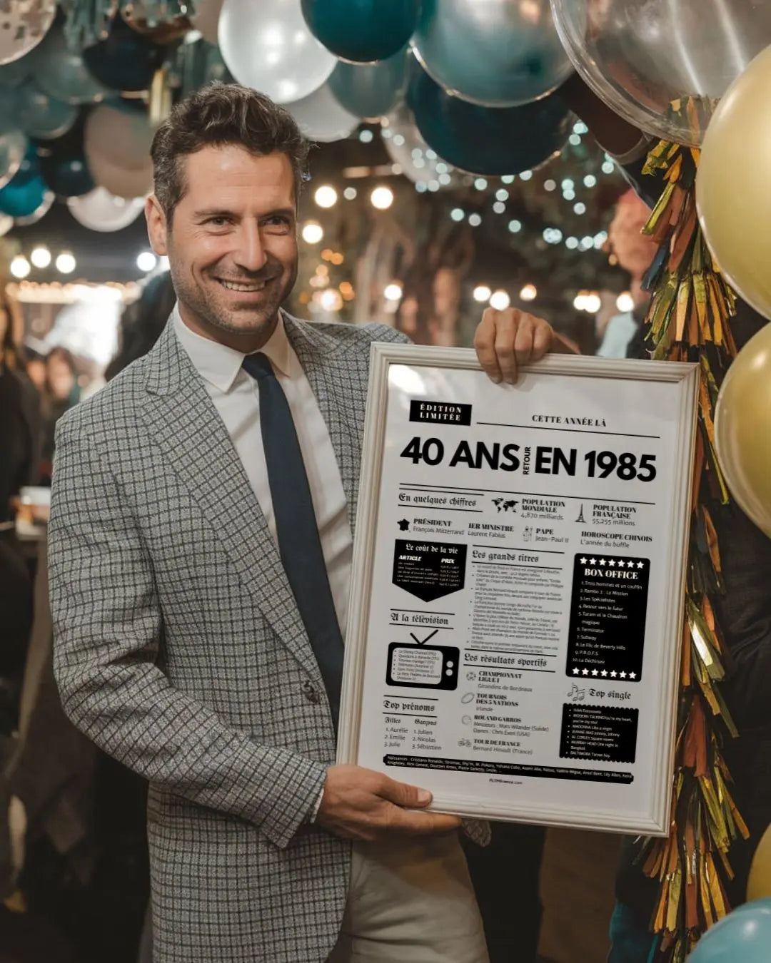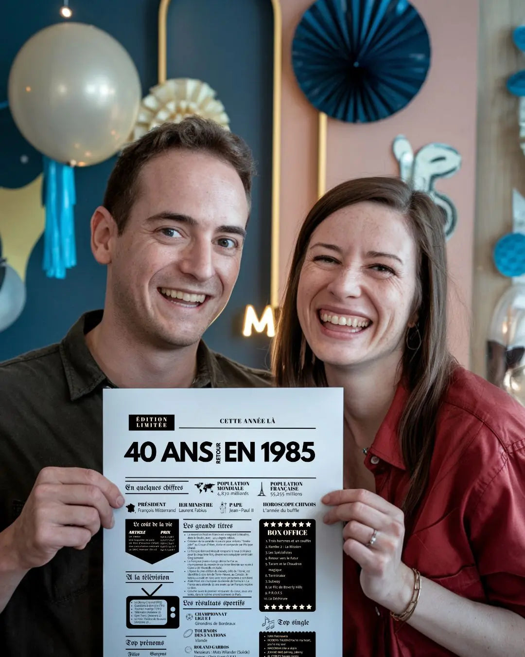 Souffler ses 40 bougies, c’est franchir une étape symbolique, entouré de ceux qui comptent vraiment. Et si tu surprenais le roi ou la reine de la soirée avec une Affiche « Retour en 1985 » ? Cette affiche façon journal de l’année replonge directement dans l’ambiance de l’année de naissance : chiffres clés, événements marquants, prénoms tendances, émissions TV, top films, chansons incontournables, résultats sportifs… Un condensé de souvenirs pour réveiller la nostalgie et faire sourire toute la tablée !