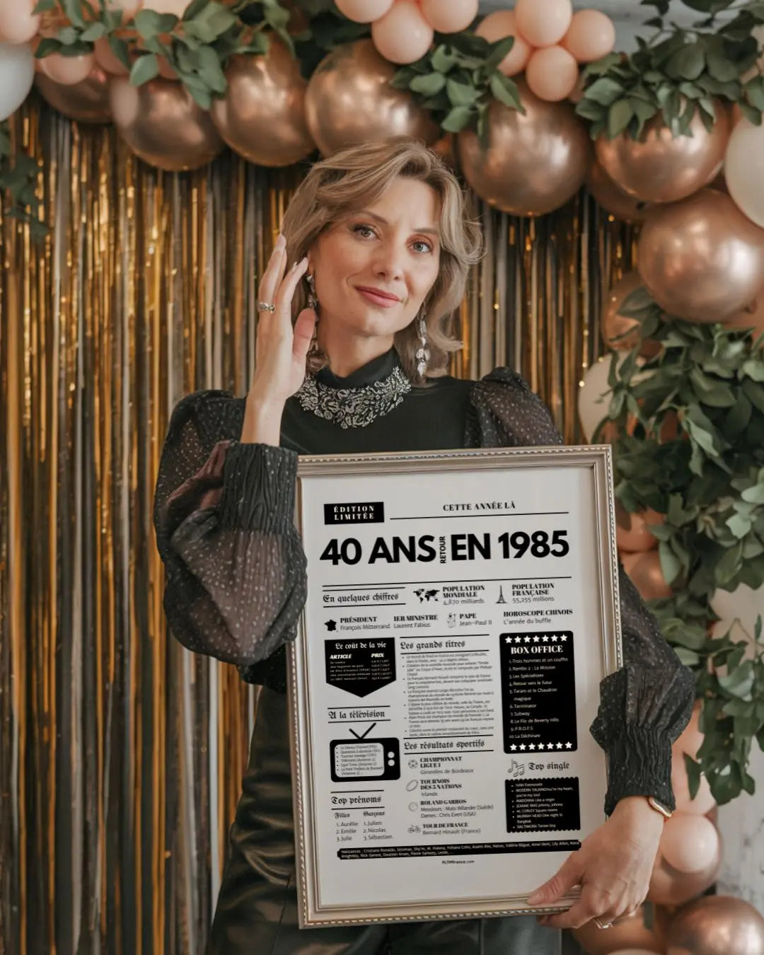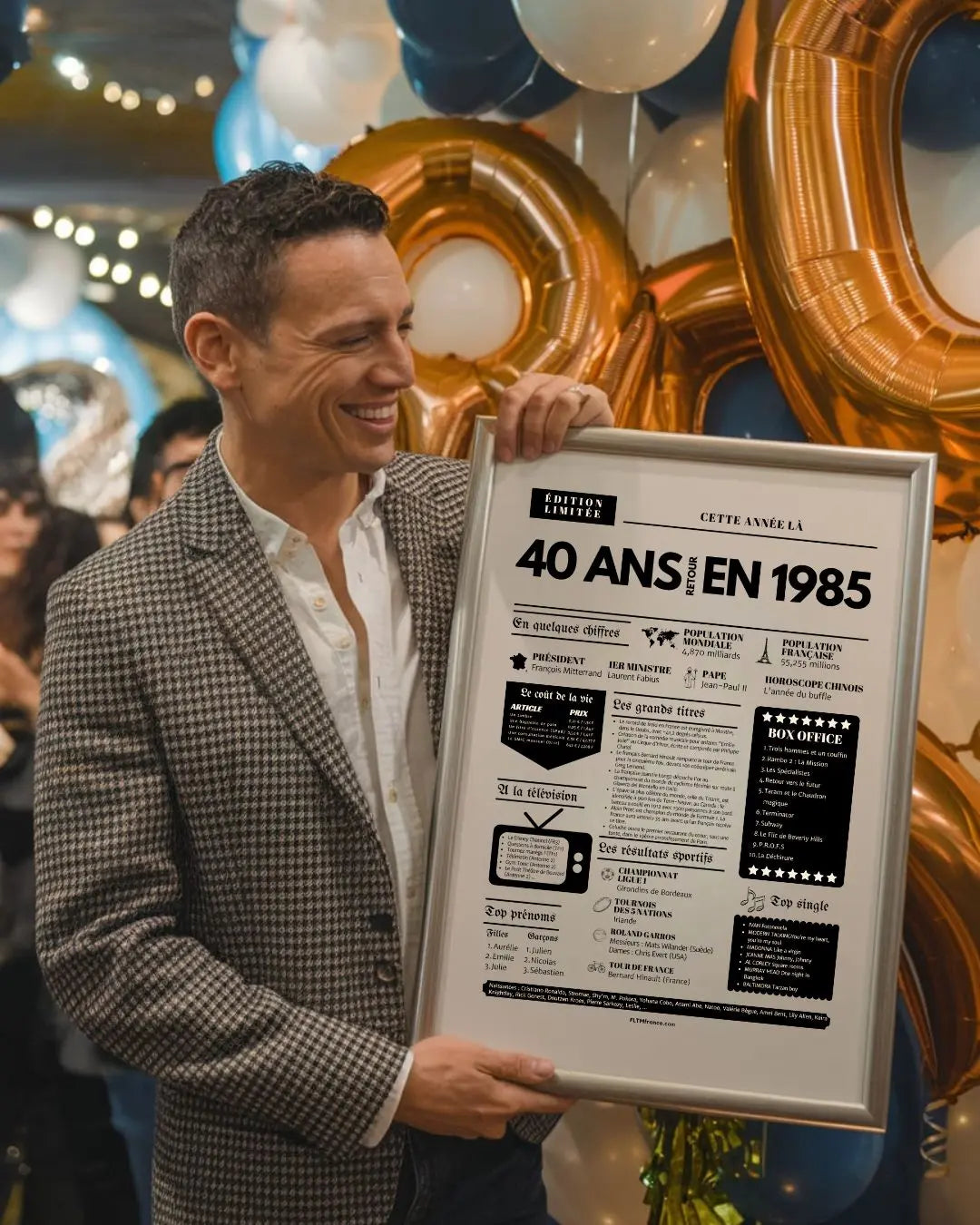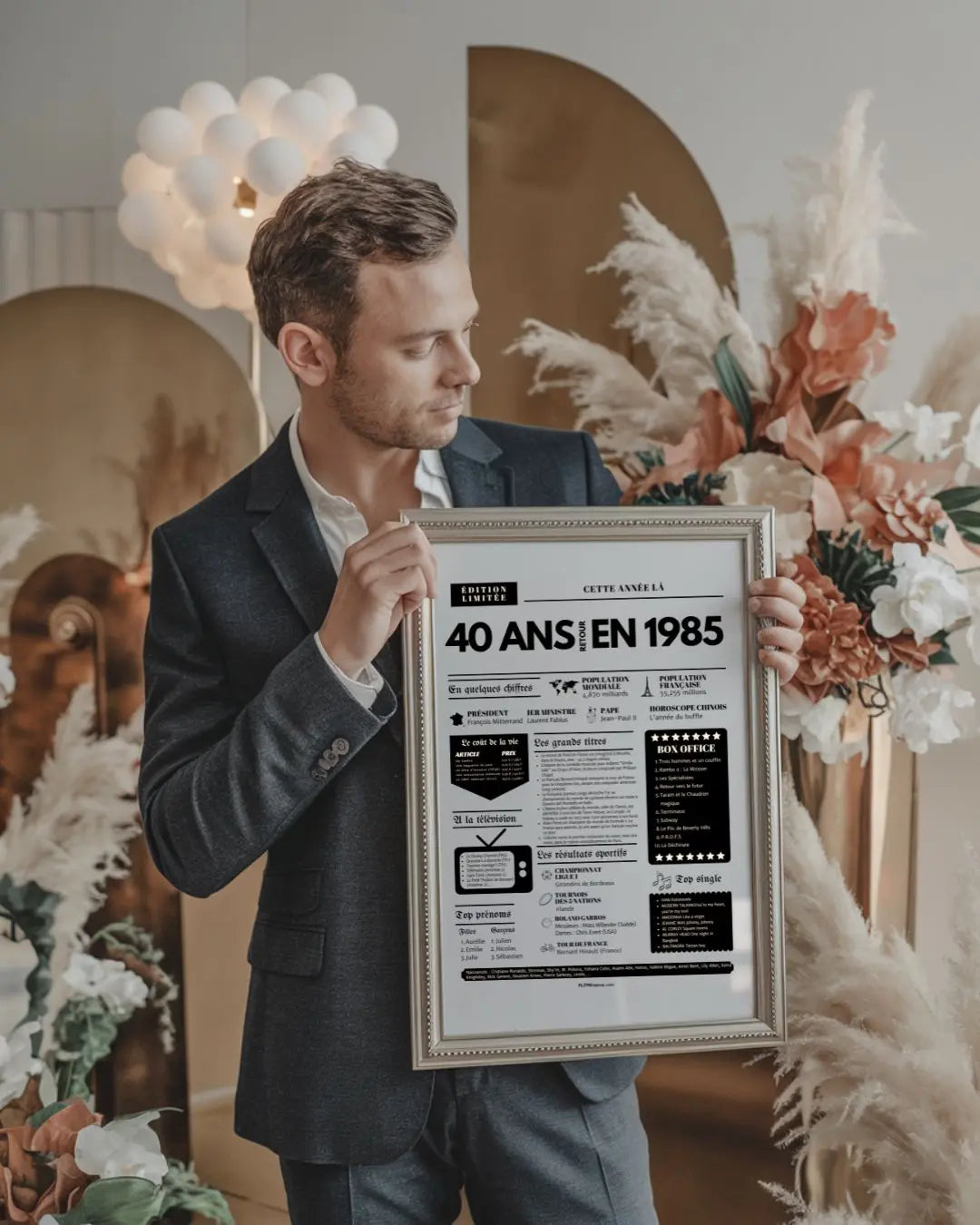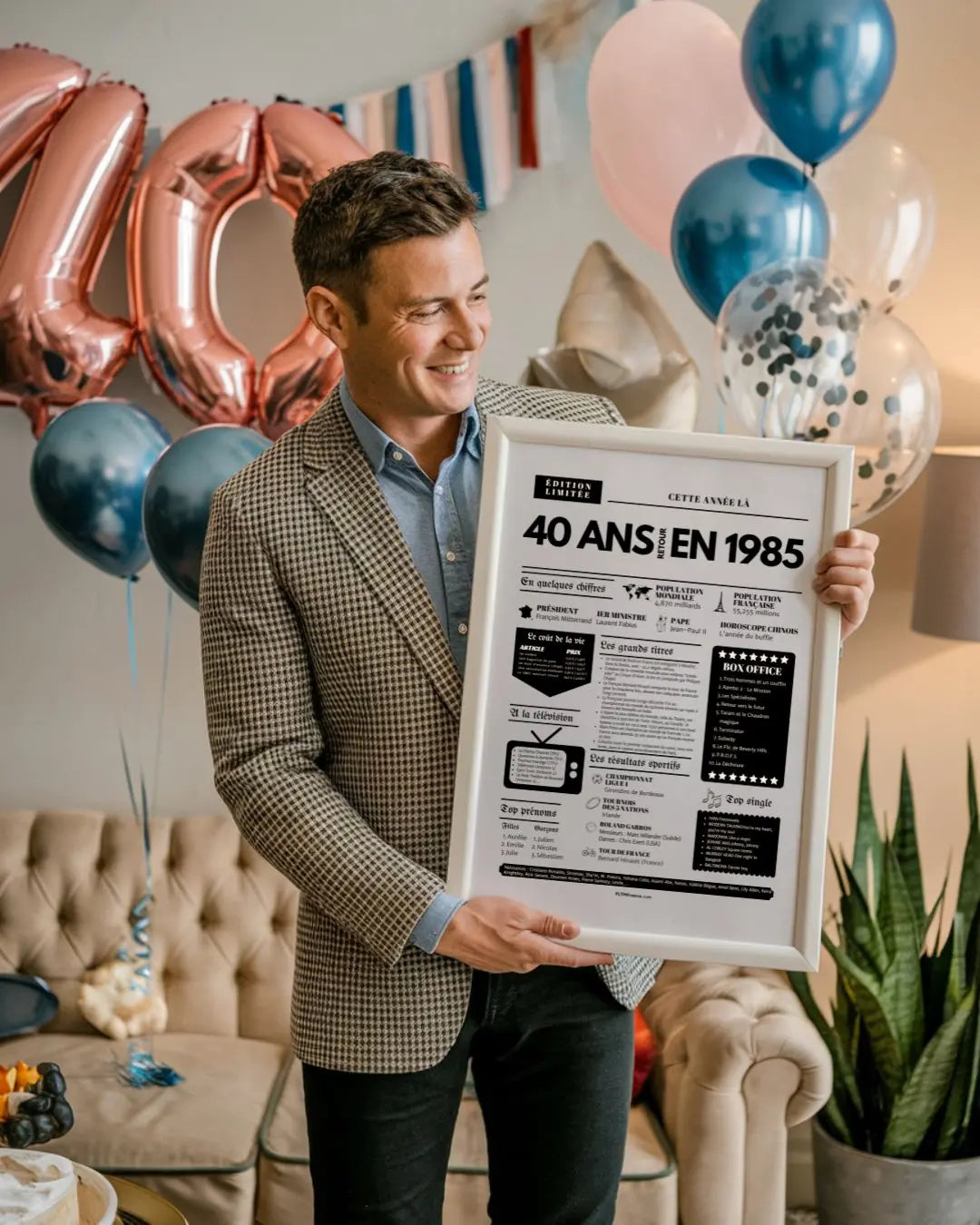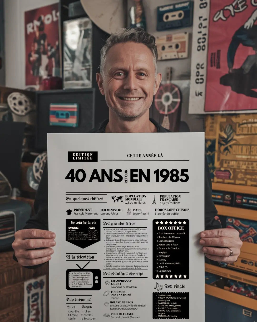 Souffler ses 40 bougies, c’est franchir une étape symbolique, entouré de ceux qui comptent vraiment. Et si tu surprenais le roi ou la reine de la soirée avec une Affiche « Retour en 1985 » ? Cette affiche façon journal de l’année replonge directement dans l’ambiance de l’année de naissance : chiffres clés, événements marquants, prénoms tendances, émissions TV, top films, chansons incontournables, résultats sportifs… Un condensé de souvenirs pour réveiller la nostalgie et faire sourire toute la tablée !