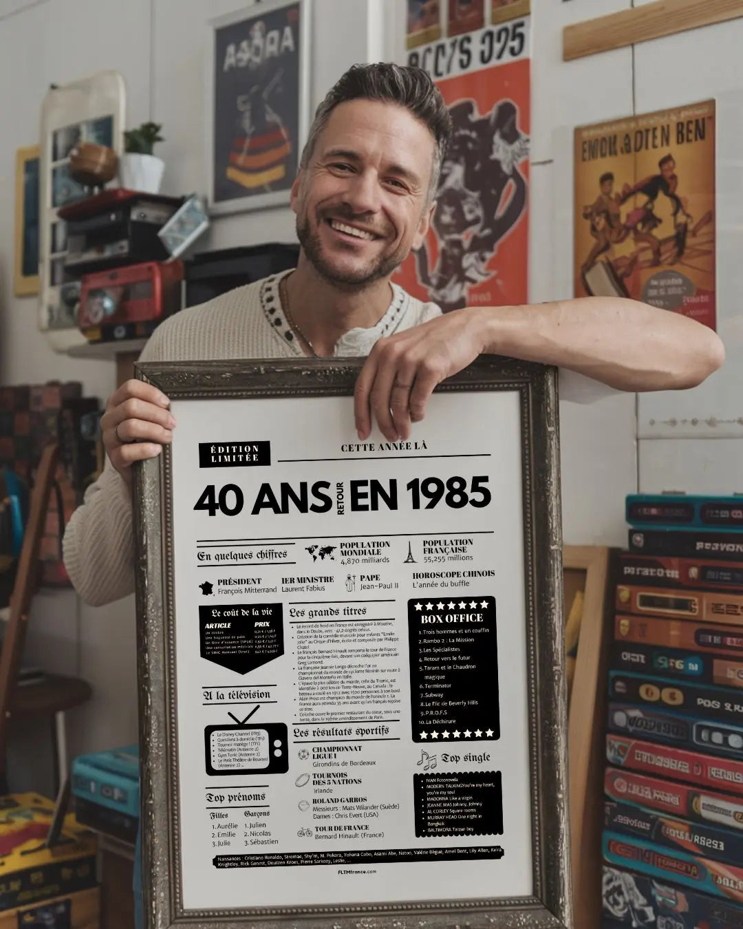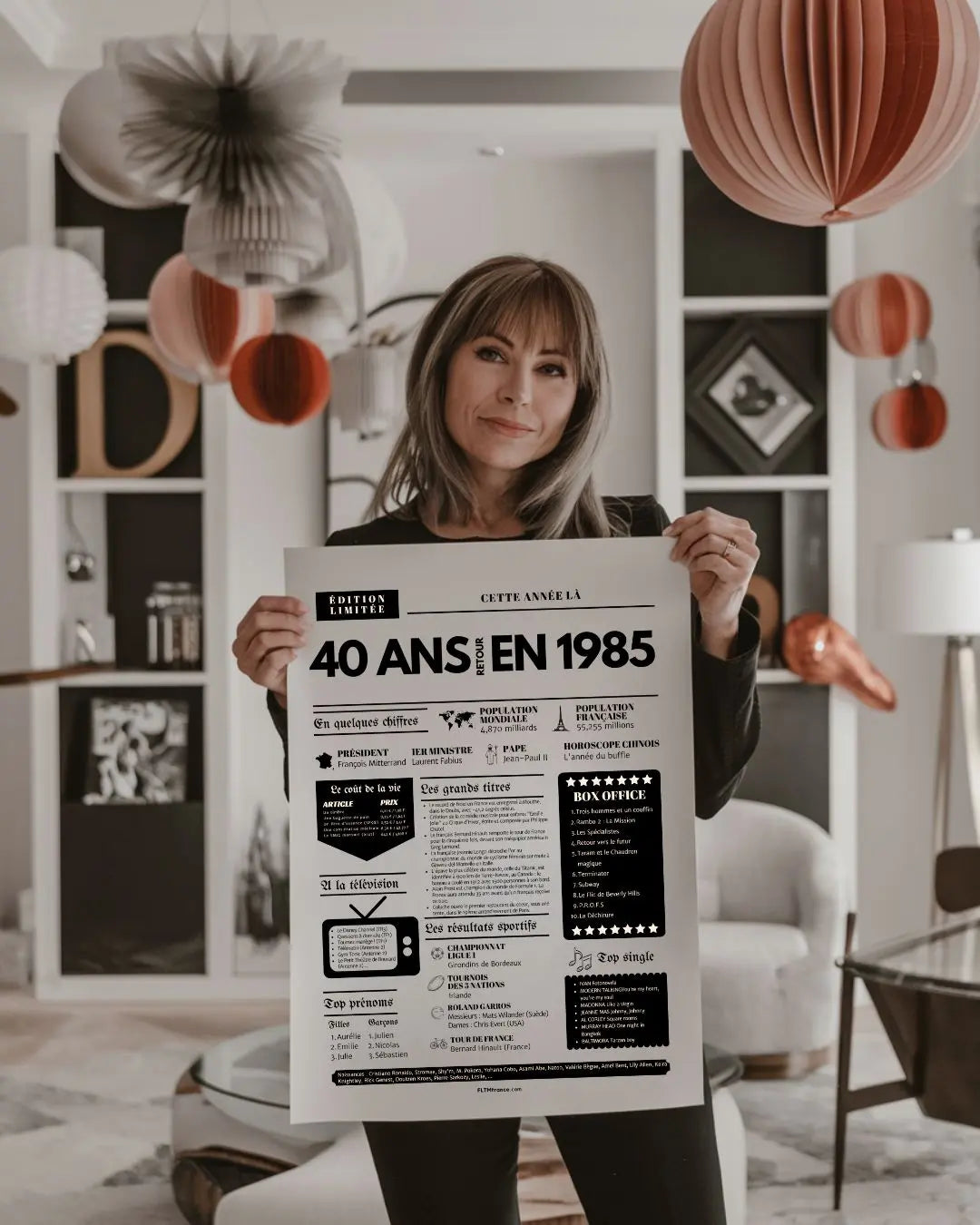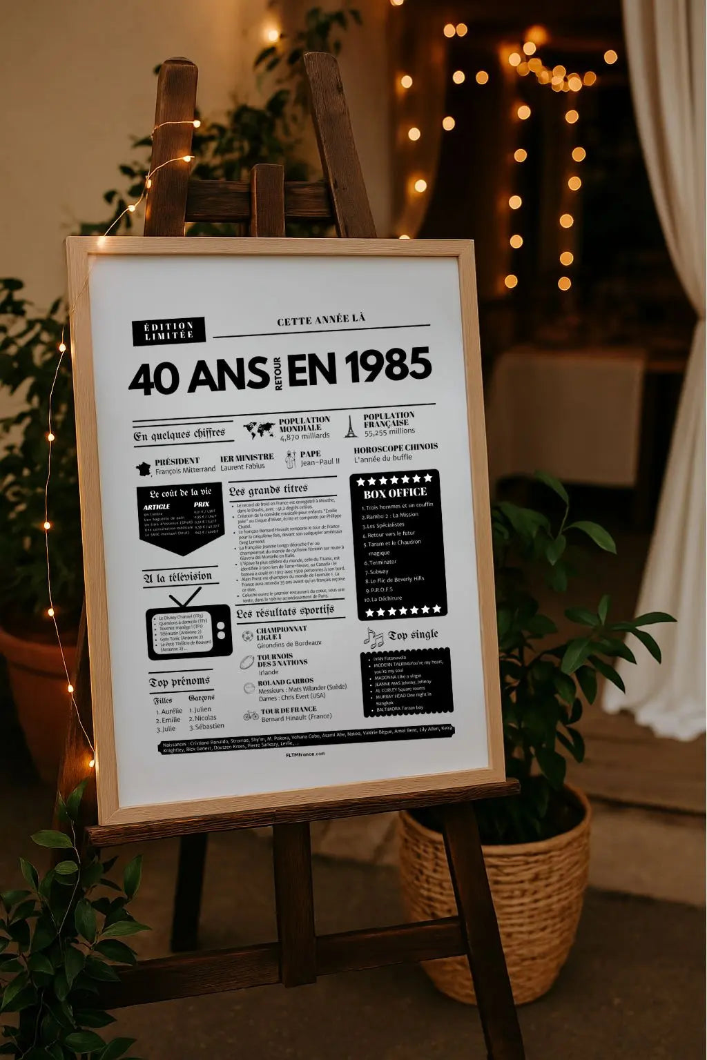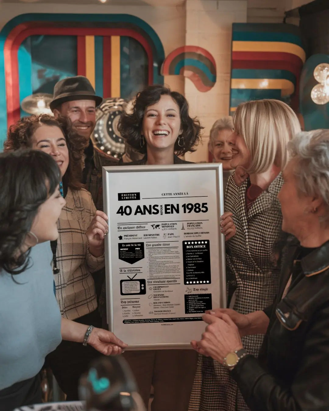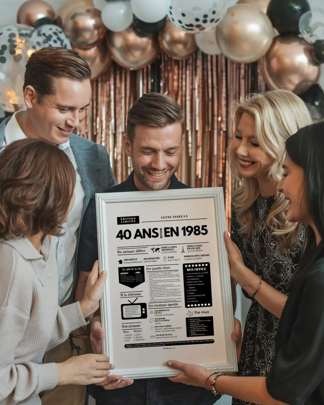 Souffler ses 40 bougies, c’est franchir une étape symbolique, entouré de ceux qui comptent vraiment. Et si tu surprenais le roi ou la reine de la soirée avec une Affiche « Retour en 1985 » ? Cette affiche façon journal de l’année replonge directement dans l’ambiance de l’année de naissance : chiffres clés, événements marquants, prénoms tendances, émissions TV, top films, chansons incontournables, résultats sportifs… Un condensé de souvenirs pour réveiller la nostalgie et faire sourire toute la tablée !
