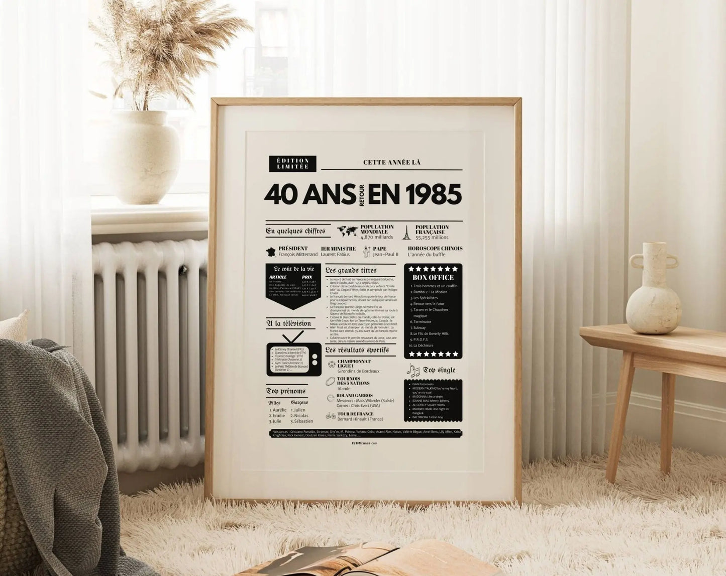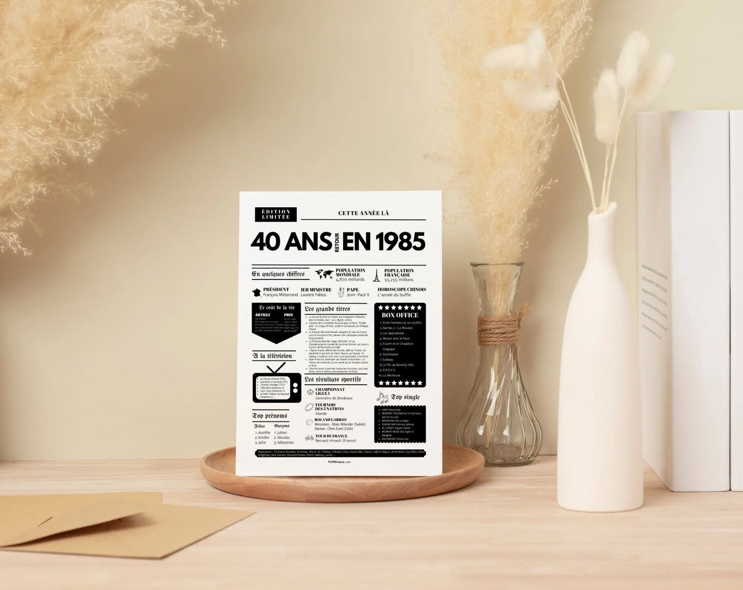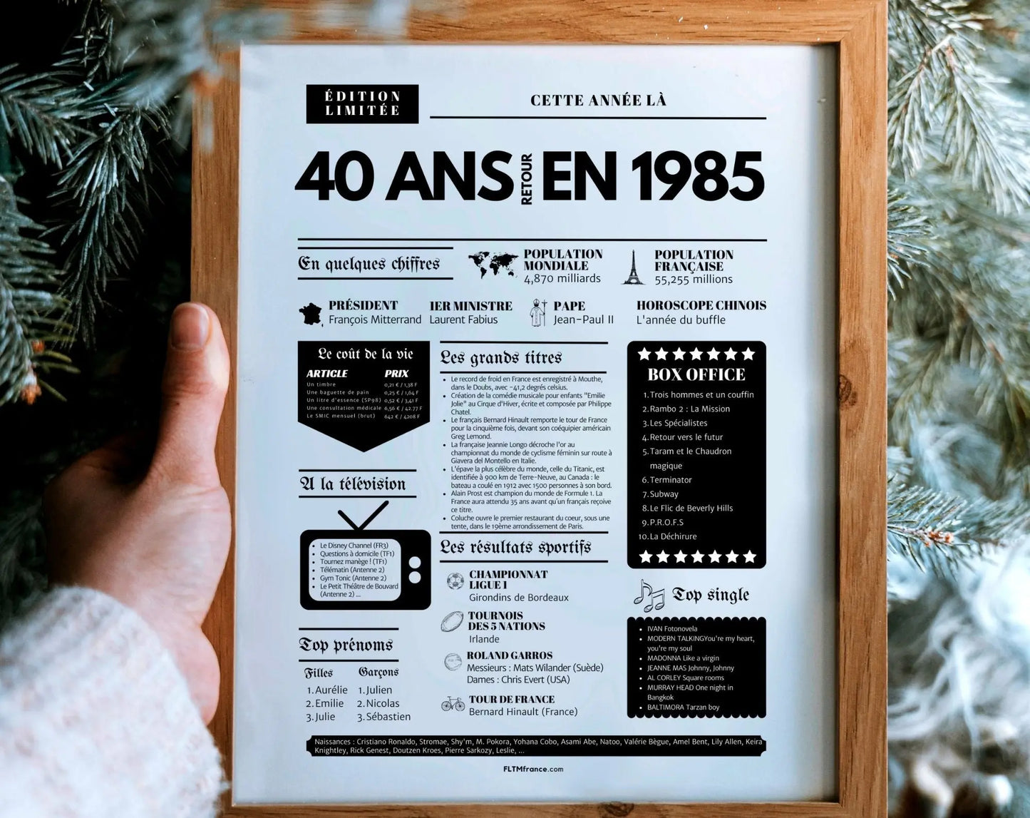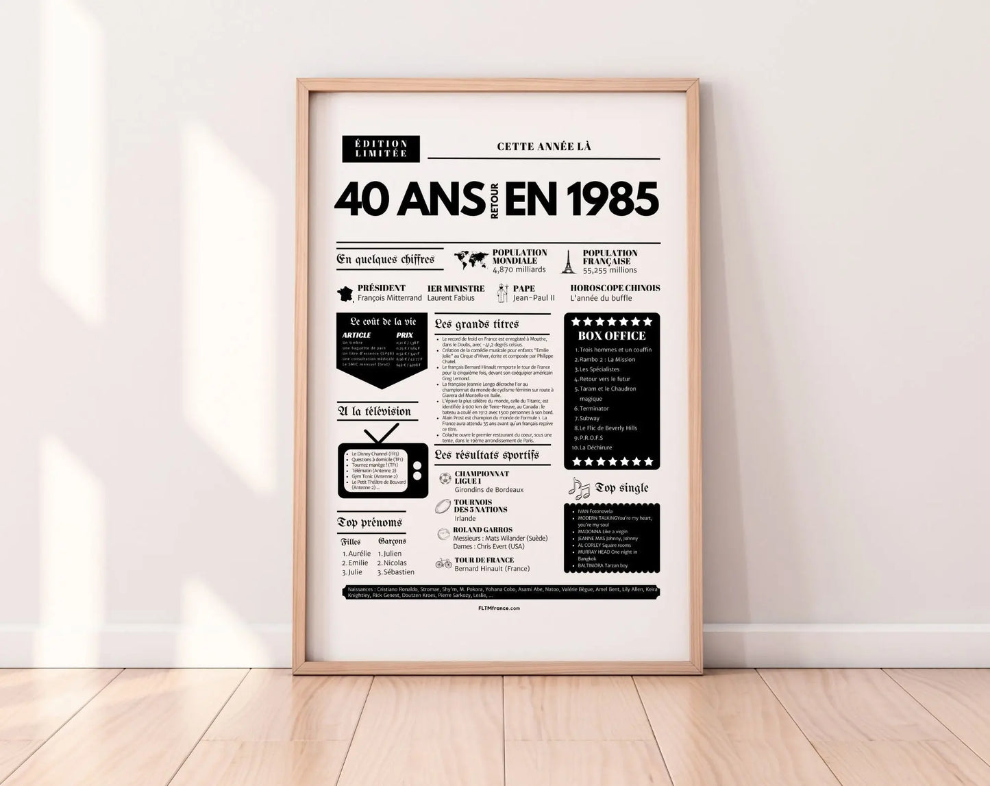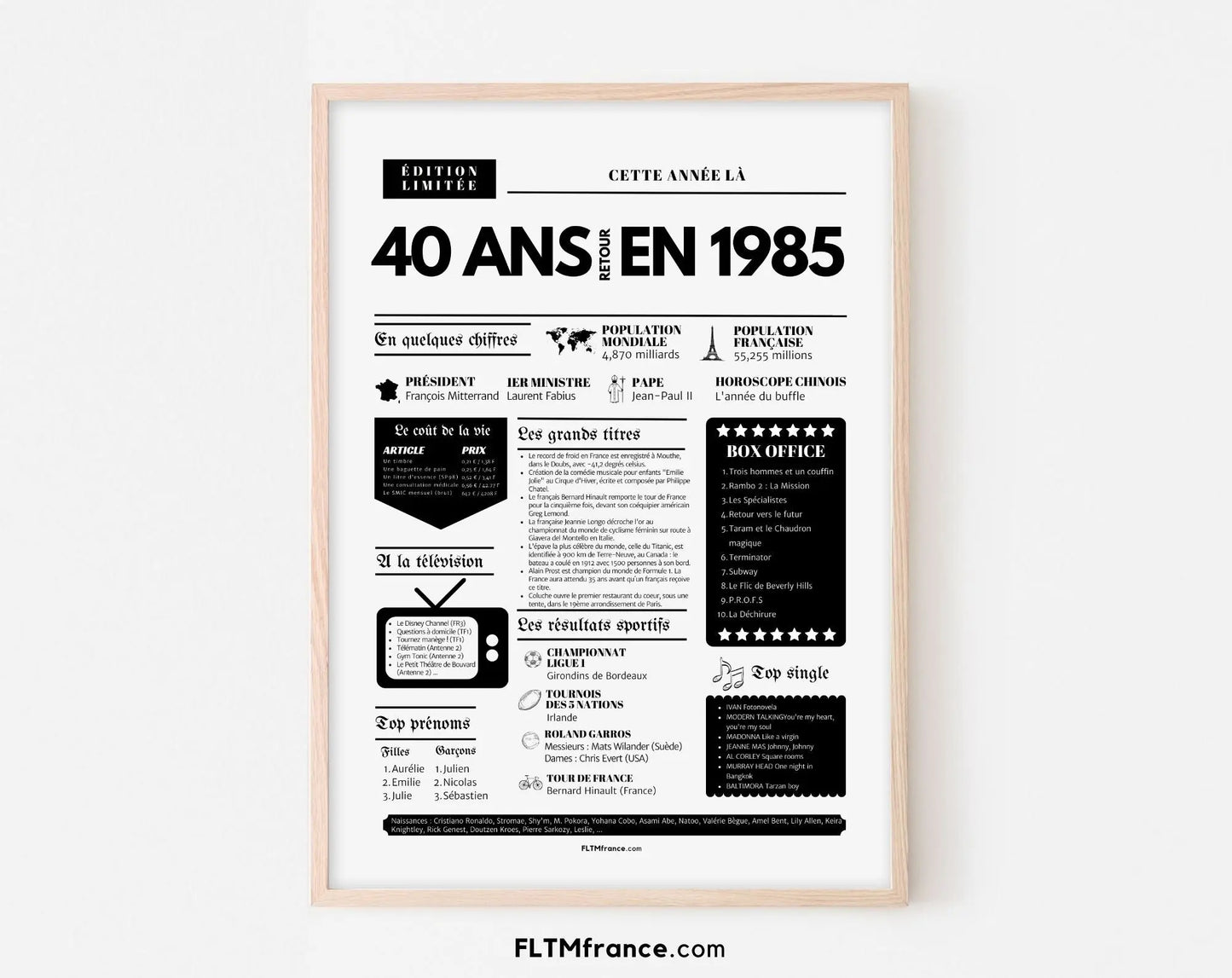 Souffler ses 40 bougies, c’est franchir une étape symbolique, entouré de ceux qui comptent vraiment. Et si tu surprenais le roi ou la reine de la soirée avec une Affiche « Retour en 1985 » ? Cette affiche façon journal de l’année replonge directement dans l’ambiance de l’année de naissance : chiffres clés, événements marquants, prénoms tendances, émissions TV, top films, chansons incontournables, résultats sportifs… Un condensé de souvenirs pour réveiller la nostalgie et faire sourire toute la tablée !