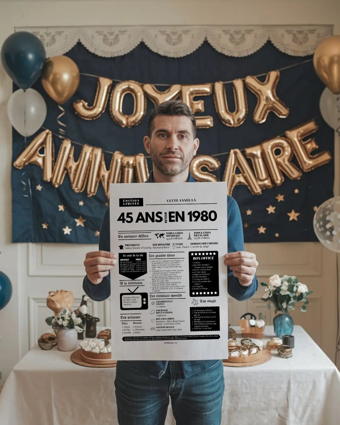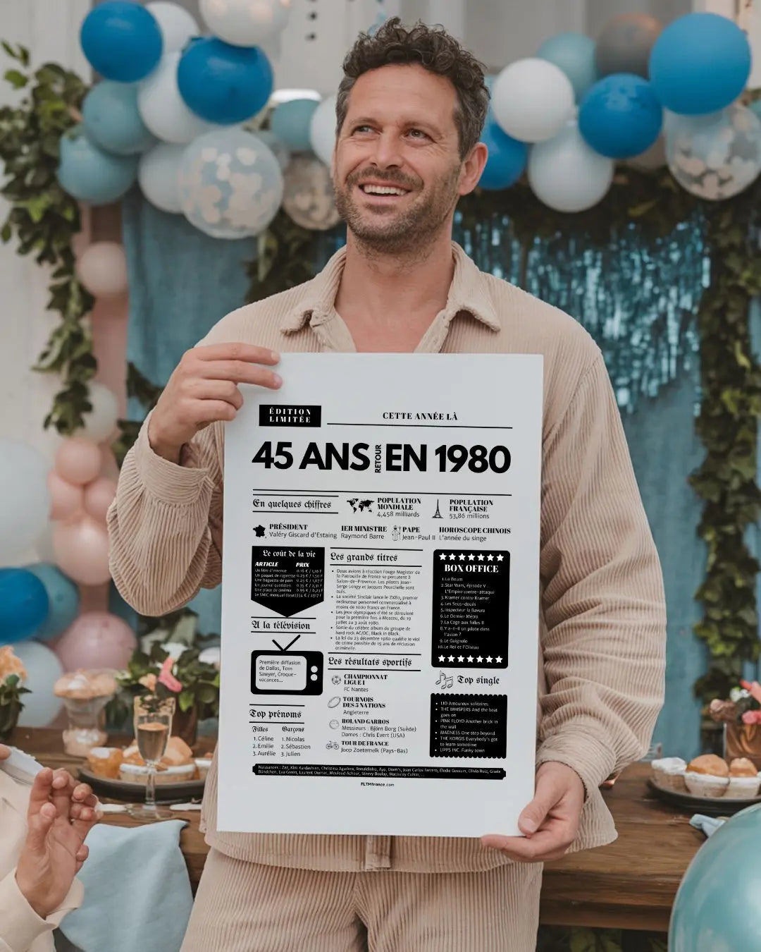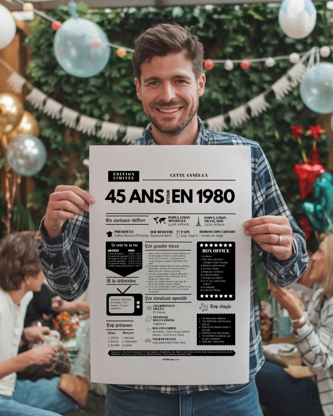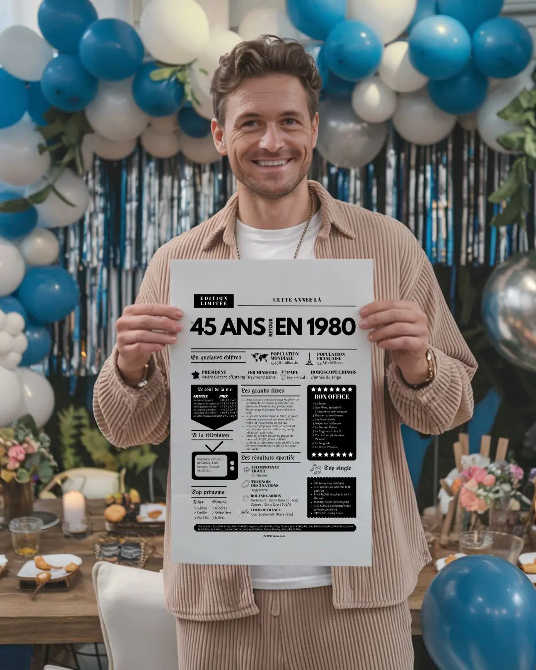 L’Affiche 45 ans retour en 1980 - Journal de l’année est un moyen idéal de revivre une année marquante tout en célébrant un anniversaire spécial. Que ce soit pour enrichir une fête ou offrir un cadeau unique, cette affiche replonge dans l’ambiance de 1980 avec style et originalité.