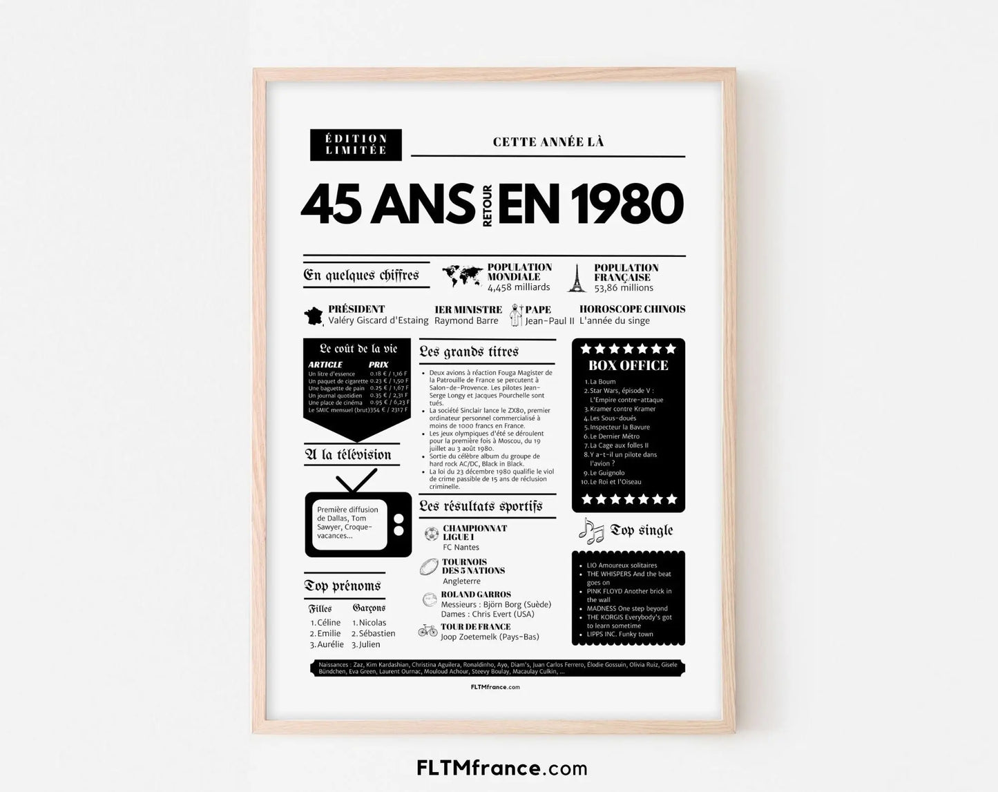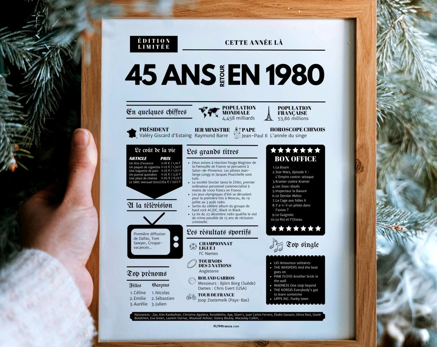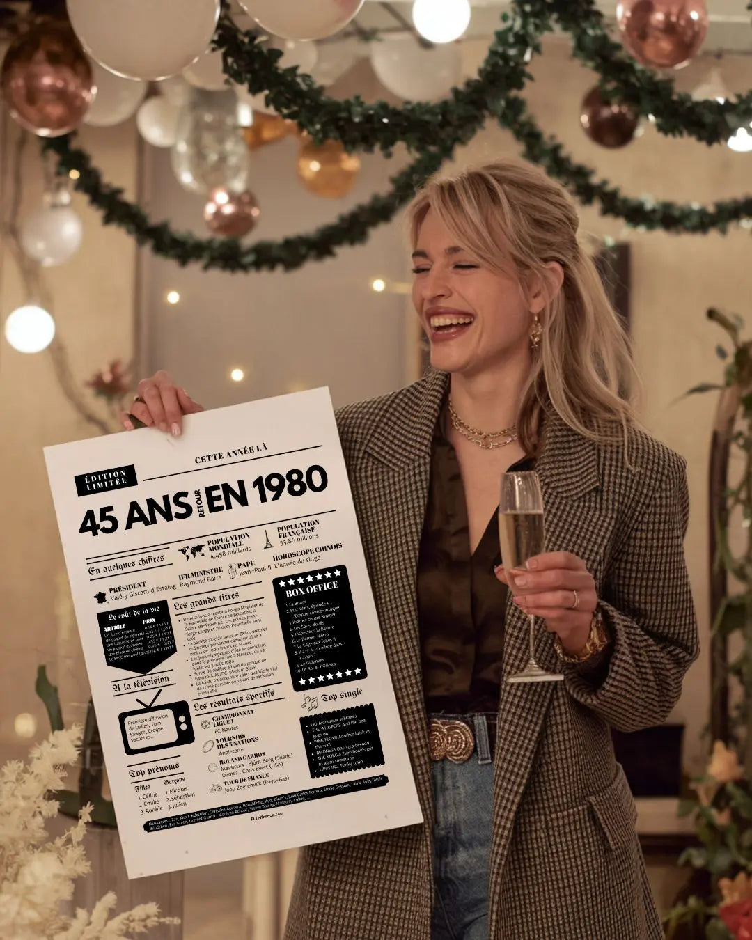 L’Affiche 45 ans retour en 1980 - Journal de l’année est un moyen idéal de revivre une année marquante tout en célébrant un anniversaire spécial. Que ce soit pour enrichir une fête ou offrir un cadeau unique, cette affiche replonge dans l’ambiance de 1980 avec style et originalité.