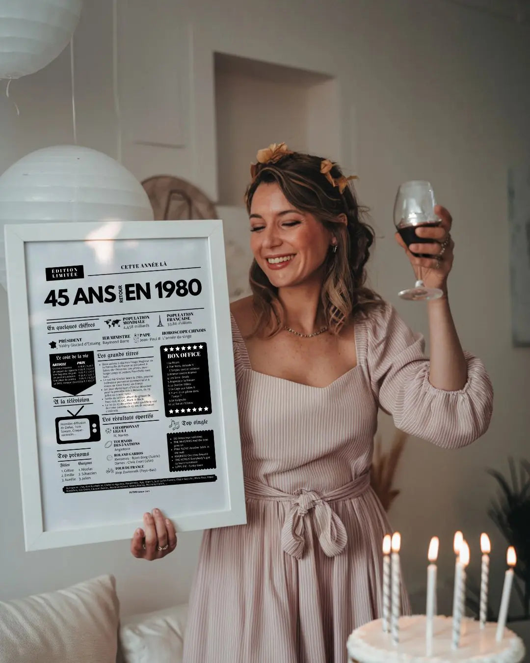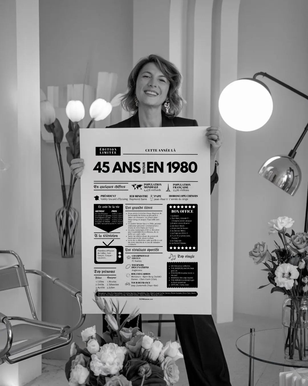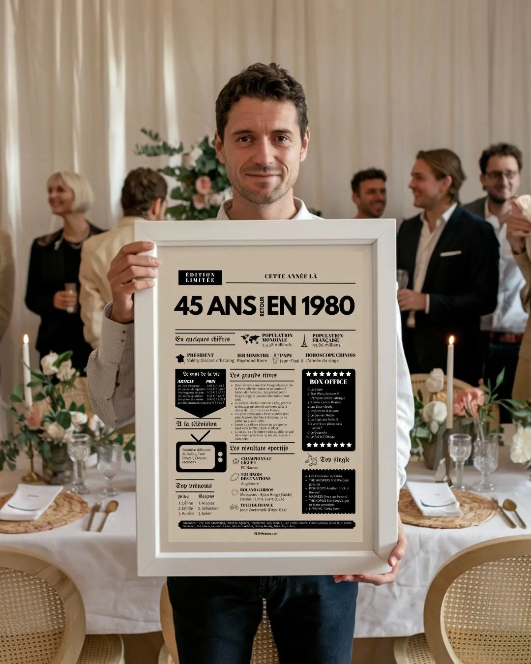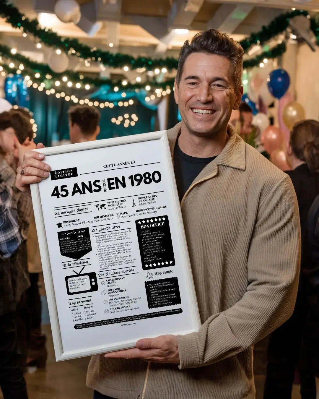 L’Affiche 45 ans retour en 1980 - Journal de l’année est un moyen idéal de revivre une année marquante tout en célébrant un anniversaire spécial. Que ce soit pour enrichir une fête ou offrir un cadeau unique, cette affiche replonge dans l’ambiance de 1980 avec style et originalité.