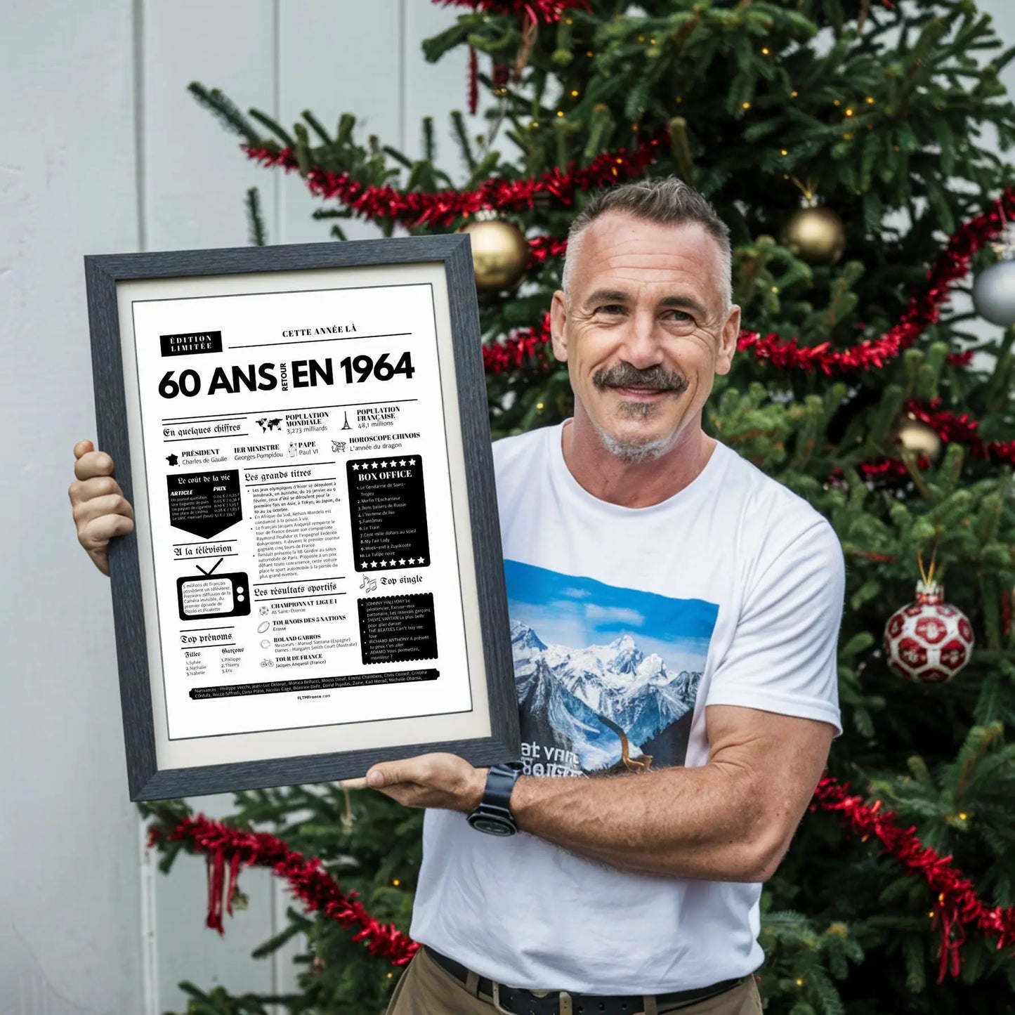 Célébrez six décennies de souvenirs avec l’Affiche 60 ans retour en 1965. Ce journal rétro met en lumière les moments marquants, tendances et événements historiques de cette année exceptionnelle. Parfaite comme décoration pour une fête ou comme cadeau unique, cette affiche est idéale pour revivre les souvenirs d’une époque marquante tout en célébrant un anniversaire symbolique.