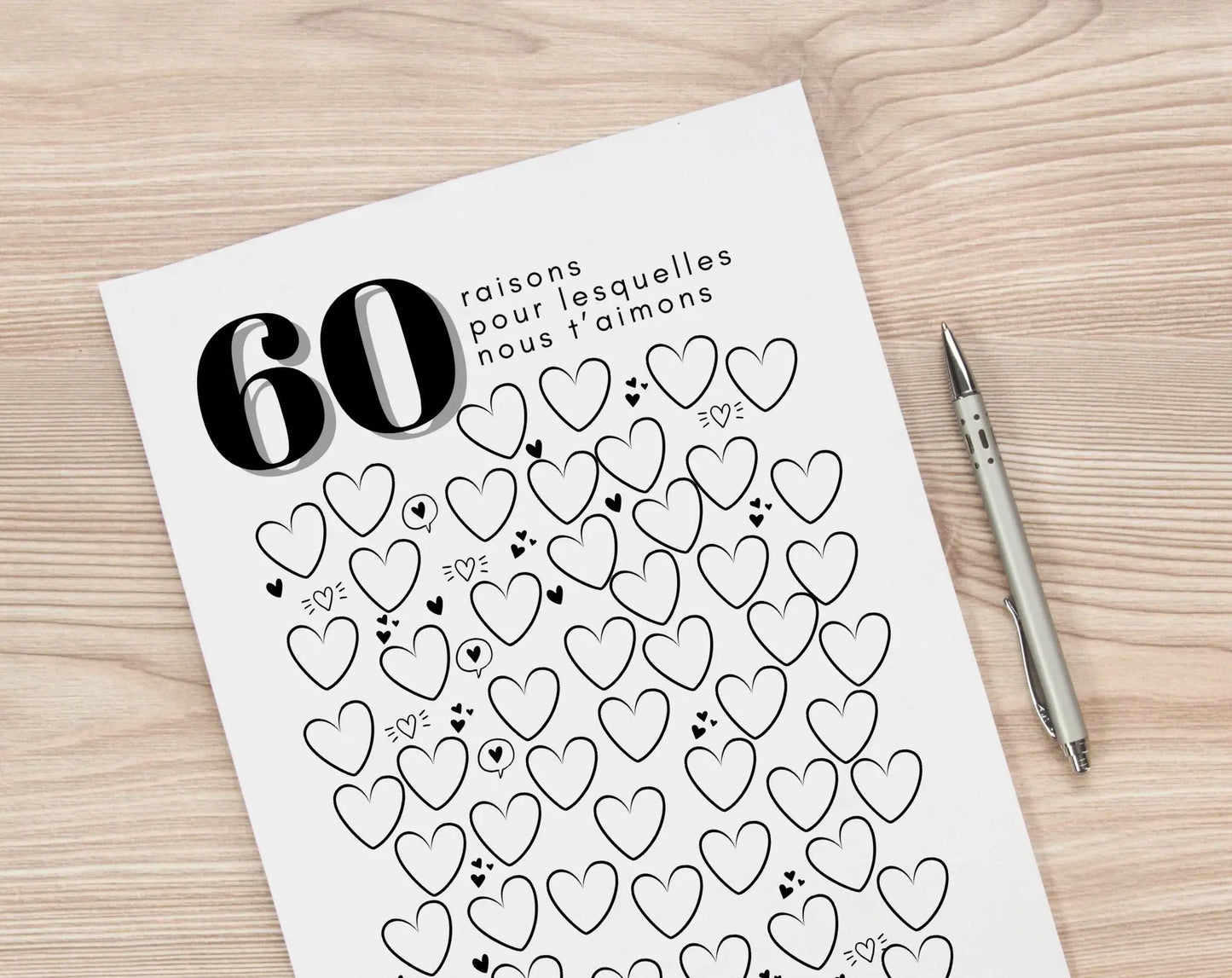 60 ans, c’est bien plus qu’un chiffre : c’est une vie remplie de moments partagés, de souvenirs tendres et de rires. Avec cette Affiche « 60 raisons pour lesquelles nous t’aimons », tu offres bien plus qu’un simple cadeau : tu crées un livre d’or original, à compléter tous ensemble pour dire à la star du jour à quel point elle est aimée.