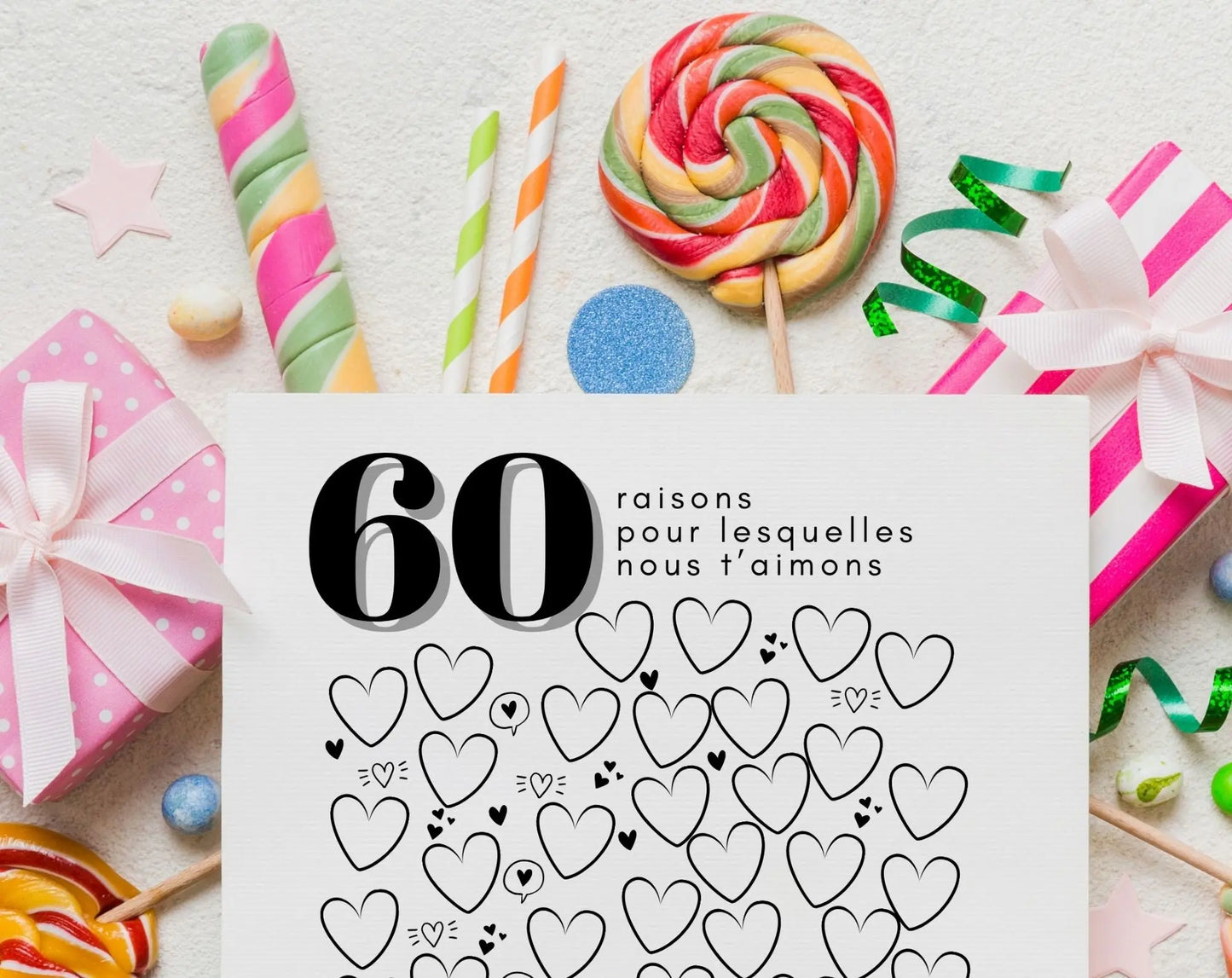 Avec cette Affiche « 60 raisons pour lesquelles nous t’aimons », tu offres bien plus qu’un cadeau : tu offres une déclaration collective, un hommage à une belle vie déjà bien remplie, et un sourire qui dure pour toujours.