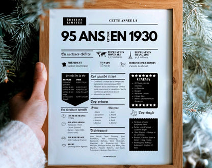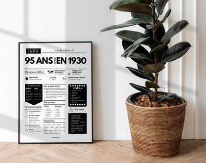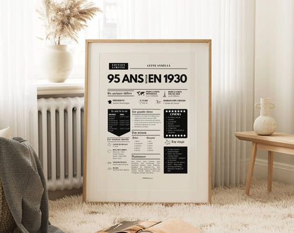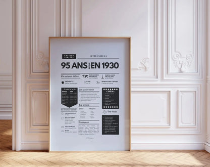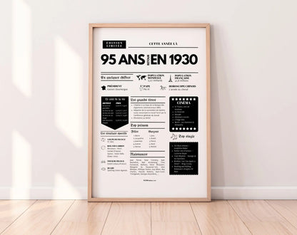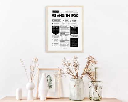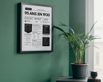 Célébrez 95 ans de souvenirs précieux avec l’Affiche 95 ans retour en 1930, une création unique qui replonge dans les moments forts, les événements marquants et les anecdotes captivantes de cette année historique. Inspirée des journaux d’époque, cette affiche au design rétro est parfaite pour célébrer un anniversaire symbolique tout en ravivant la nostalgie d’une époque révolue.