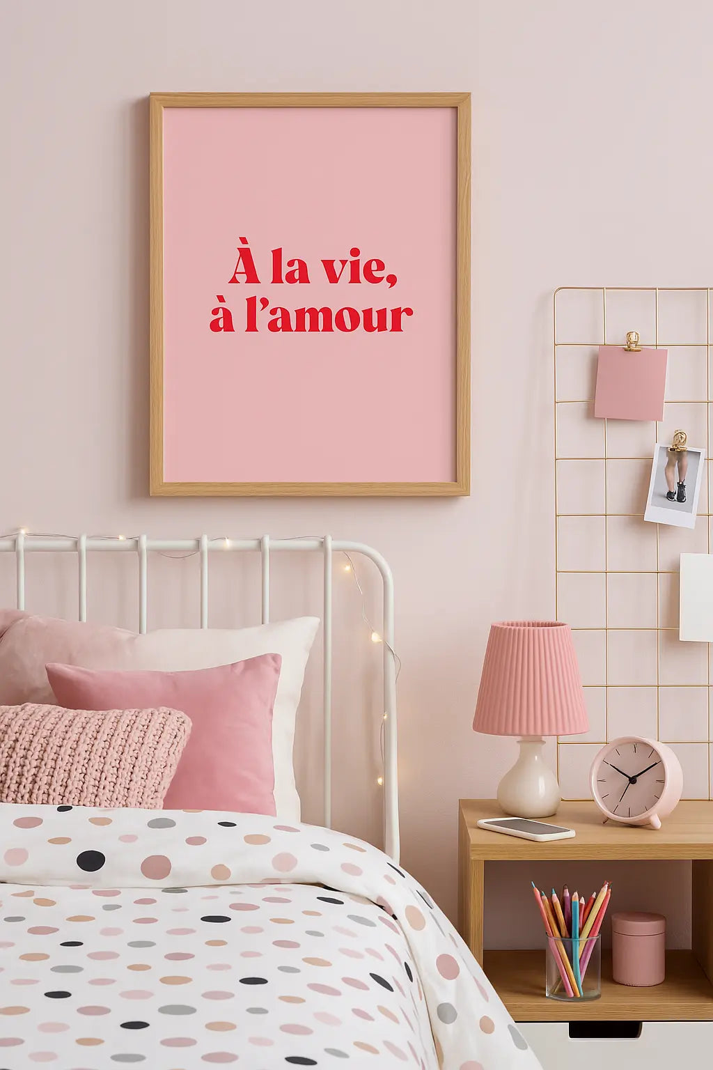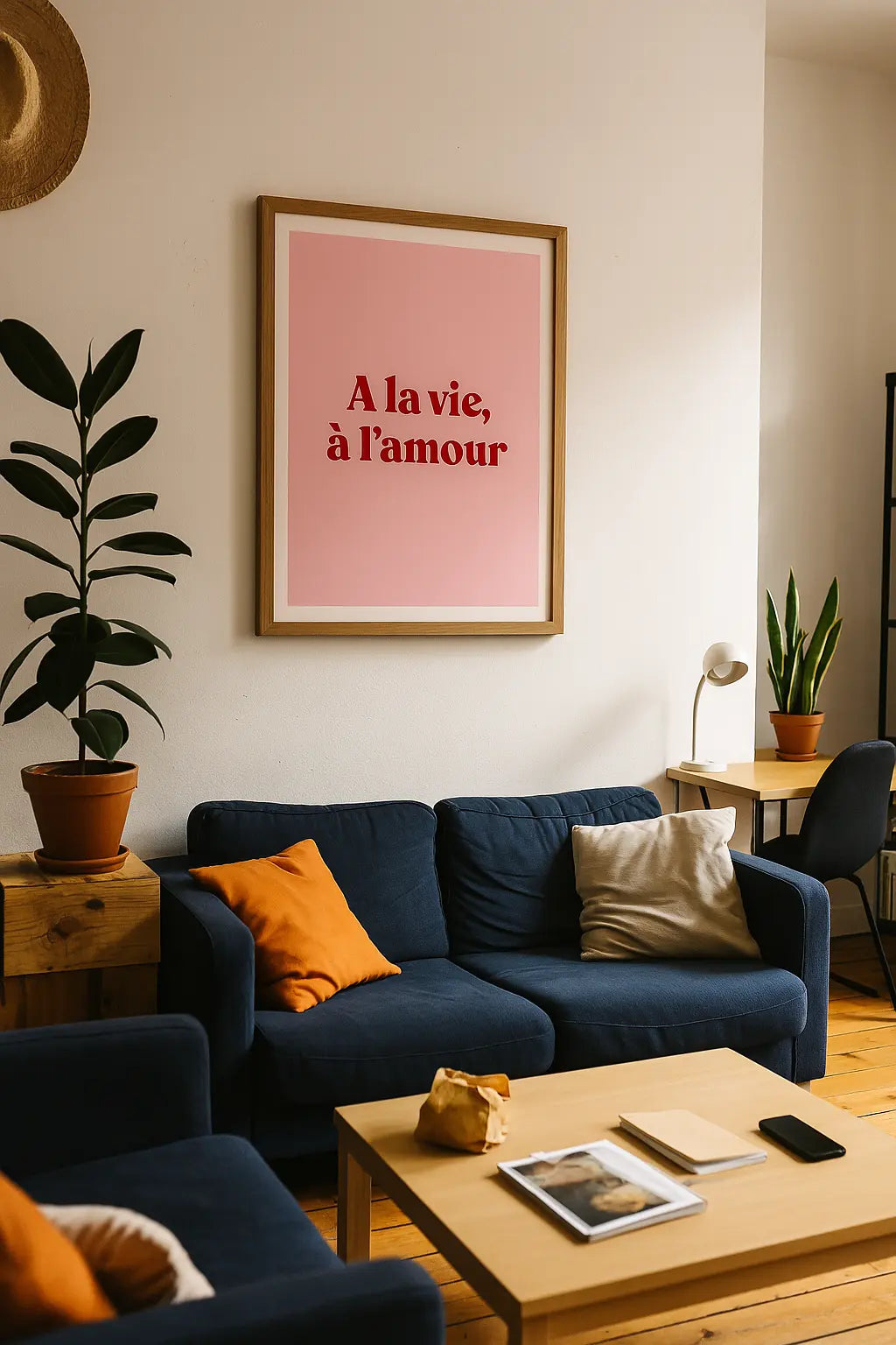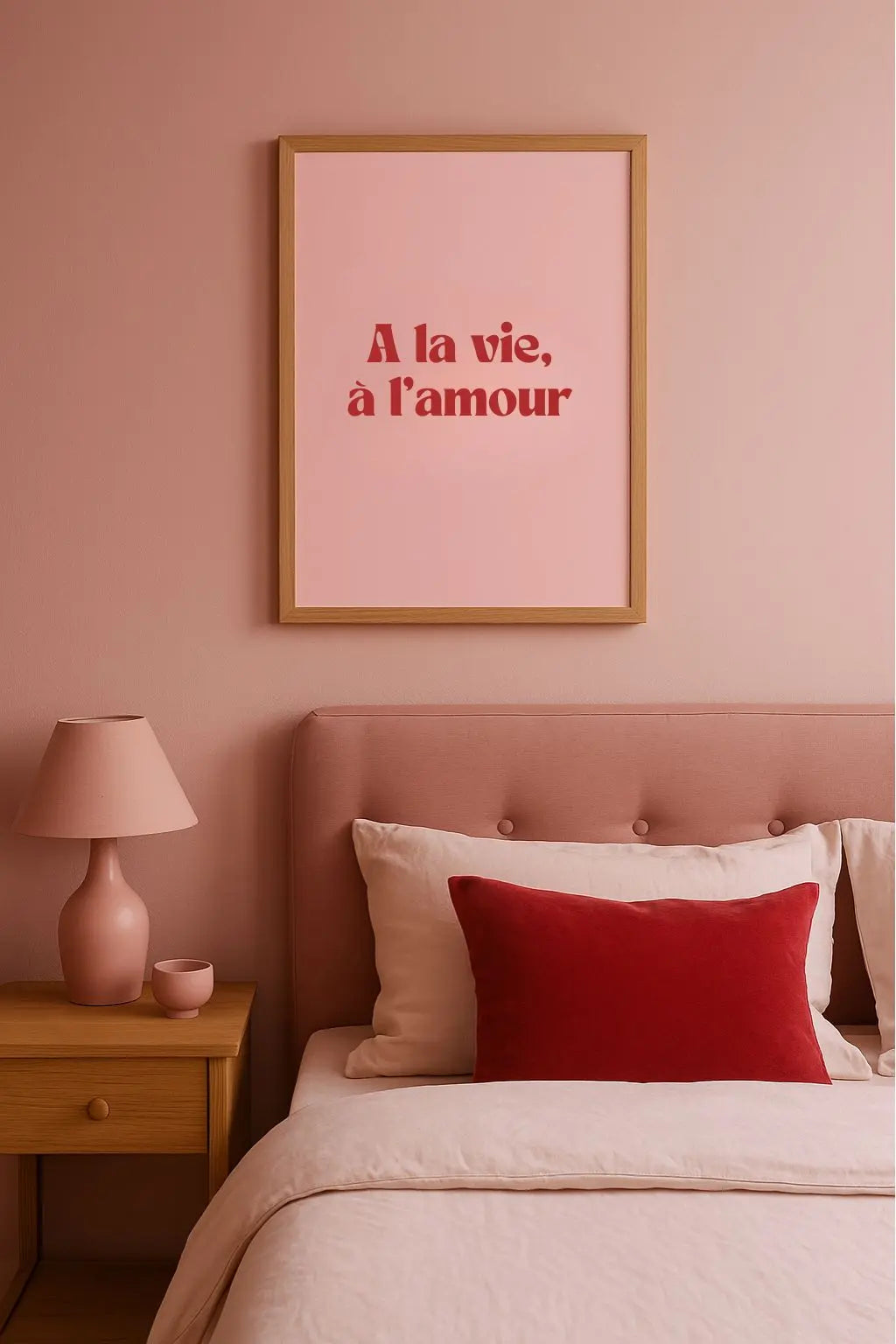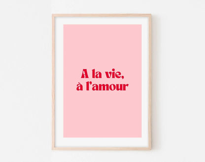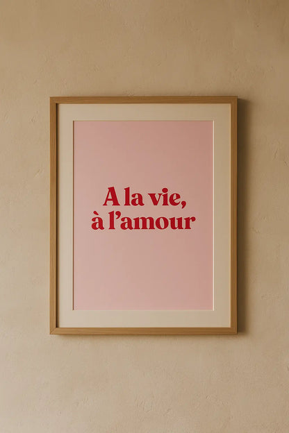 Envie d’une touche de tendresse et de pep’s dans ta déco ? L’affiche « A la vie, à l’amour » est un petit clin d’œil au romantisme assumé, à l’amour léger et à la joie de vivre. Avec son fond rose doux et sa typographie rouge vibrante, elle donne le ton : ici, on célèbre la vie et l’amour sous toutes ses formes.
