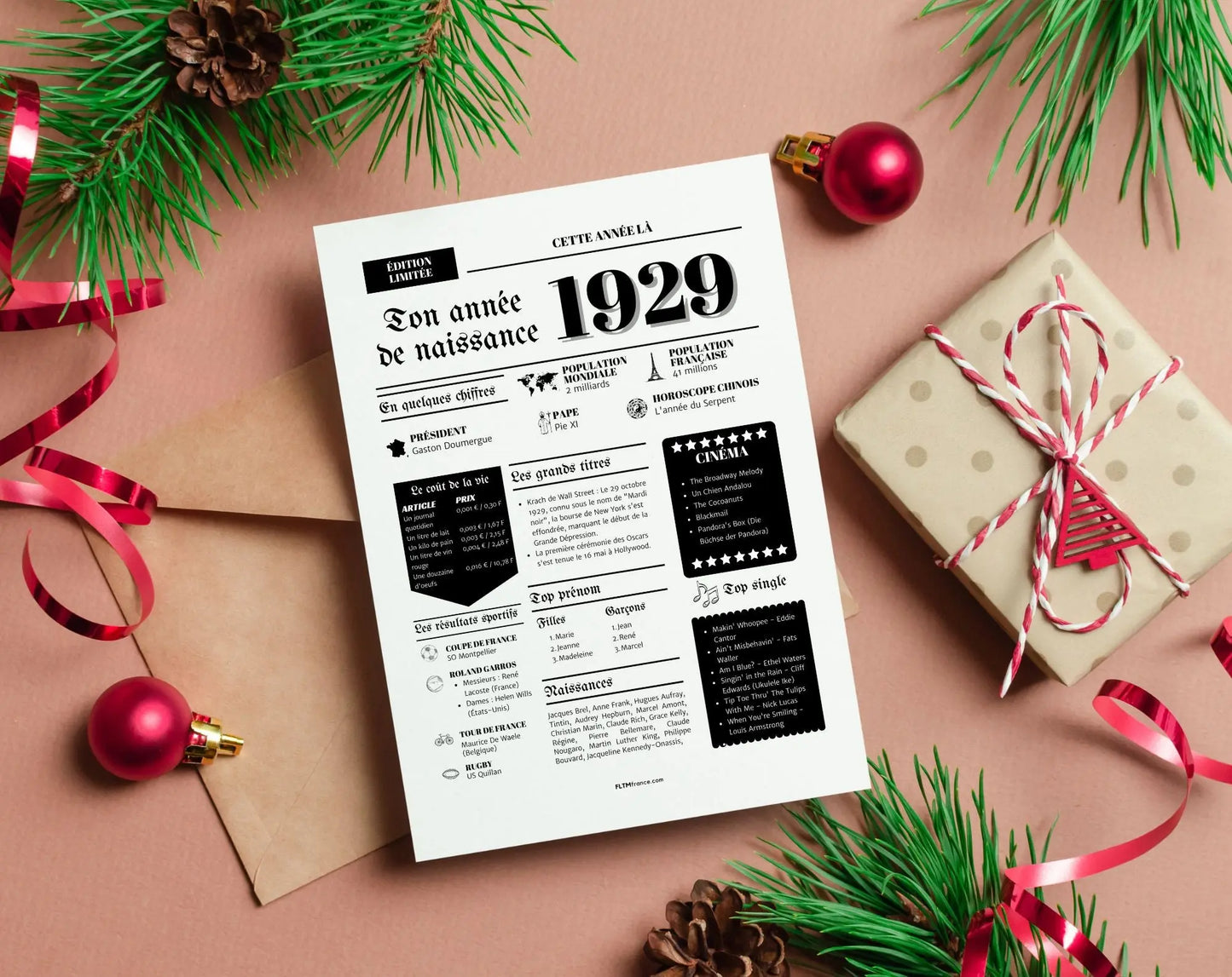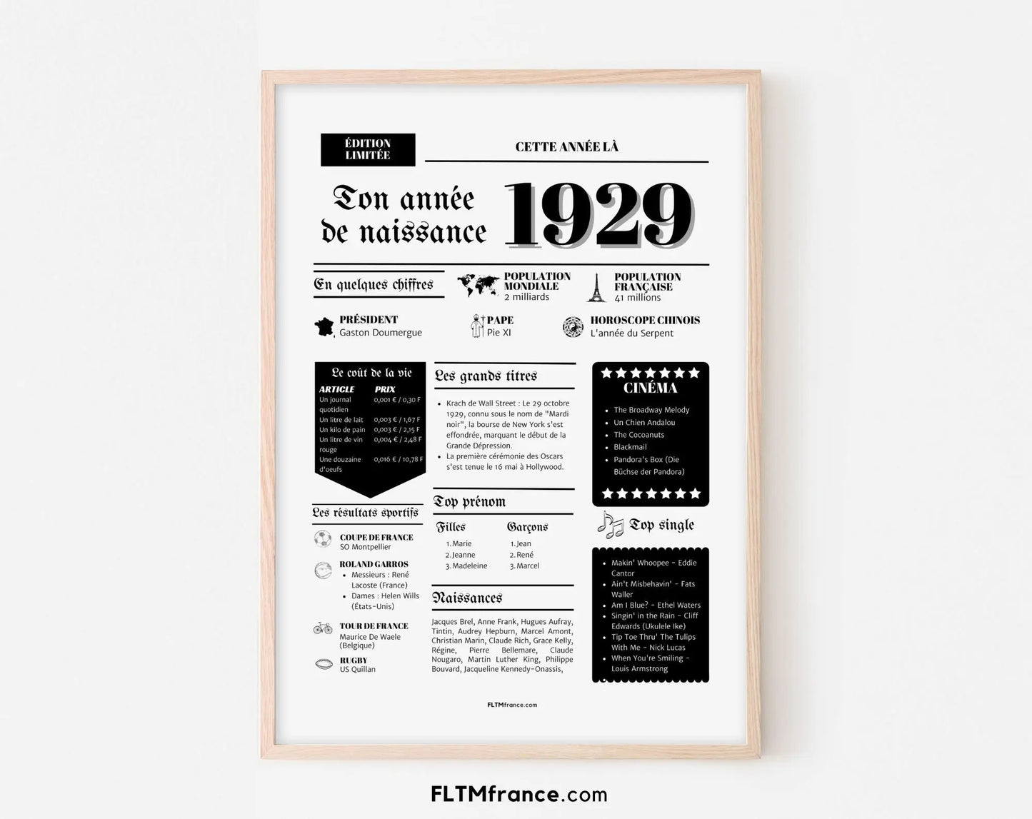 Offrez un cadeau unique et personnalisé avec notre affiche de l'année de naissance 1929. Que ce soit pour un anniversaire, une décoration de fête ou simplement pour se remémorer les événements marquants de cette année, cette affiche est l'idéal. Avec son format A4, elle est facilement adaptable en formats A6, A5, A3, A2, selon vos besoins et vos envies.