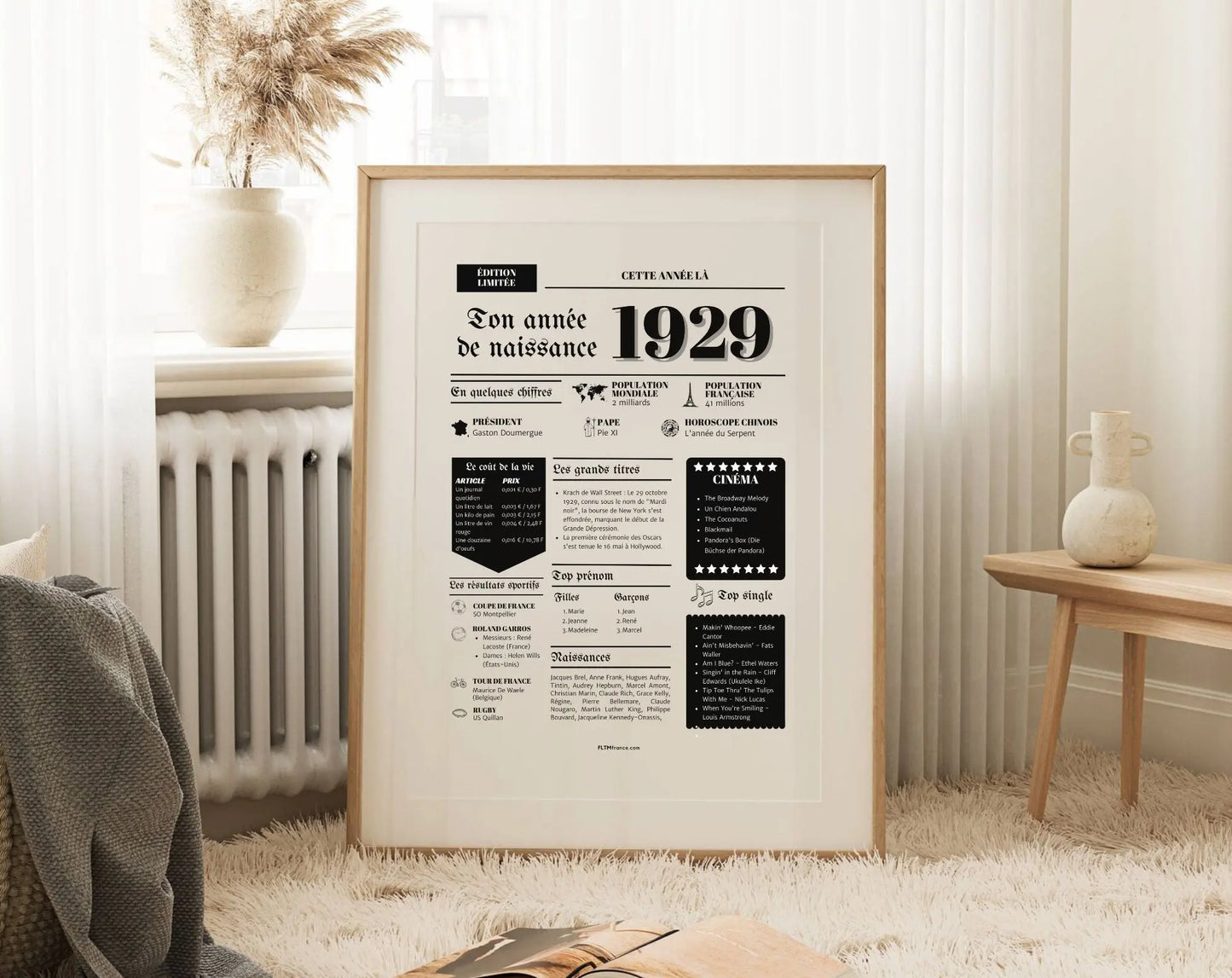 Affiche année de naissance 1929 : cadeau et décoration anniversaire parfaite