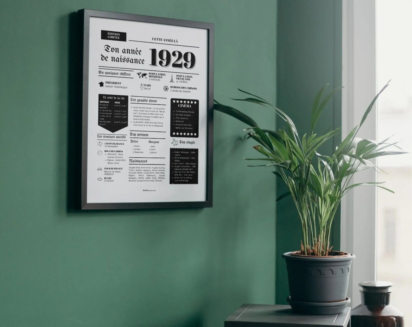 Offrir une affiche de l'année 1929 est bien plus qu'un simple cadeau, c'est offrir un morceau d'histoire. Cette affiche reprend les moments marquants, les faits divers, les célébrités de l'époque et bien plus encore. Elle constitue une excellente pièce de décoration qui ravira les nostalgiques et ceux qui souhaitent célébrer cette année charnière.