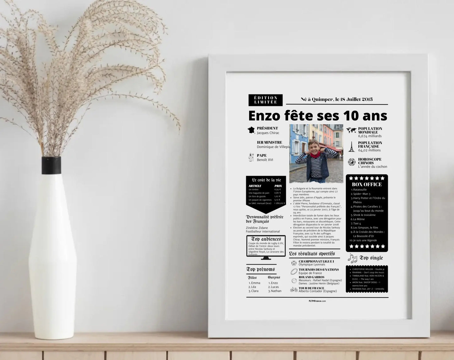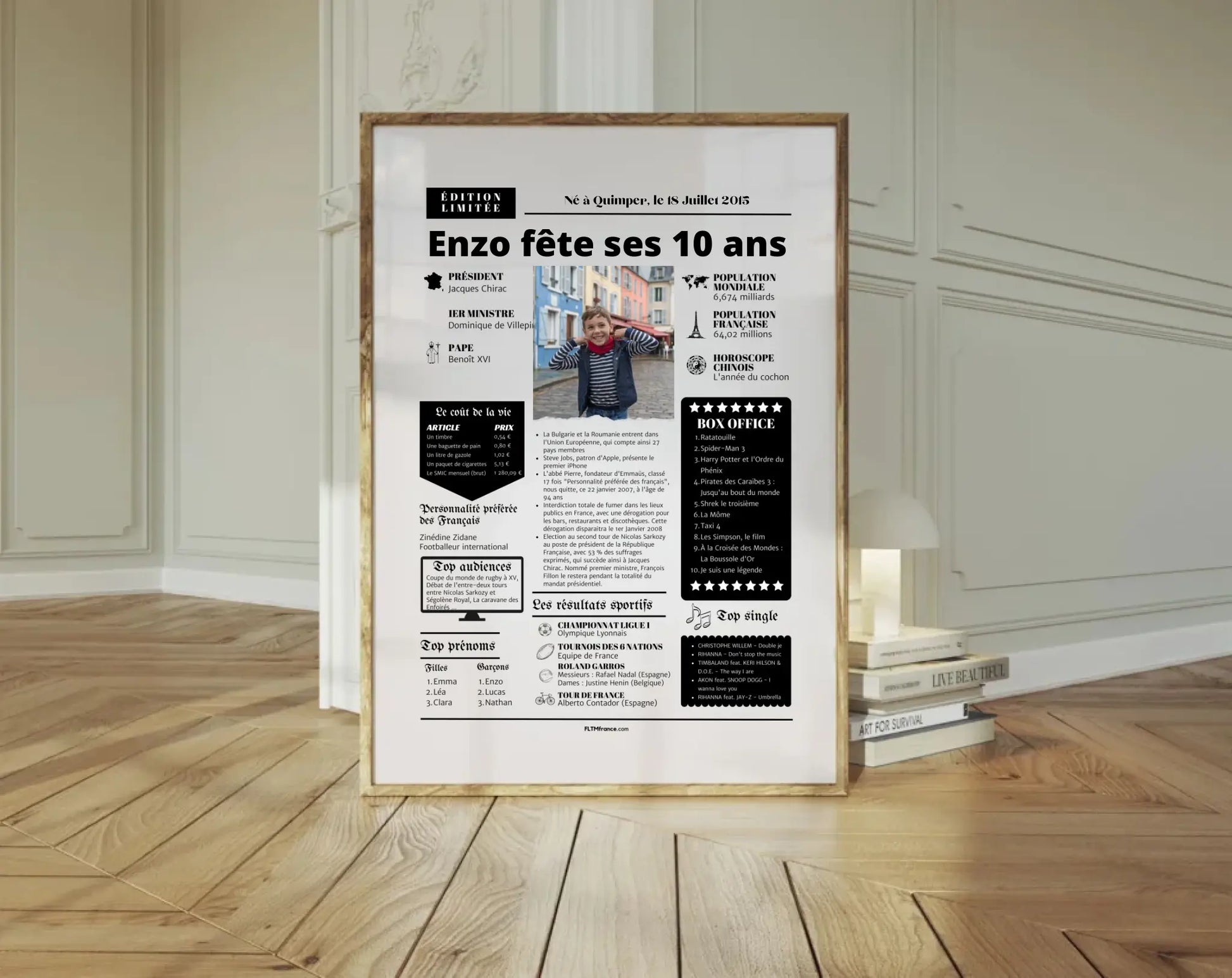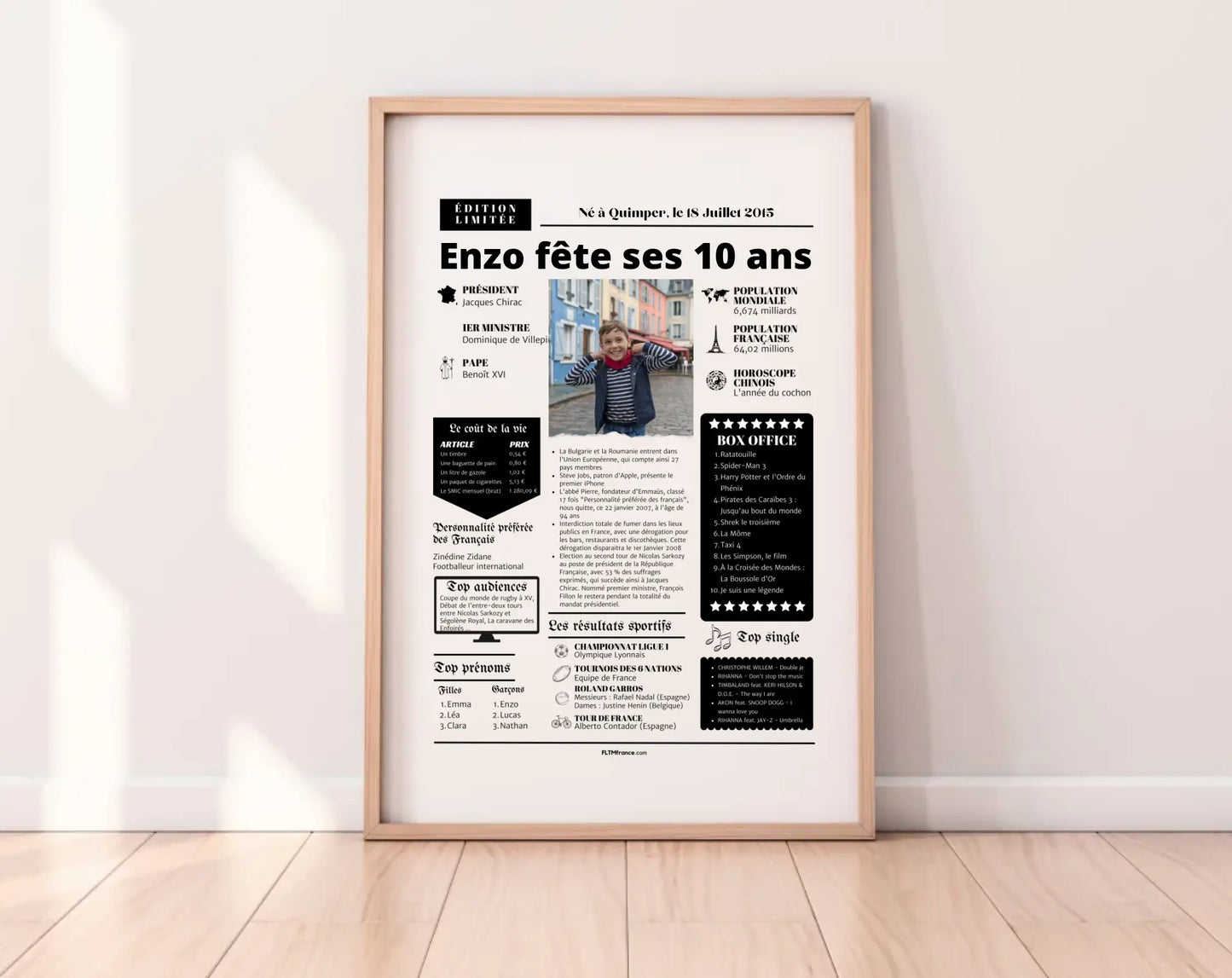 Rien de tel qu'une affiche personnalisée 10 ans pour marquer une décennie de souvenirs. Que ce soit pour un anniversaire, une célébration spéciale ou pour commémorer une décennie, cette affiche unique est le moyen idéal pour capturer et afficher les moments précieux. Conçue sur mesure par nos équipes talentueuses, cette affiche est réalisée en seulement 24 à 48 heures. Avec une photo, le prénom, le lieu et la date de naissance fournis, nous créons une œuvre d'art qui raconte une histoire.