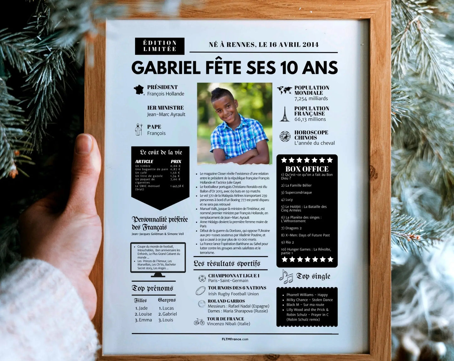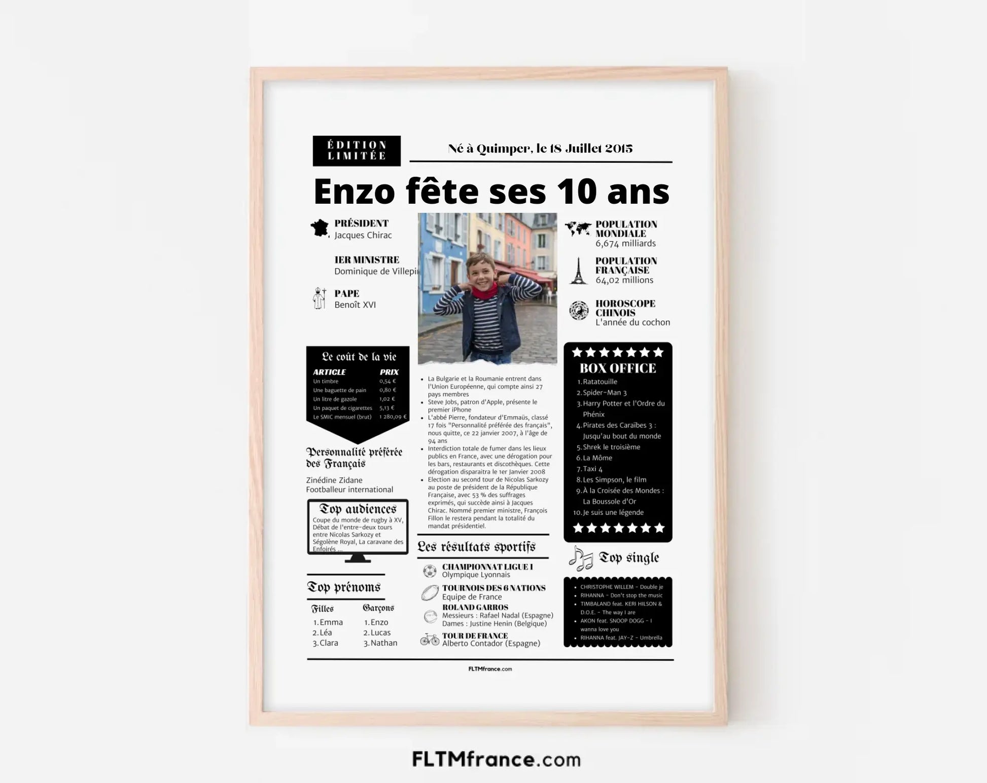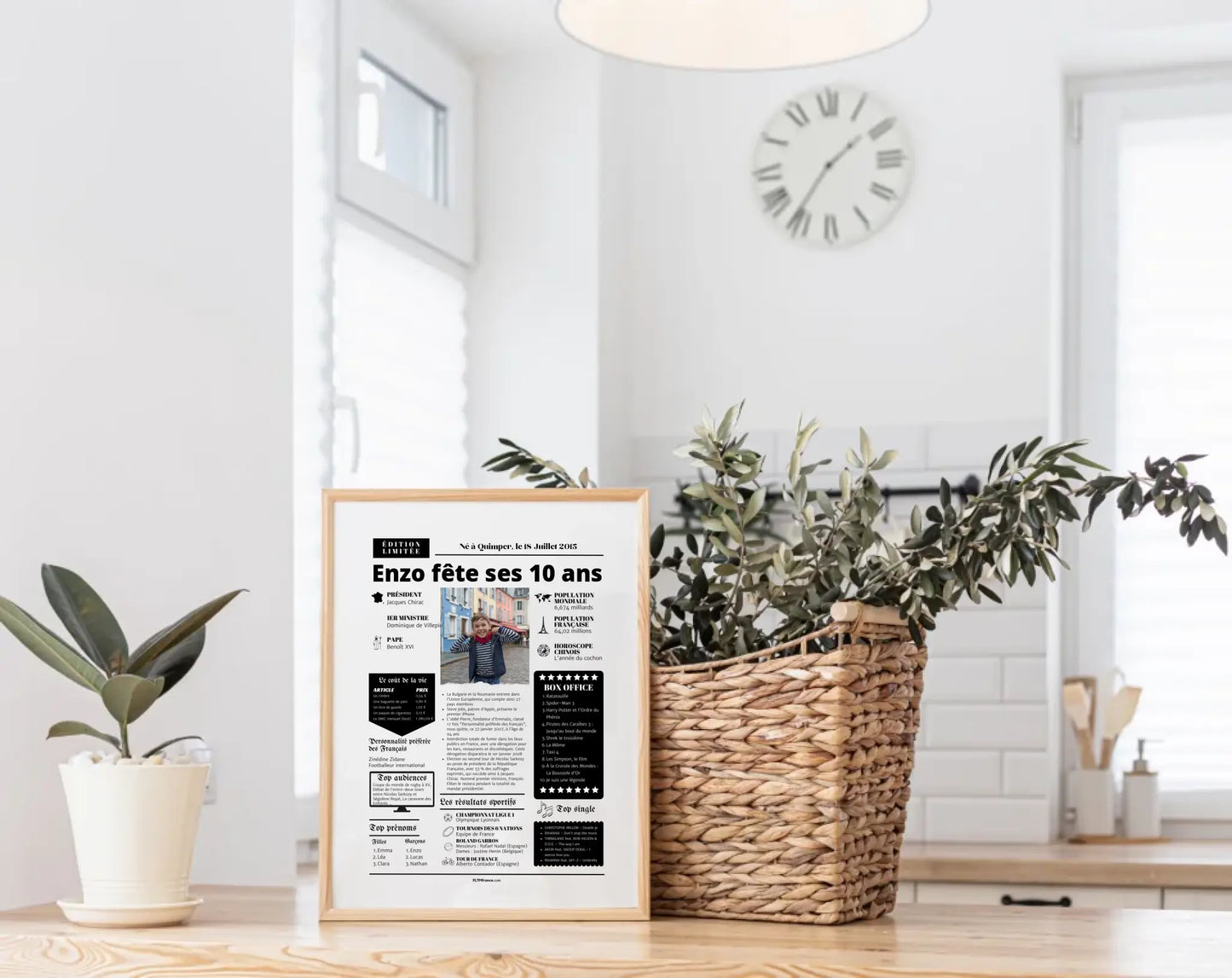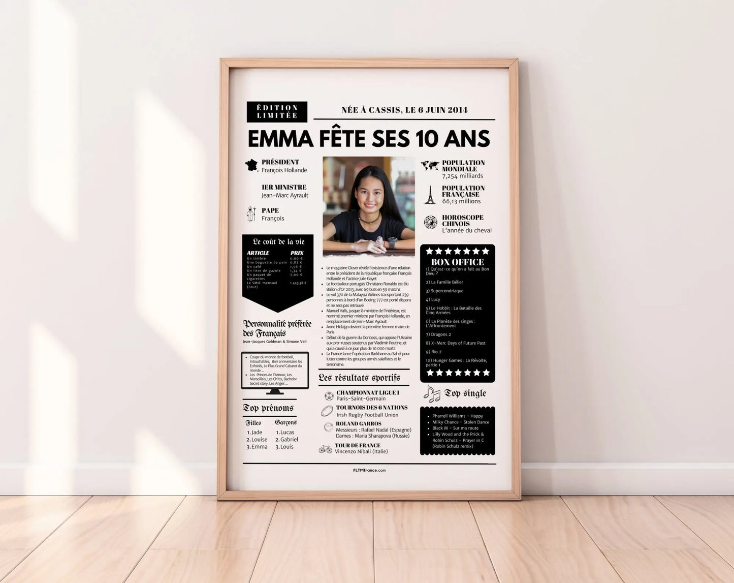Rien de tel qu'une affiche personnalisée 10 ans pour marquer une décennie de souvenirs. Que ce soit pour un anniversaire, une célébration spéciale ou pour commémorer une décennie, cette affiche unique est le moyen idéal pour capturer et afficher les moments précieux. Conçue sur mesure par nos équipes talentueuses, cette affiche est réalisée en seulement 24 à 48 heures. Avec une photo, le prénom, le lieu et la date de naissance fournis, nous créons une œuvre d'art qui raconte une histoire.