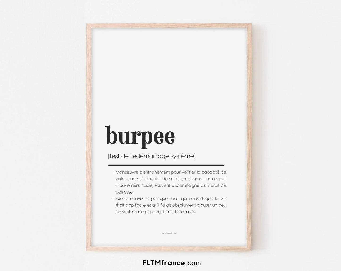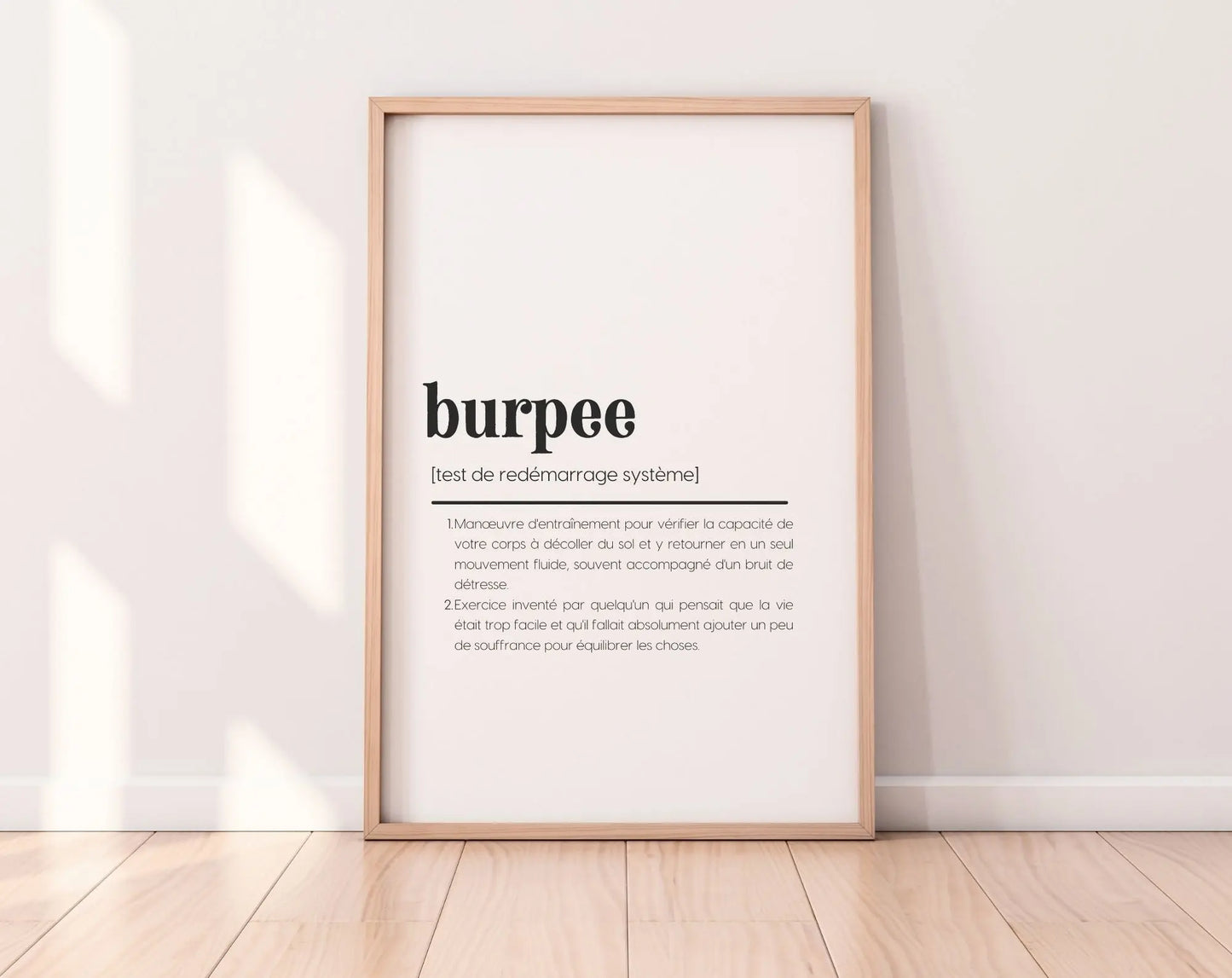 L'affiche burpee n'est pas juste un poster ; c'est une source d'inspiration quotidienne. Avec son design humoristique, elle attire le regard et adoucit les souffrances liées à l'exercice, rappelant aux sportifs l'importance de l'humour dans l'effort. Voici ses principales caractéristiques :