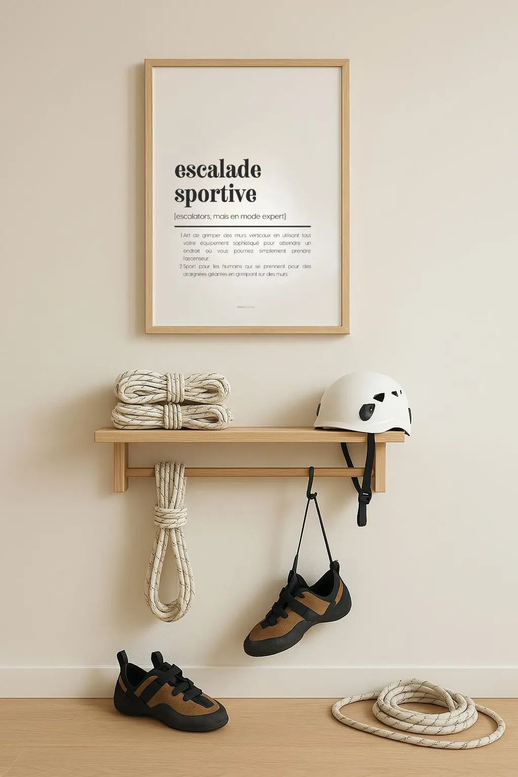 Tu cherches une déco drôle et originale pour un(e) fan de grimpe ? Cette affiche “Définition escalade sportive” à imprimer est faite pour ça ! Parfaite pour décorer un mur avec humour, elle joue sur les codes des définitions décalées pour décrire avec tendresse (et réalisme) les grimpeurs passionnés. Une idée cadeau sympa, déco et fun pour un sportif ou une sportive adepte des parois verticales !