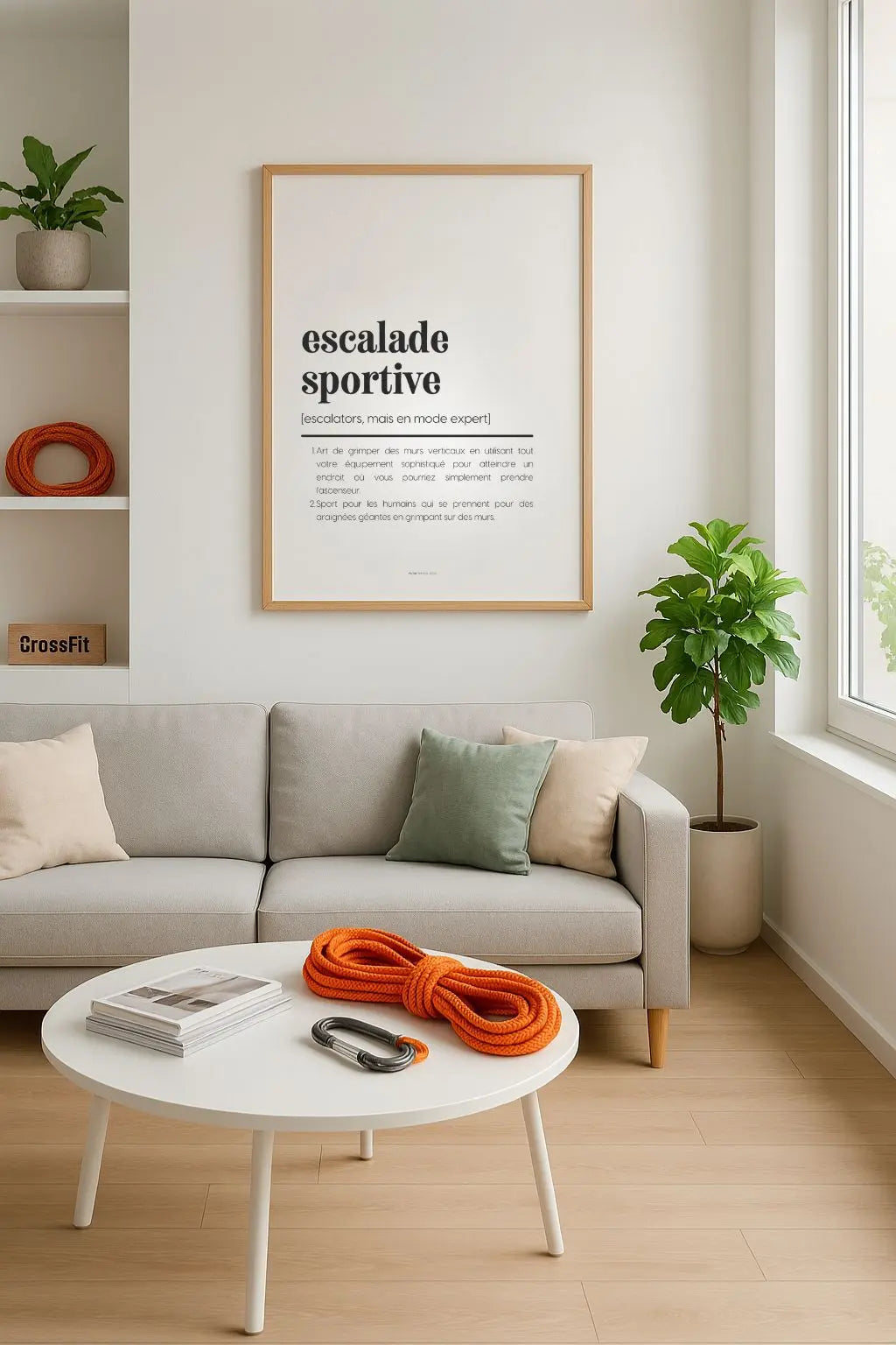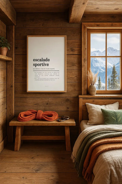 Avec cette affiche “Définition escalade sportive”, tu offres ou t’offres un clin d’œil déco drôle, stylé et 100 % grimpeur-friendly. Que ce soit dans une salle, un salon ou un refuge de montagne, elle fera sourire à chaque regard. Un petit cadeau qui fait toujours mouche chez les accros de la paroi !