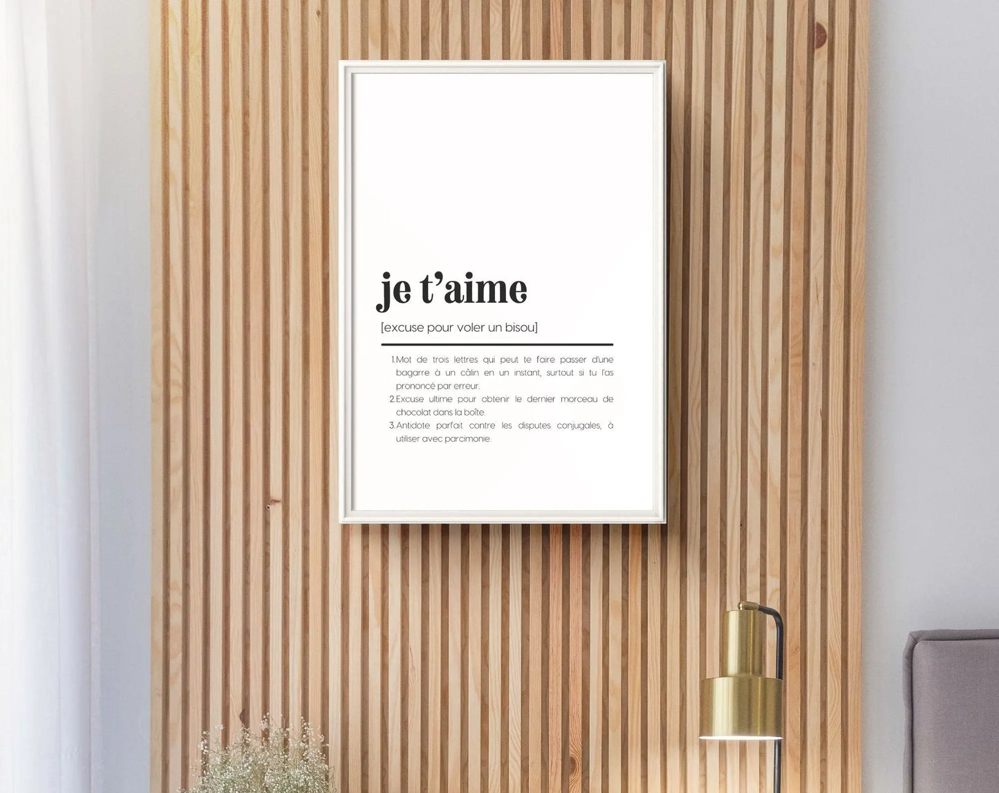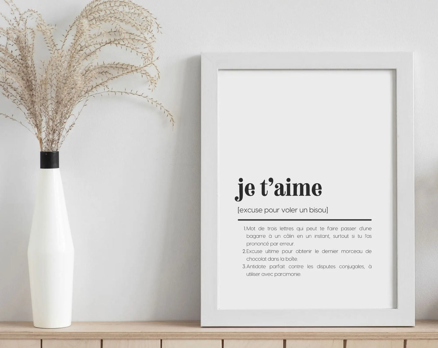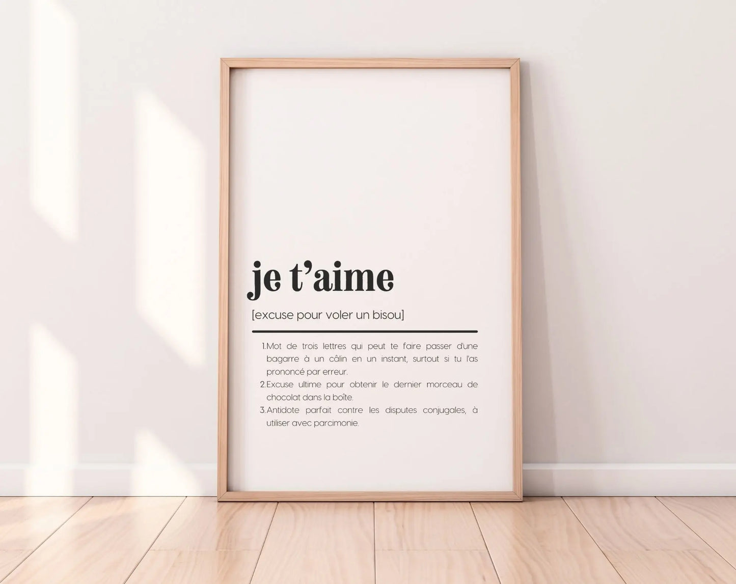 En somme, notre affiche Définition de Je t'aime est bien plus qu'un simple élément de décoration. Elle est une ode à l'amour sous toutes ses formes, un pont entre l'expression sérieuse des sentiments et la légèreté de l'humour. Parfaite en cadeau, comme moyen d'expression unique, ou simplement pour ajouter une note d'amour et d'humour à votre quotidien, elle rappelle l'importance de chérir et de célébrer les liens qui nous unissent.