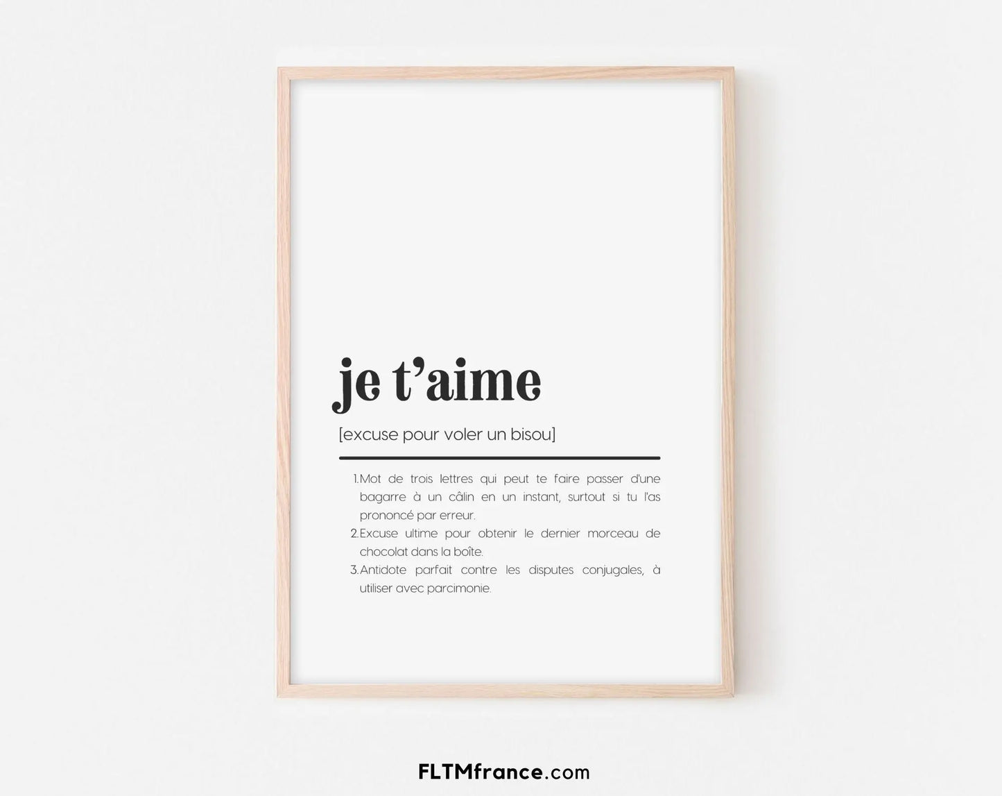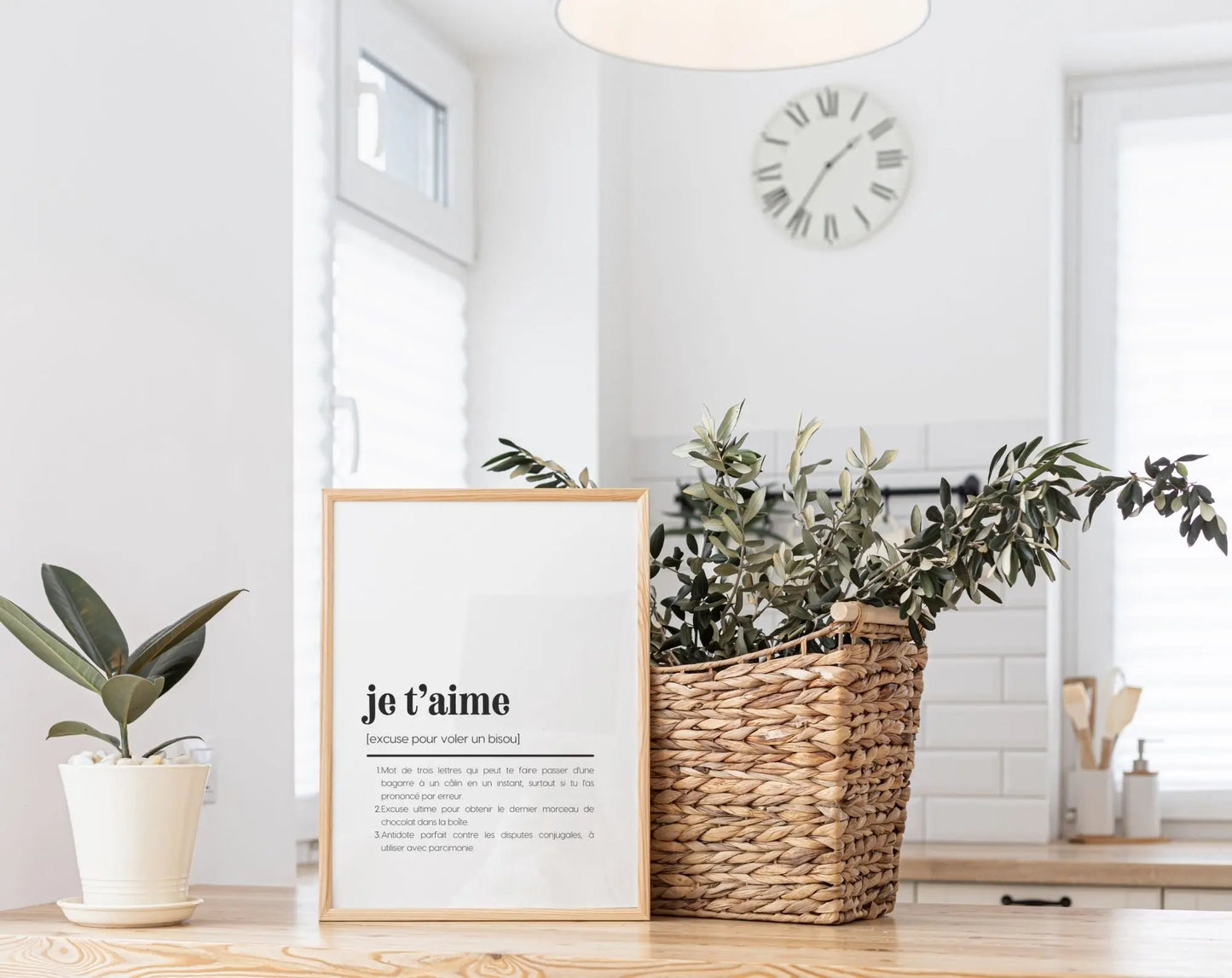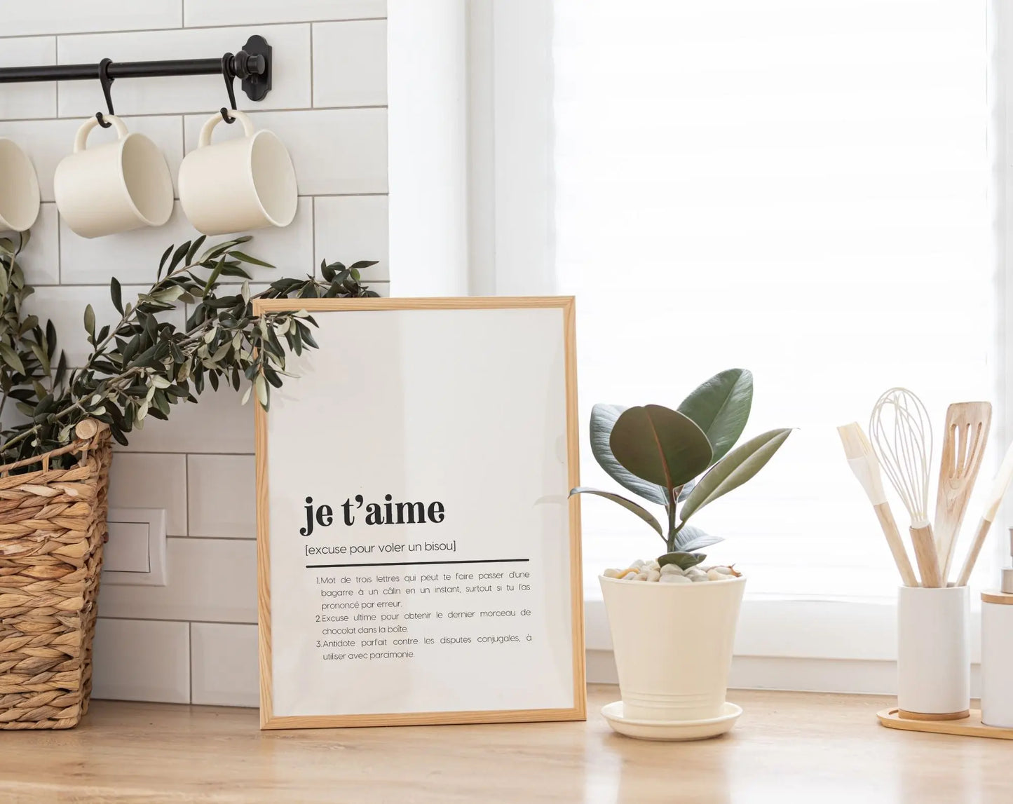 En somme, notre affiche Définition de Je t'aime est bien plus qu'un simple élément de décoration. Elle est une ode à l'amour sous toutes ses formes, un pont entre l'expression sérieuse des sentiments et la légèreté de l'humour. Parfaite en cadeau, comme moyen d'expression unique, ou simplement pour ajouter une note d'amour et d'humour à votre quotidien, elle rappelle l'importance de chérir et de célébrer les liens qui nous unissent.