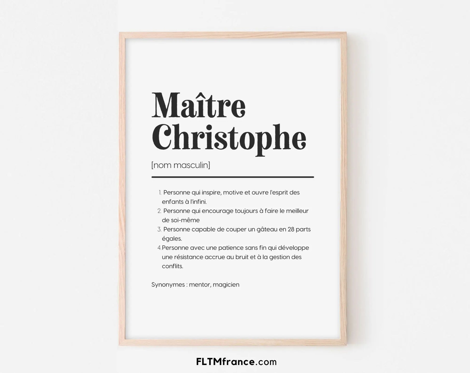 Tu cherches un cadeau original pour le maître de ton enfant ? Une idée à la fois drôle, touchante et facile à offrir ? Cette affiche définition personnalisée de maître est faite pour toi. Imaginée comme une page de dictionnaire, elle transforme les qualités uniques de ce maître en une définition aussi émouvante qu’inoubliable.
