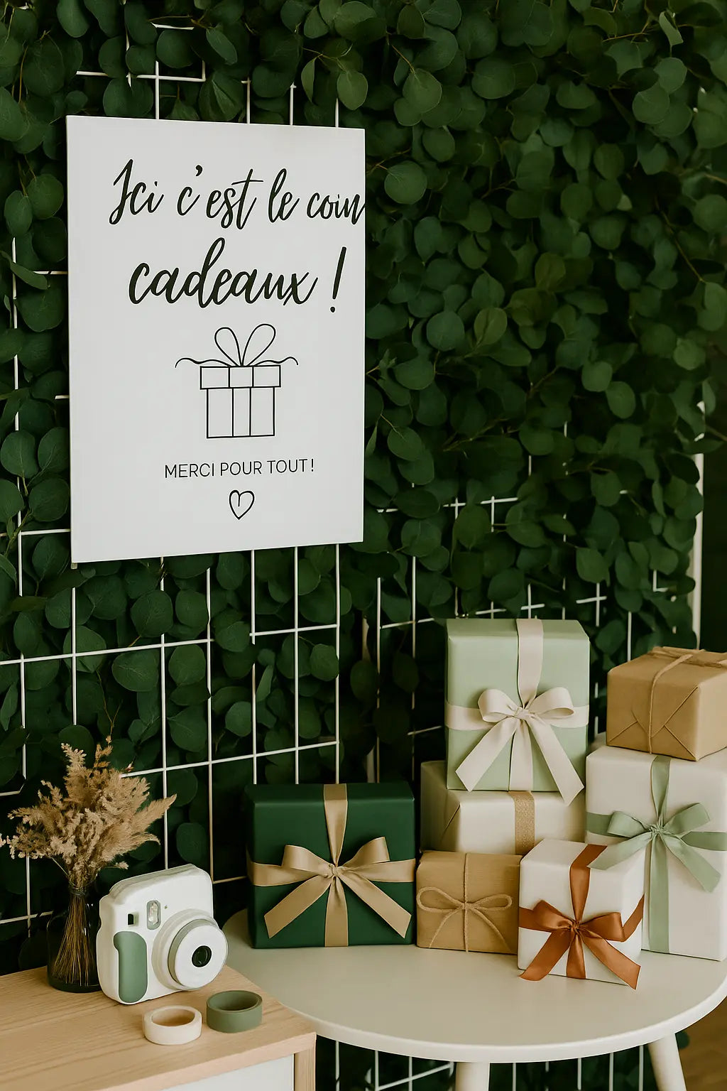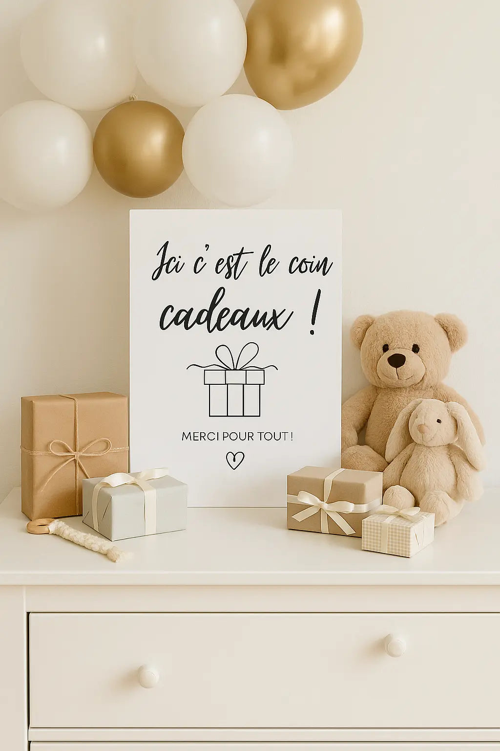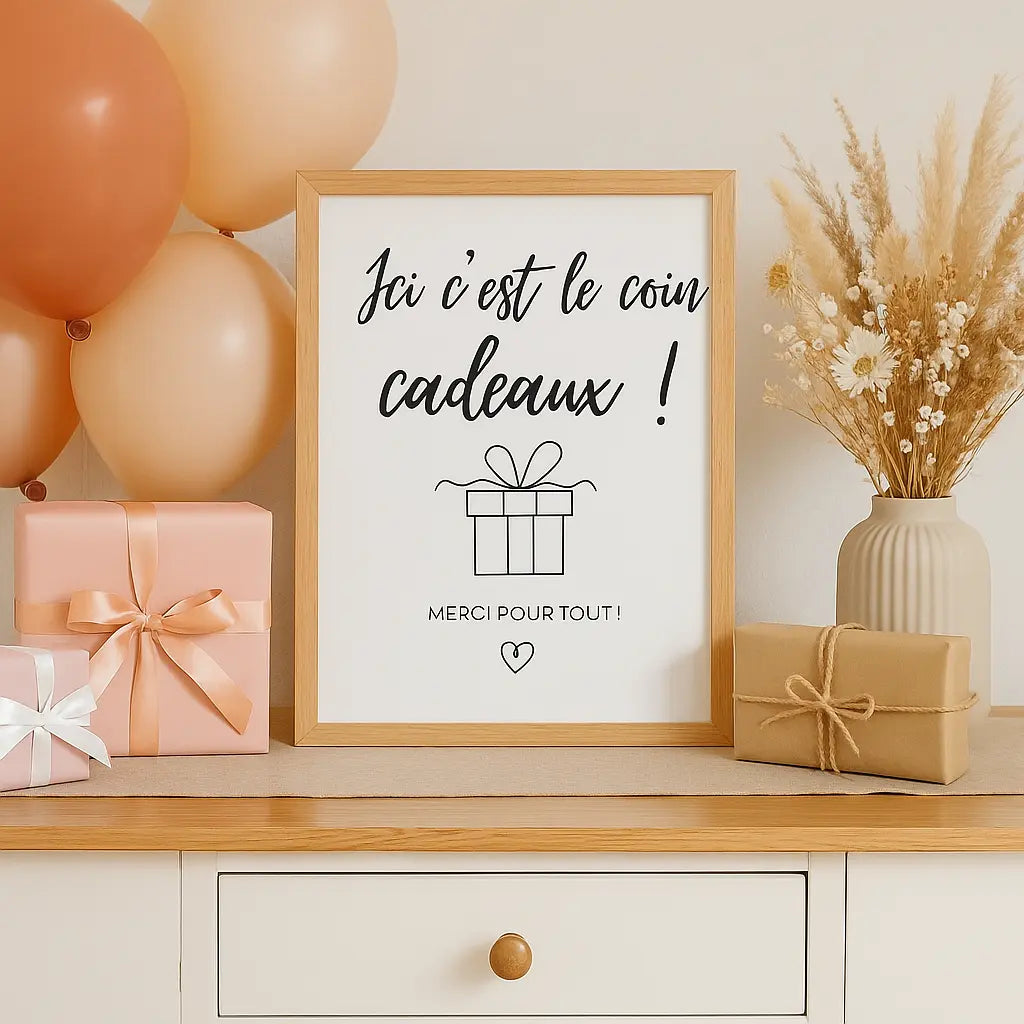 Avec cette affiche “Ici c’est le coin cadeaux”, tu proposes un espace lisible, soigné et accueillant dès l’arrivée des invités. Elle facilite l’organisation, met en valeur les petites attentions, et s’intègre harmonieusement dans ta décoration de fête. Un petit mot visuel qui change tout !