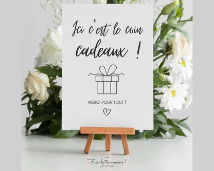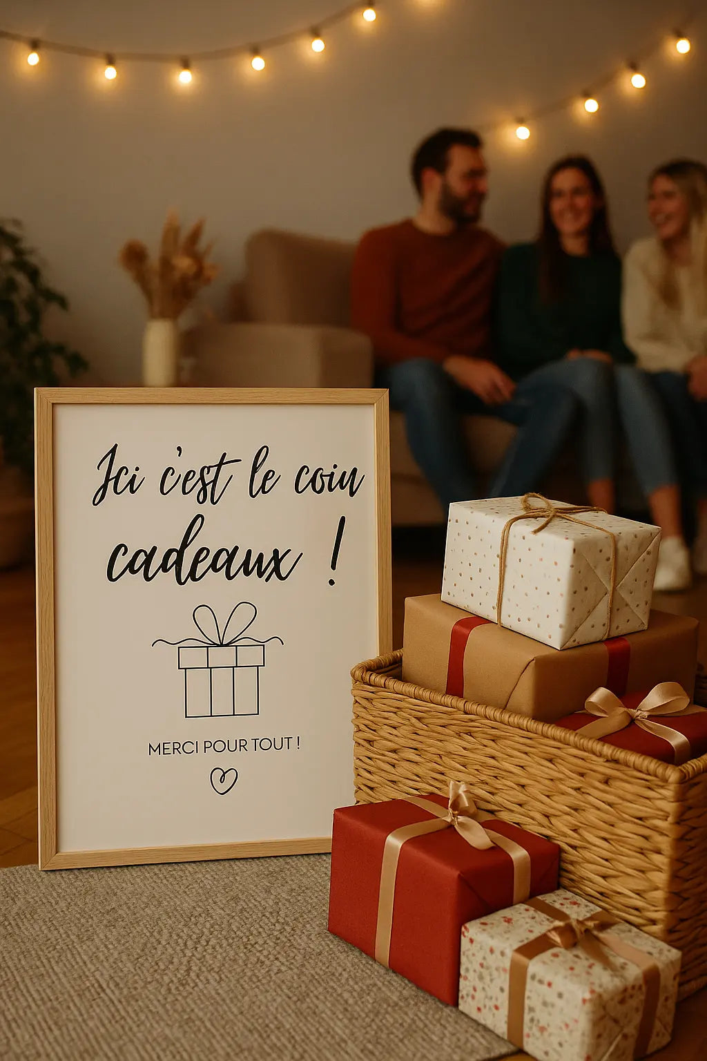 Affiche coin cadeaux, bonne idée pour organiser l’espace fête, joli design.