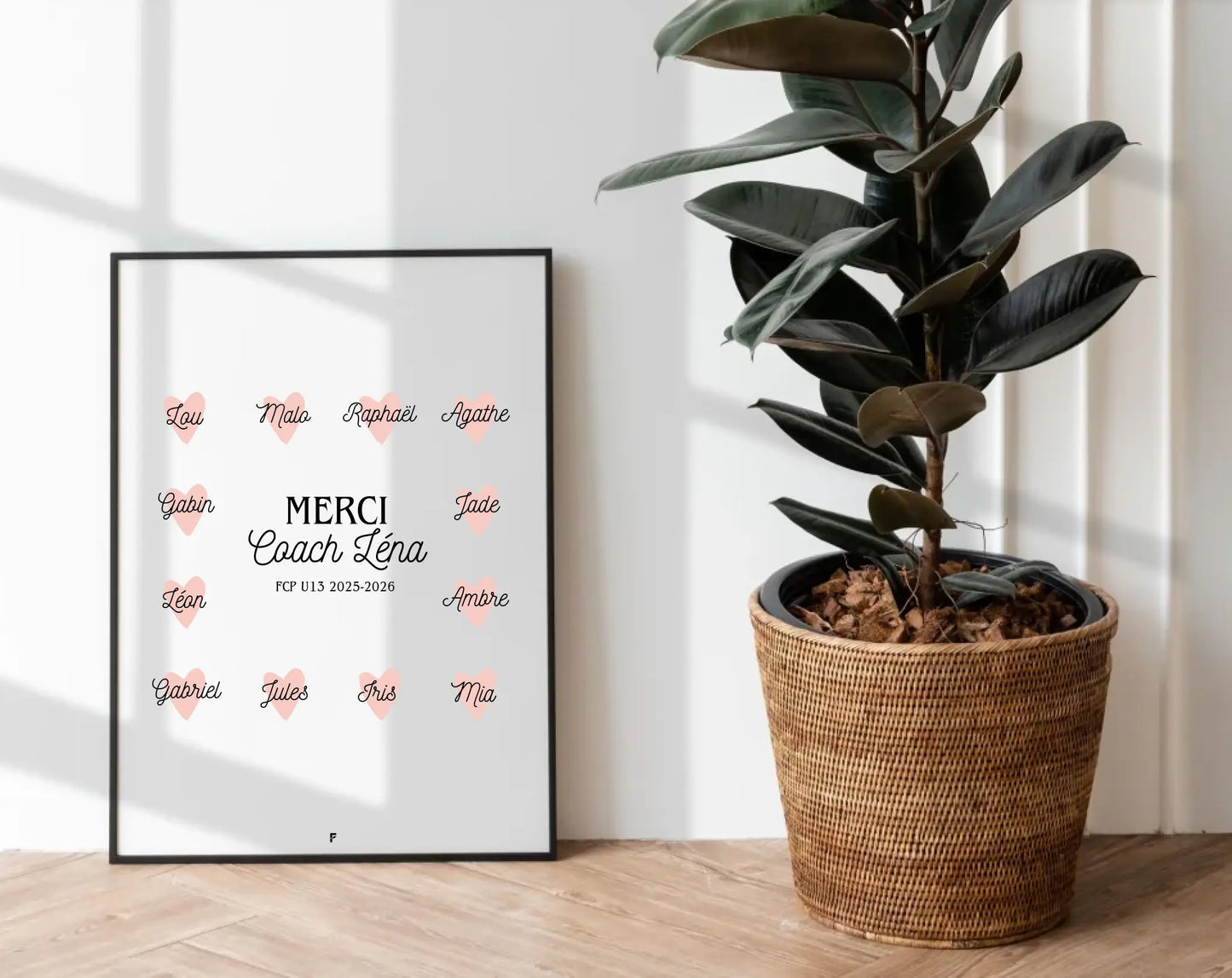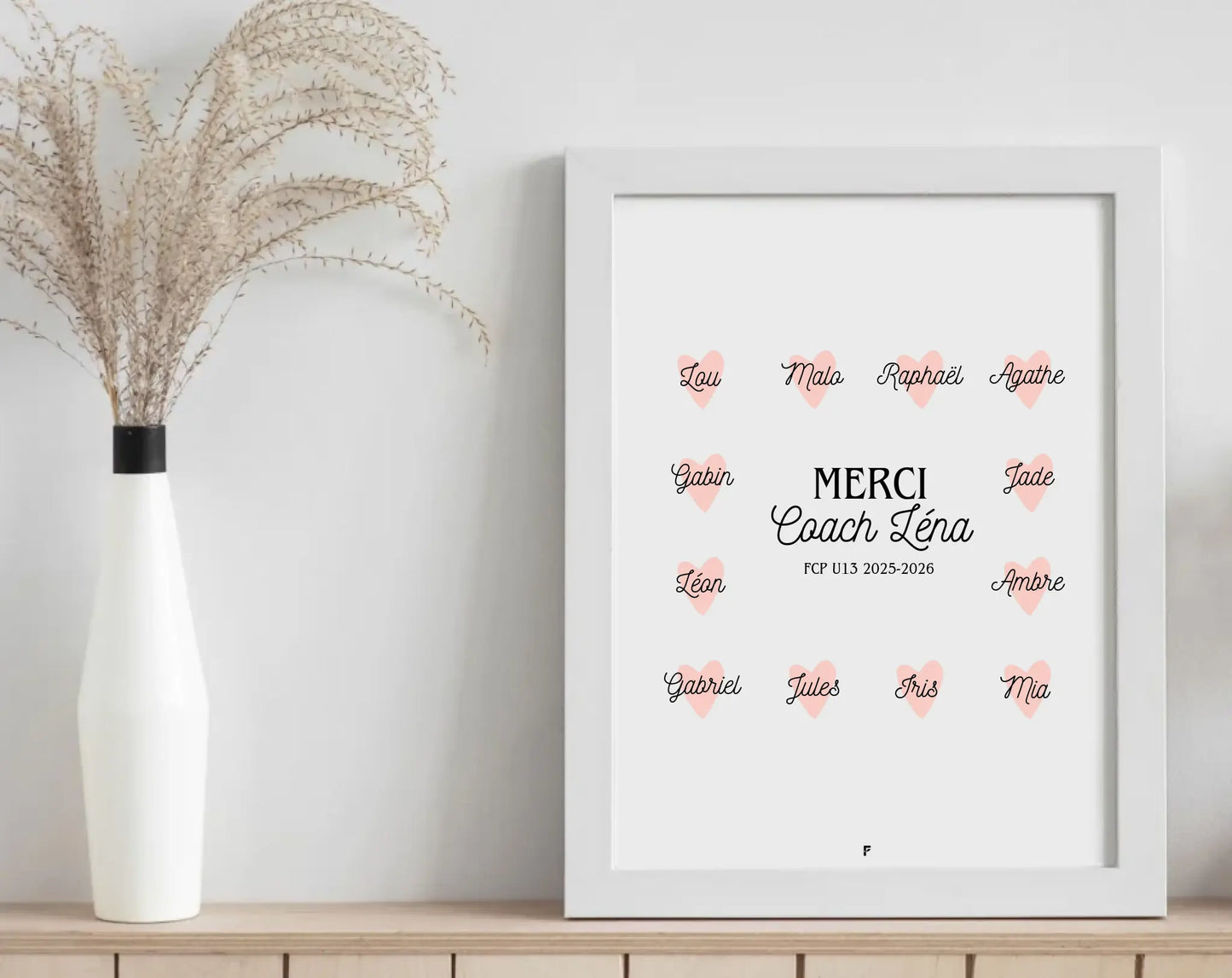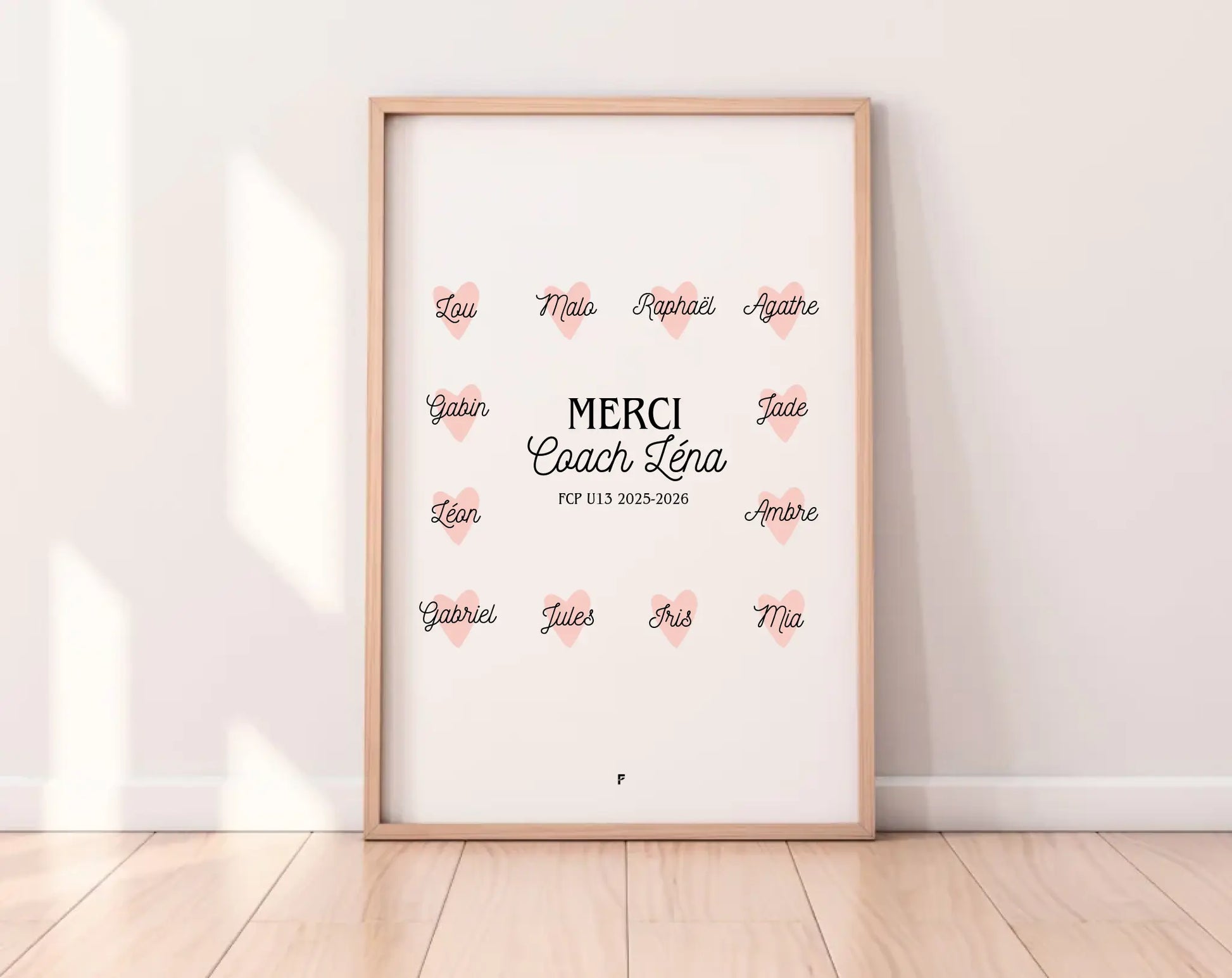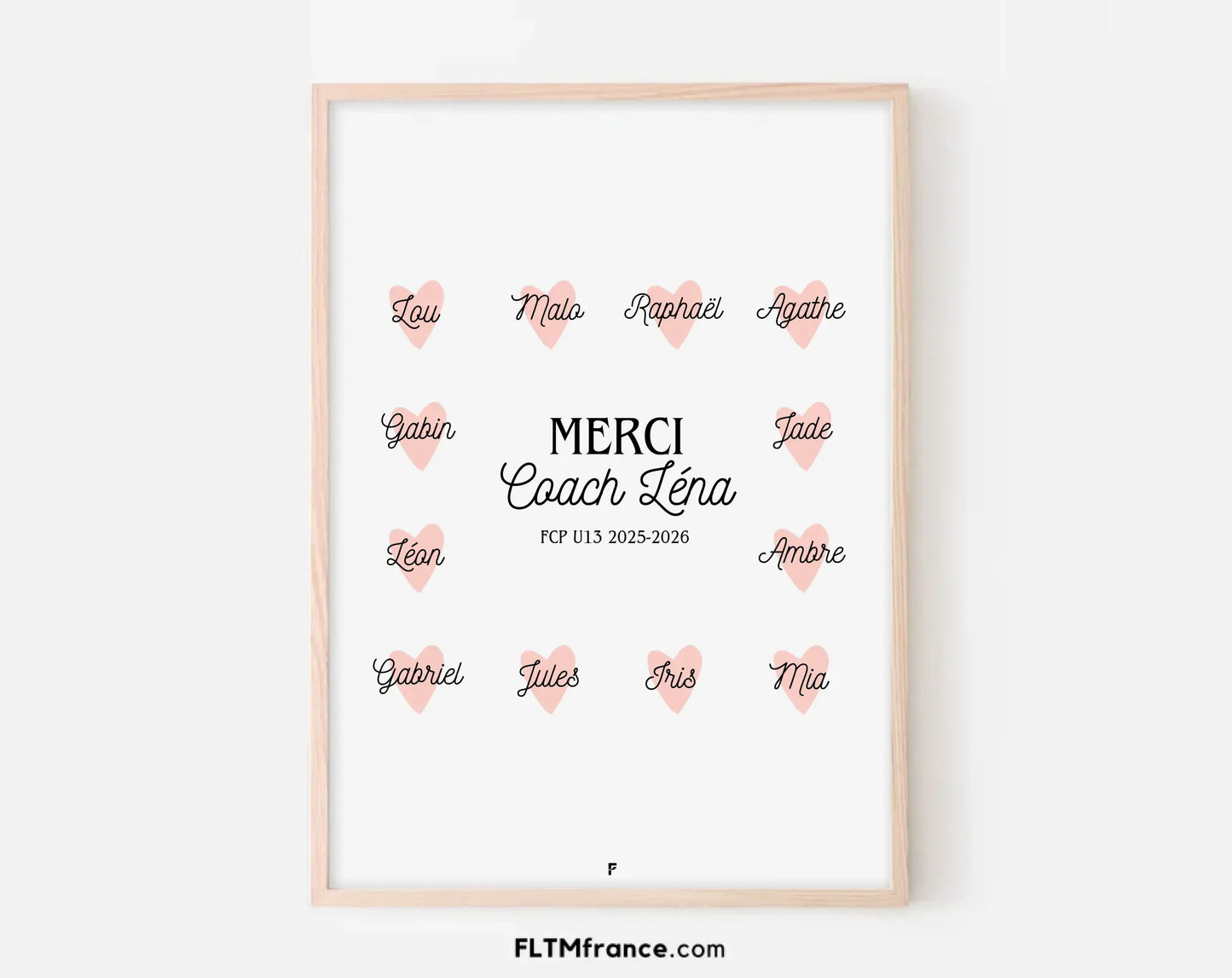 Une année de sport, de défis et de dépassement de soi mérite un grand MERCI ! Offre à ton coach un cadeau symbolique et rempli d’émotion avec cette affiche personnalisée "Merci Coach". Chaque prénom est joliment intégré dans un petit cœur, pour représenter toute l’équipe ou le groupe d’entraînement. Parfaite en fin de saison, pour un tournoi, ou juste pour remercier ce coach qui a tout donné.