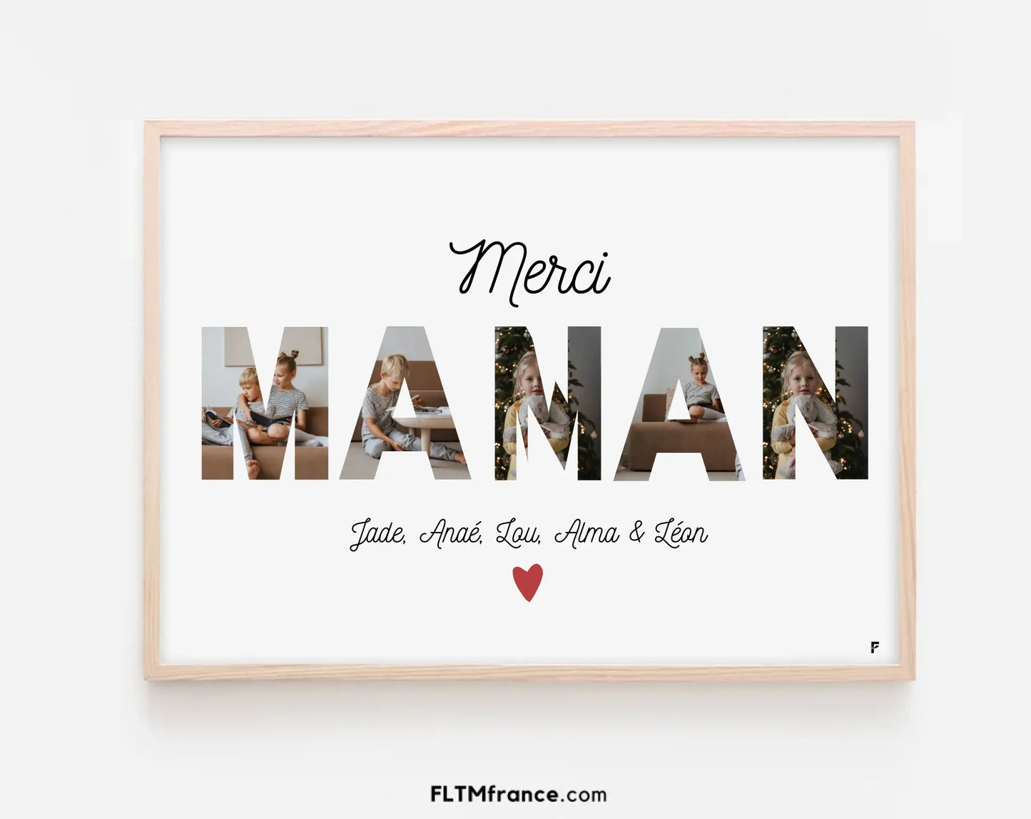 Offre à ta maman un souvenir inoubliable avec cette affiche personnalisée "Merci Maman". Avec les photos intégrées dans le mot "MAMAN", les prénoms des enfants et un petit mot tendre, cette création devient un cadeau unique et chargé d’émotion.