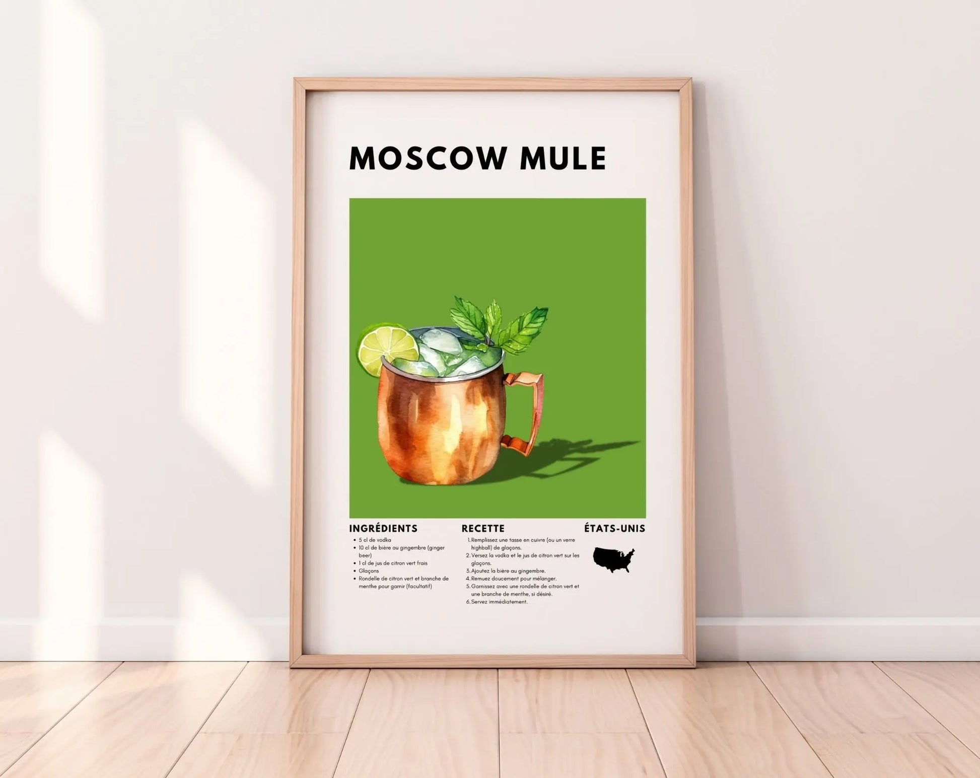 Ajoute une touche fraîche et sophistiquée à ta décoration avec cette affiche décorative "Moscow Mule", mettant en avant la recette du célèbre cocktail à base de vodka, de gingembre et de citron vert. Servi dans sa fameuse tasse en cuivre, le Moscow Mule est un incontournable des cocktails rafraîchissants et épicés. 🧊🍋