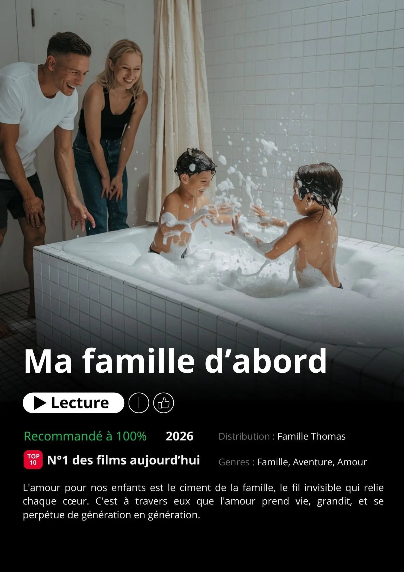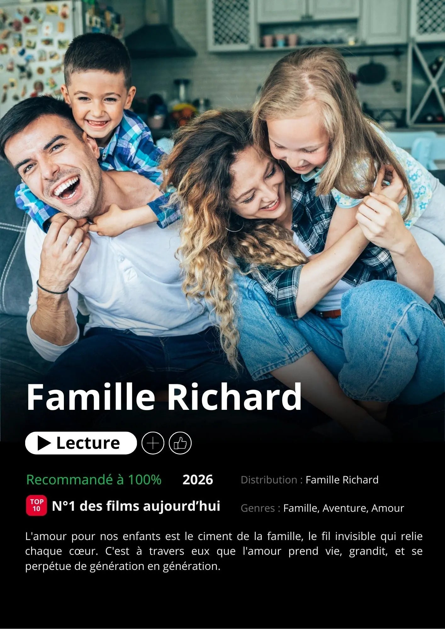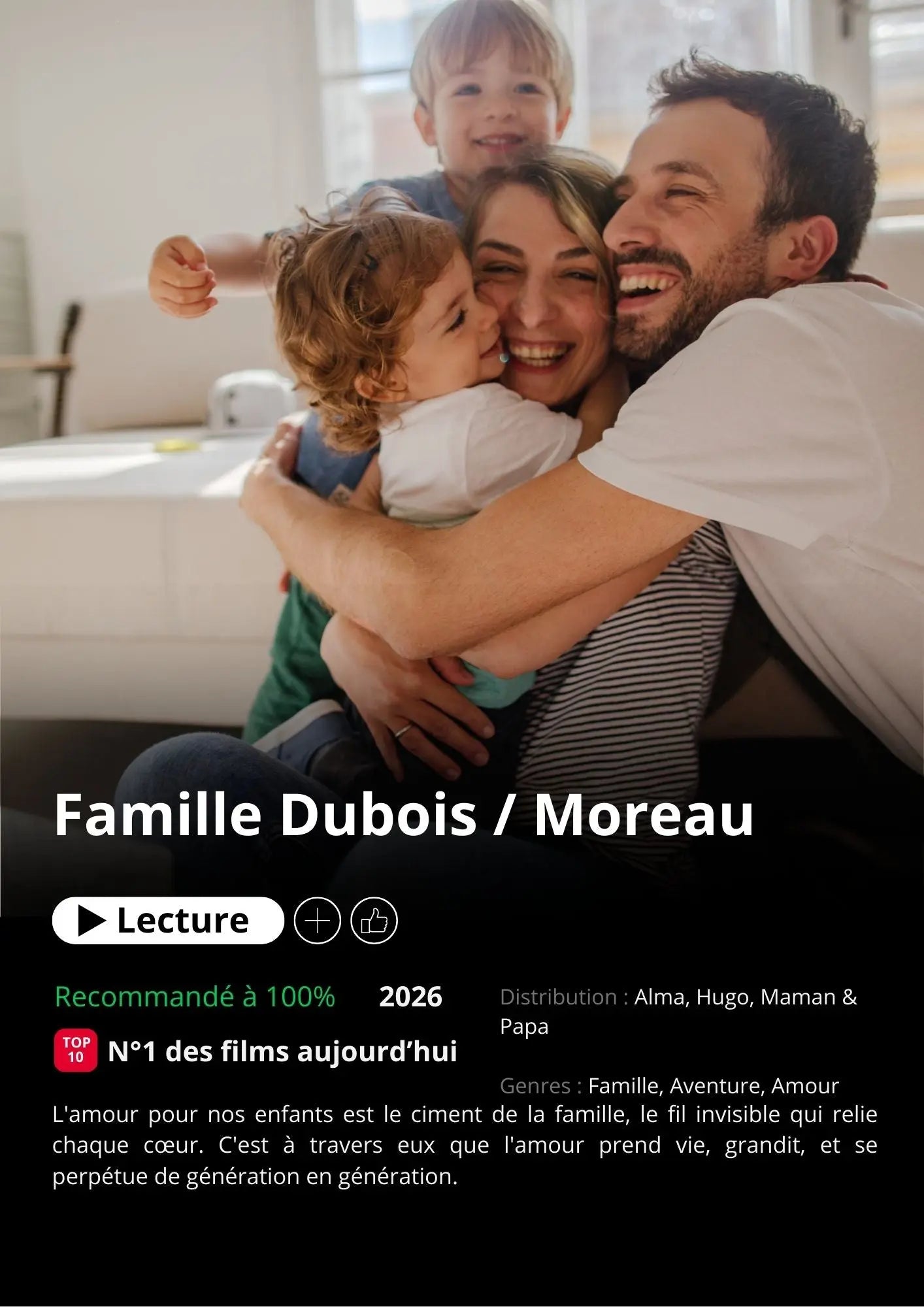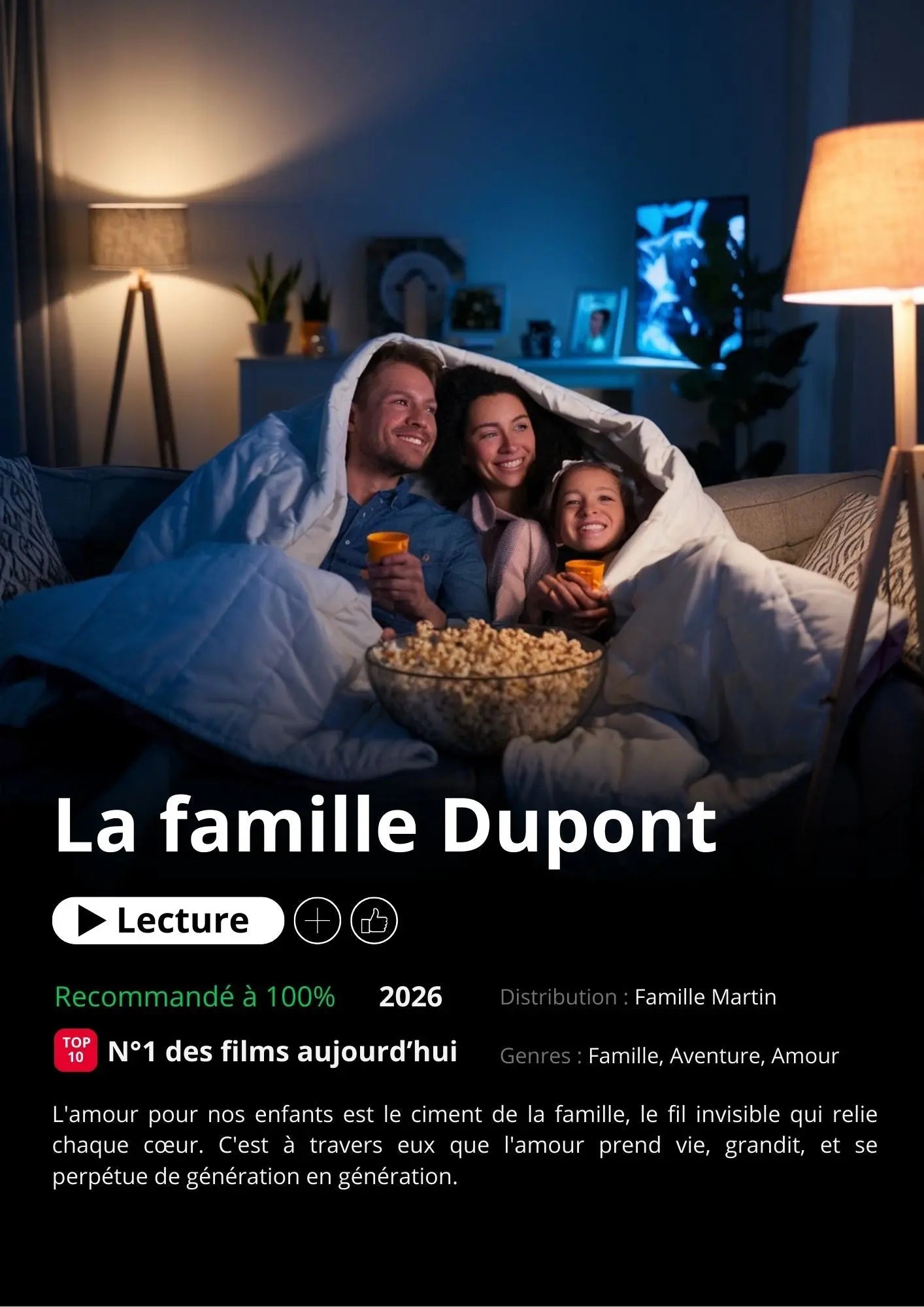 Affiche Netflix famille personnalisée : Une affiche qui met en avant la famille comme les stars d'une série Netflix. Personnalisable avec les noms des membres de la famille et leurs rôles.