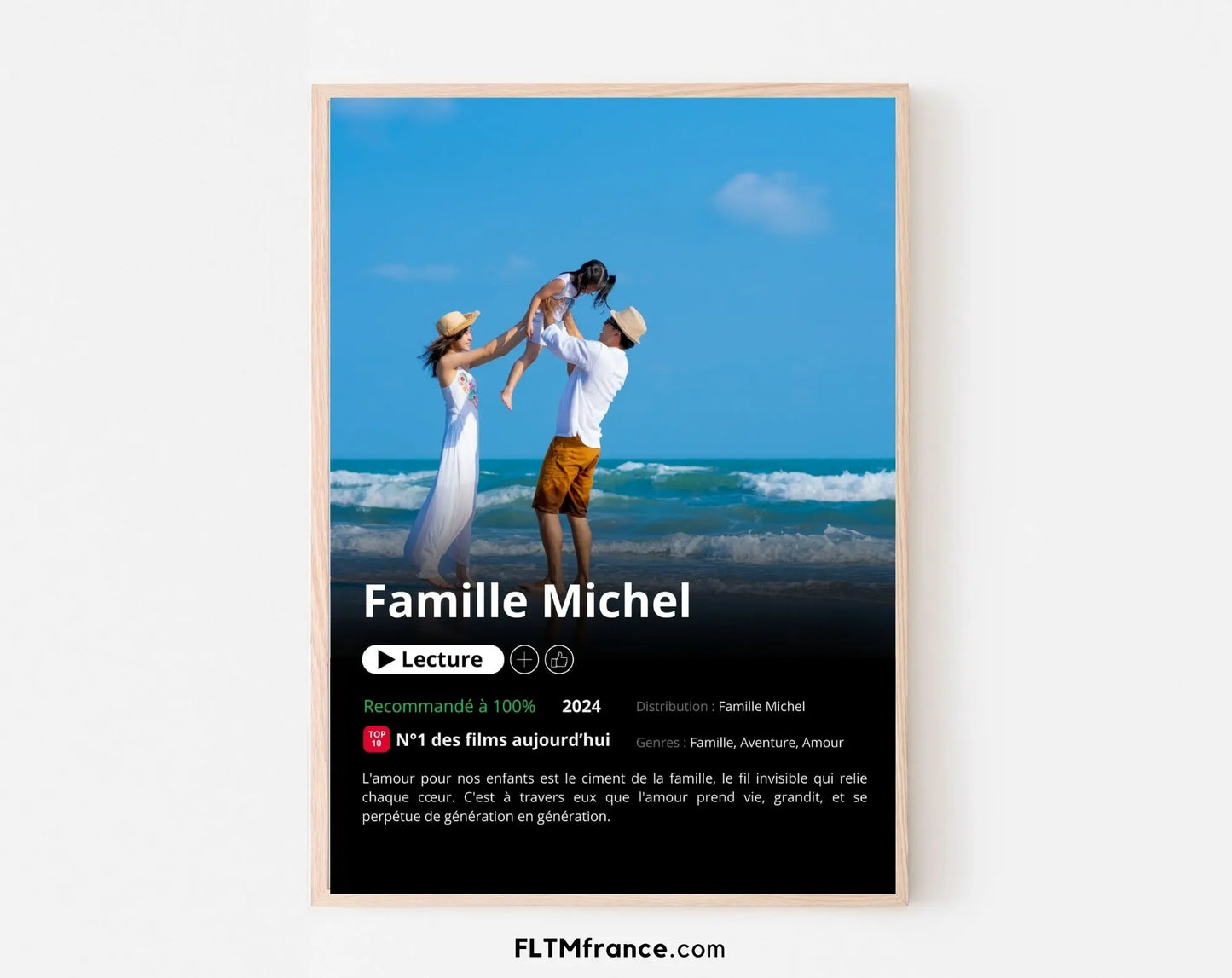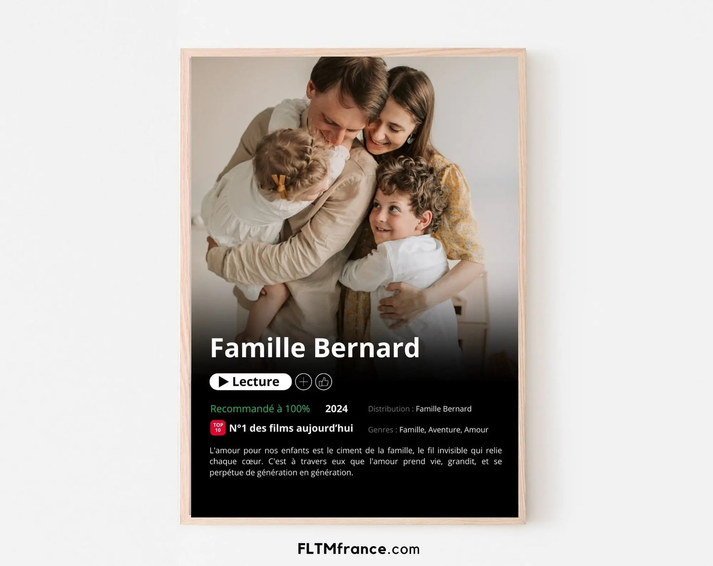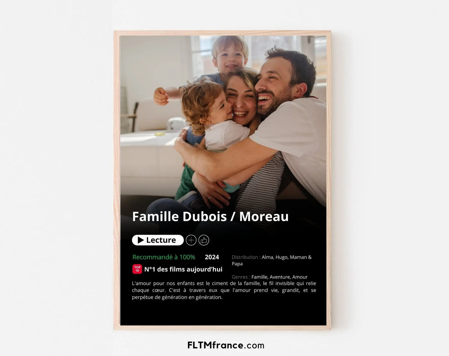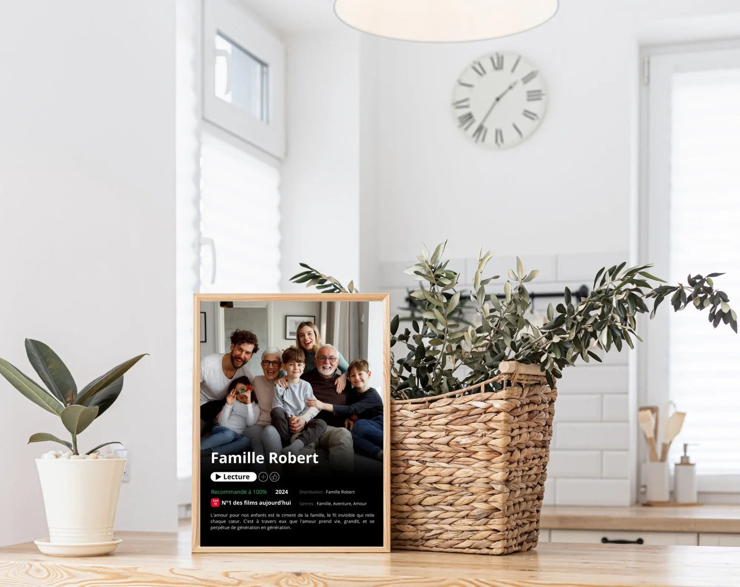 Immortalisez l'esprit de votre famille avec notre Affiche Netflix Famille Personnalisée ! Inspirée des célèbres affiches de films Netflix, cette création unique vous permet de transformer votre famille en protagonistes d’un film familial inoubliable. Que ce soit pour célébrer une occasion spéciale, comme un anniversaire ou une réunion de famille, ou simplement pour orner votre maison d’un souvenir original, cette affiche est le cadeau parfait pour capturer les moments précieux passés ensemble.