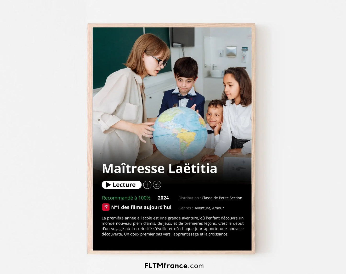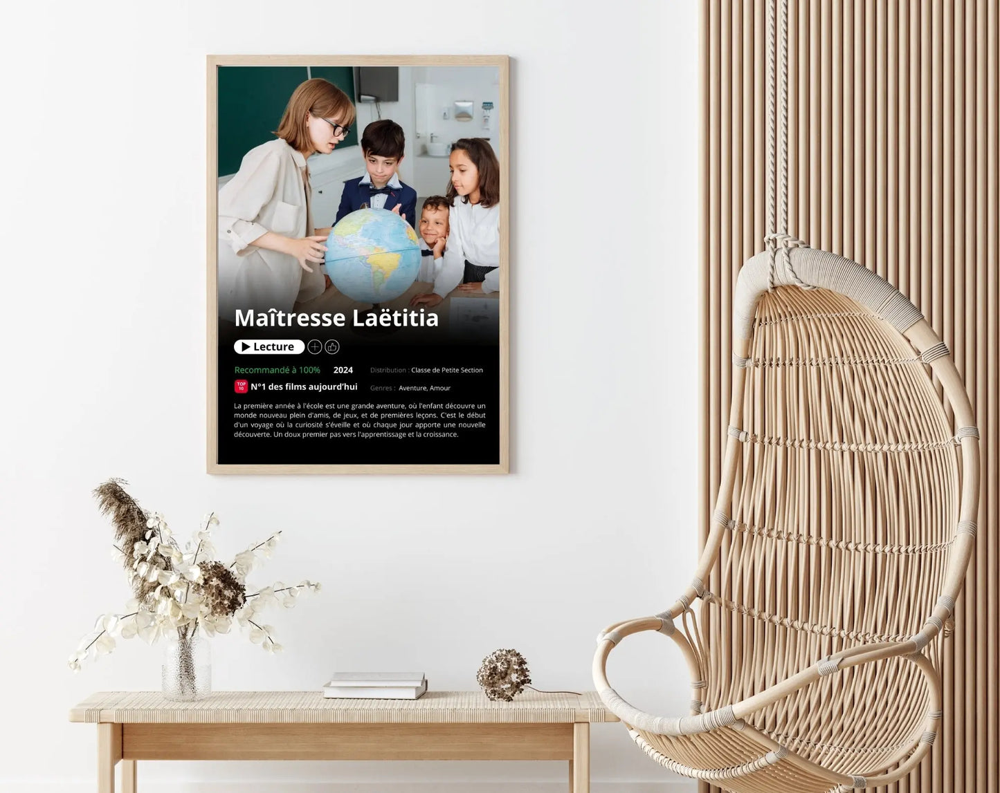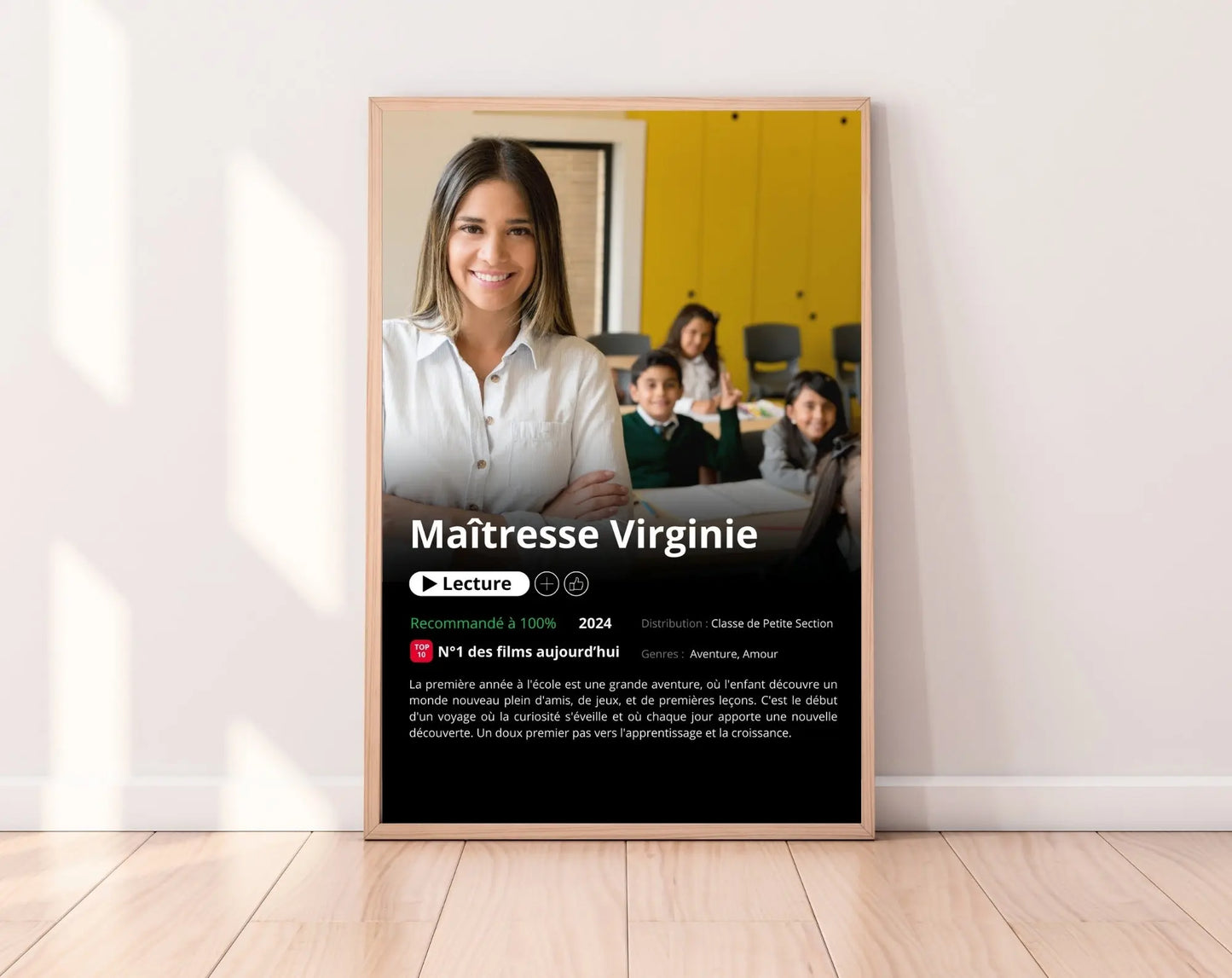 Avec notre Affiche Netflix Maîtresse Personnalisée, vous pouvez transformer la maîtresse de votre enfant en vedette d'un film fictif qui célèbre son engagement et son influence positive. En ajoutant sa photo et en personnalisant les textes, vous créez une affiche unique qui reflète son dévouement, son amour pour l'enseignement, et la place spéciale qu'elle occupe dans la vie de votre enfant. Chaque détail de l'affiche est soigneusement conçu pour ressembler à une véritable affiche de film Netflix, offrant un hommage original et émouvant à la maîtresse.