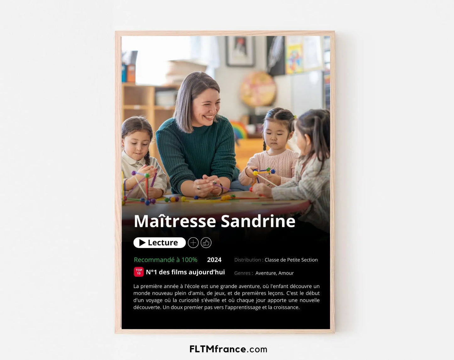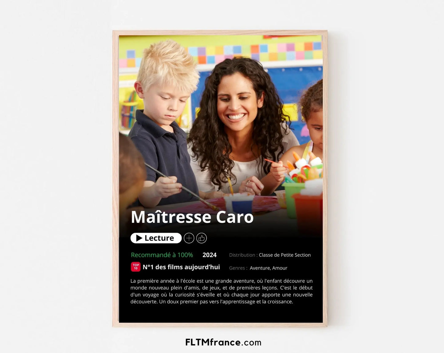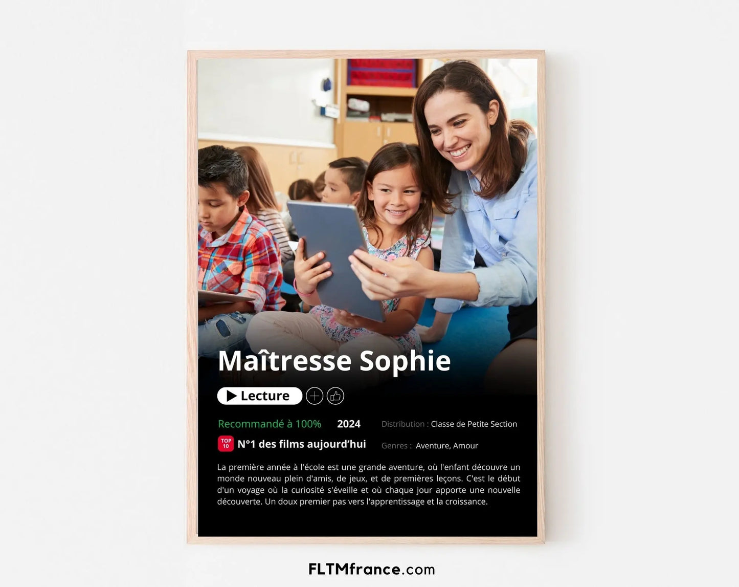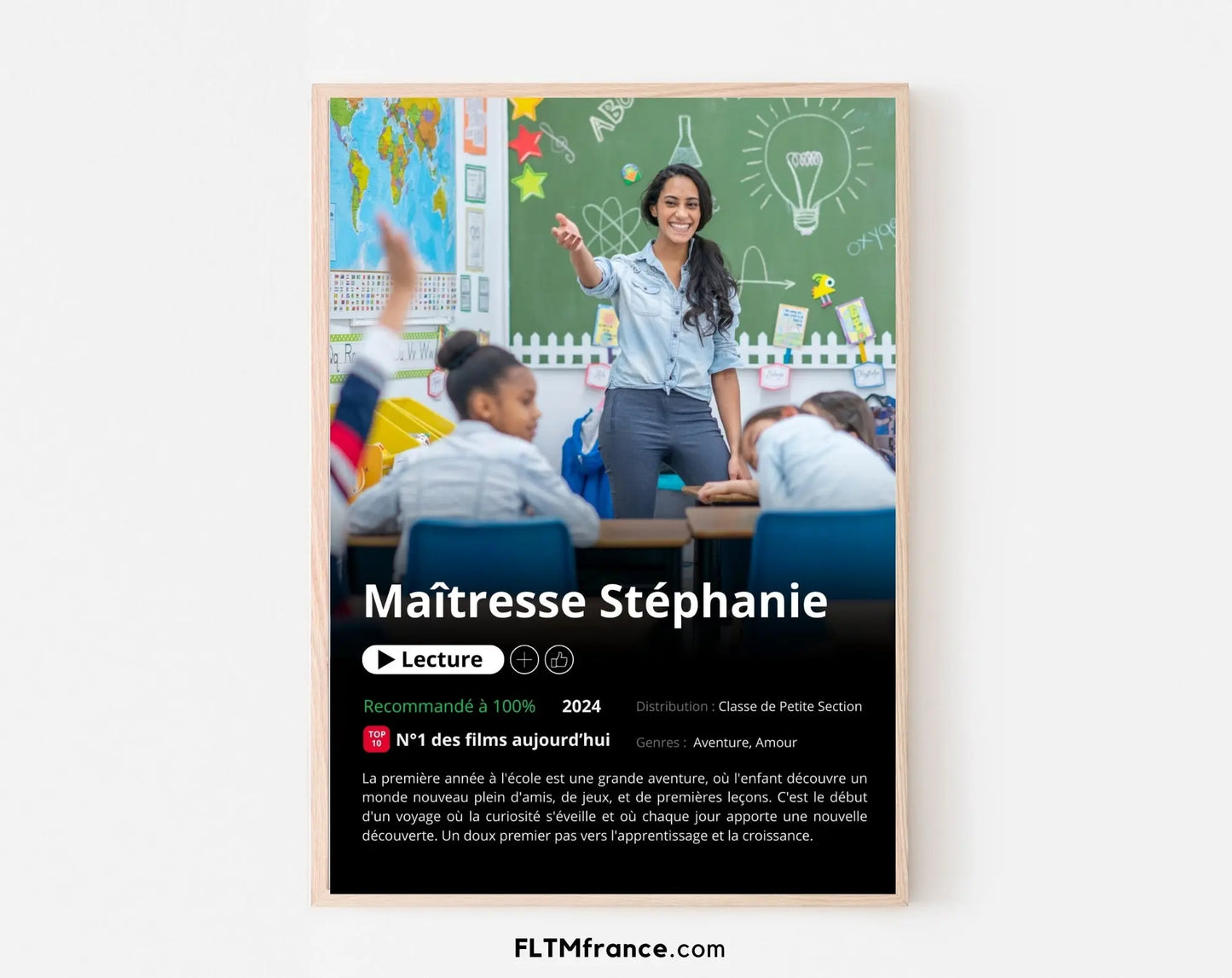 Avec notre Affiche Netflix Maîtresse Personnalisée, vous pouvez transformer la maîtresse de votre enfant en vedette d'un film fictif qui célèbre son engagement et son influence positive. En ajoutant sa photo et en personnalisant les textes, vous créez une affiche unique qui reflète son dévouement, son amour pour l'enseignement, et la place spéciale qu'elle occupe dans la vie de votre enfant. Chaque détail de l'affiche est soigneusement conçu pour ressembler à une véritable affiche de film Netflix, offrant un hommage original et émouvant à la maîtresse.