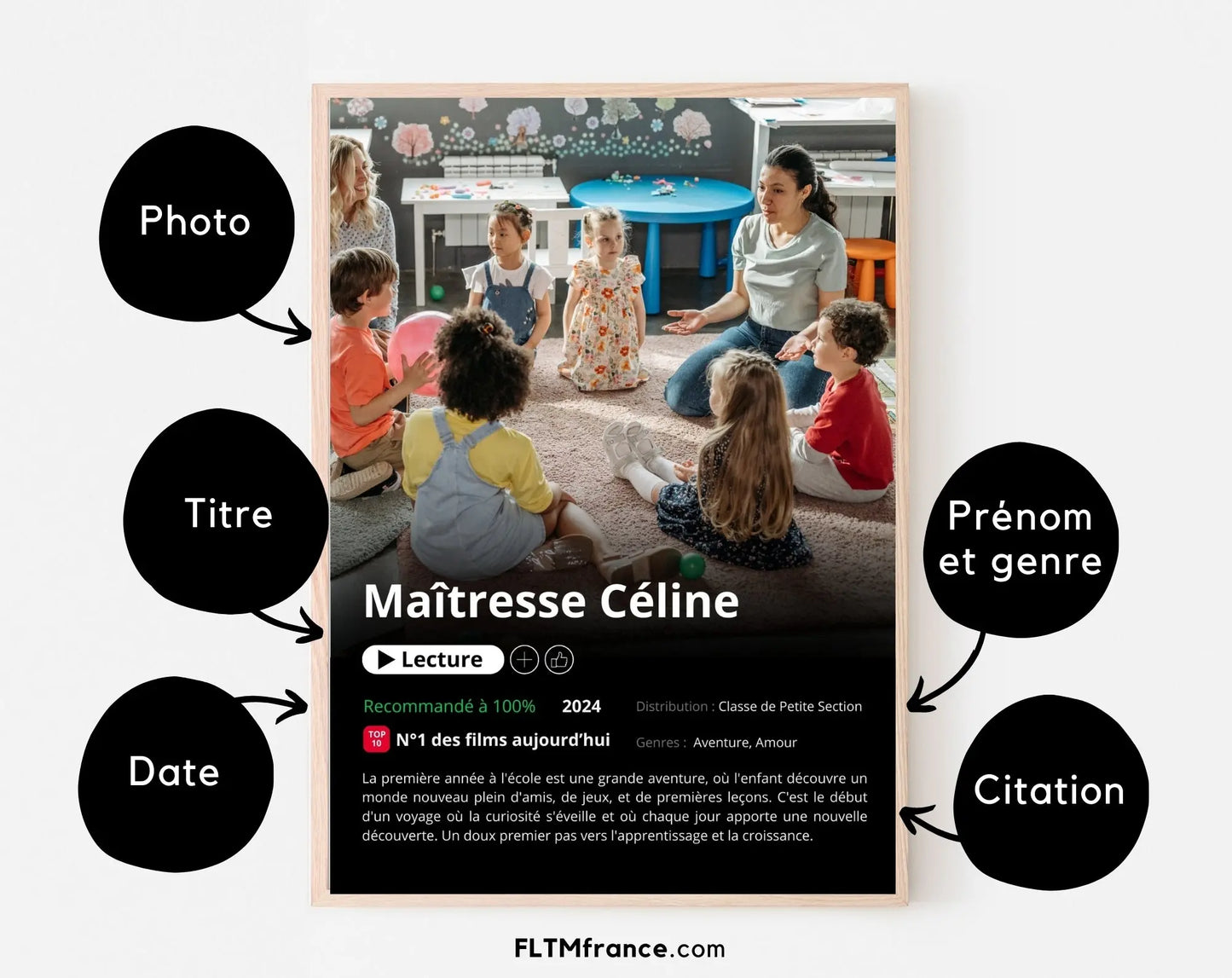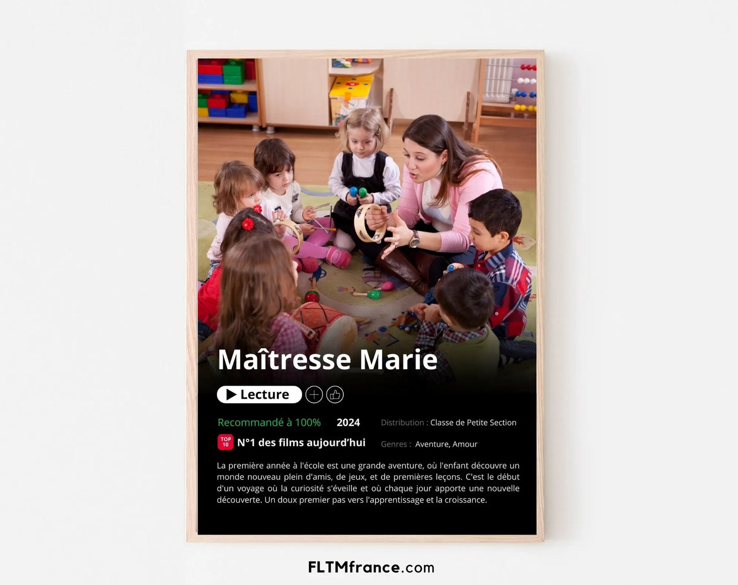 Offrez un cadeau unique et mémorable à la maîtresse de votre enfant avec notre Affiche Netflix Maîtresse Personnalisée ! Inspirée des célèbres affiches de films Netflix, cette création originale permet de rendre hommage à la maîtresse qui a tant contribué à l'éducation et au développement de votre enfant. Que ce soit pour la fin de l'année scolaire, un anniversaire, ou simplement pour lui dire merci, cette affiche est une manière créative et touchante de montrer votre reconnaissance.